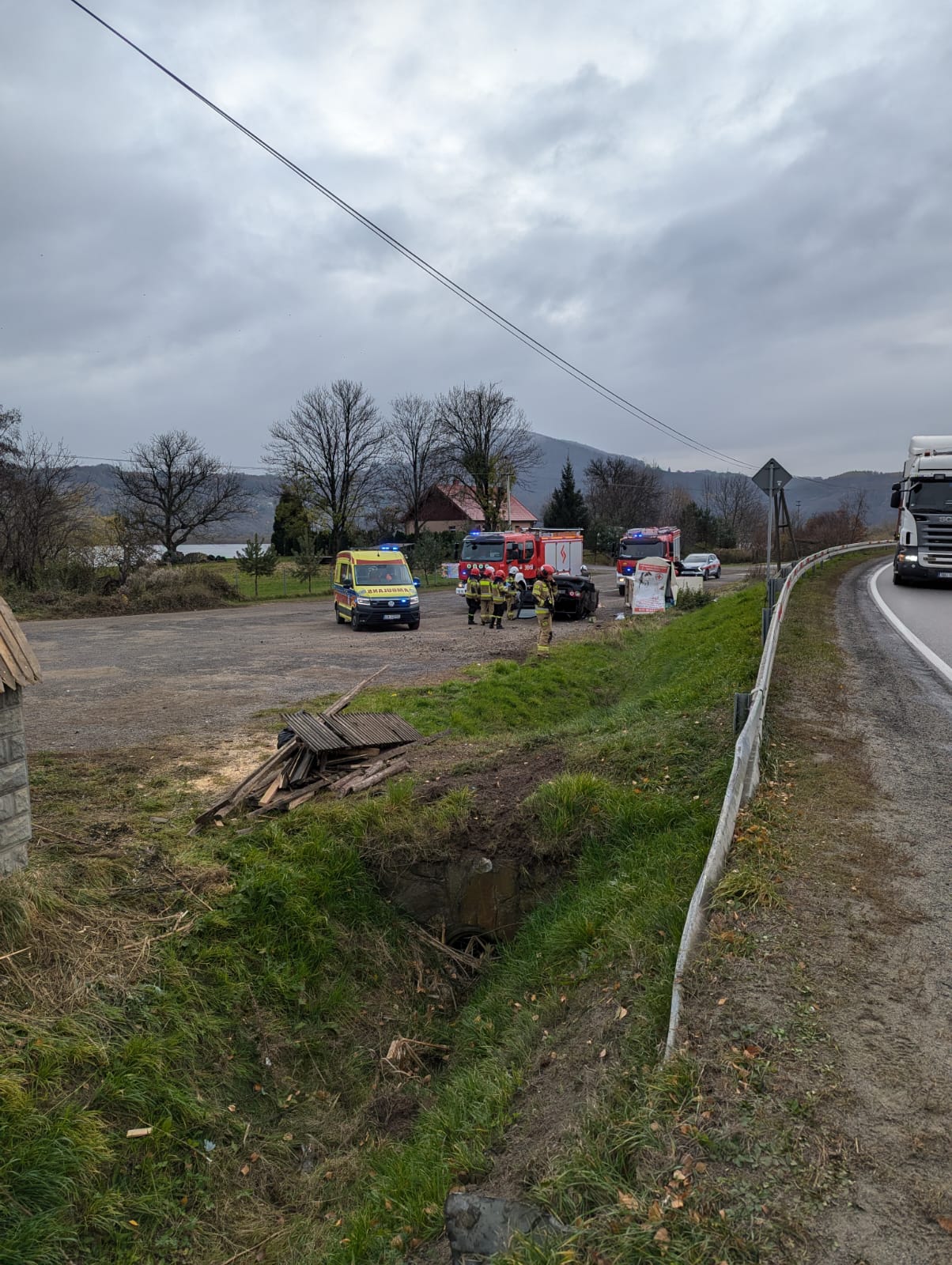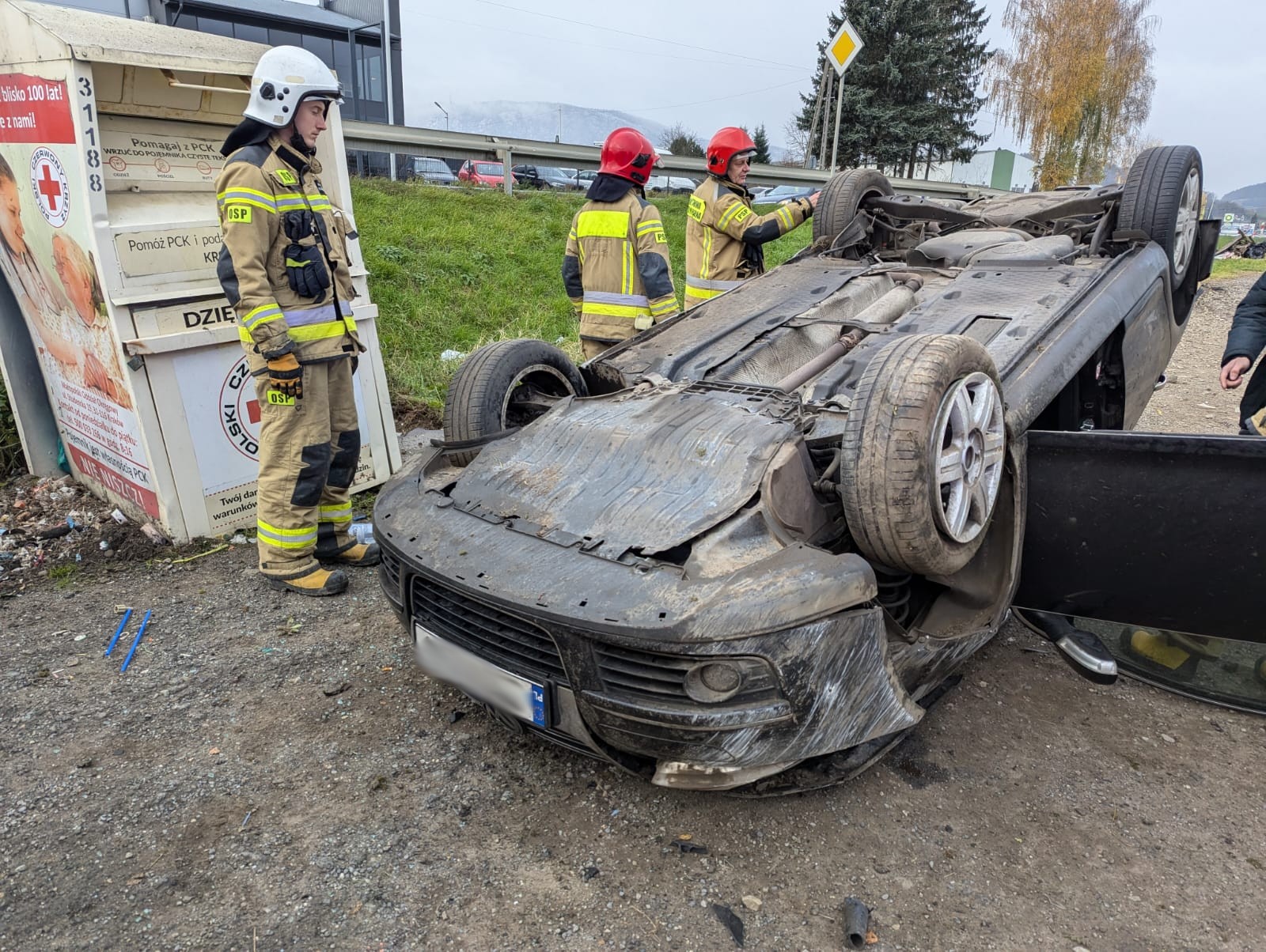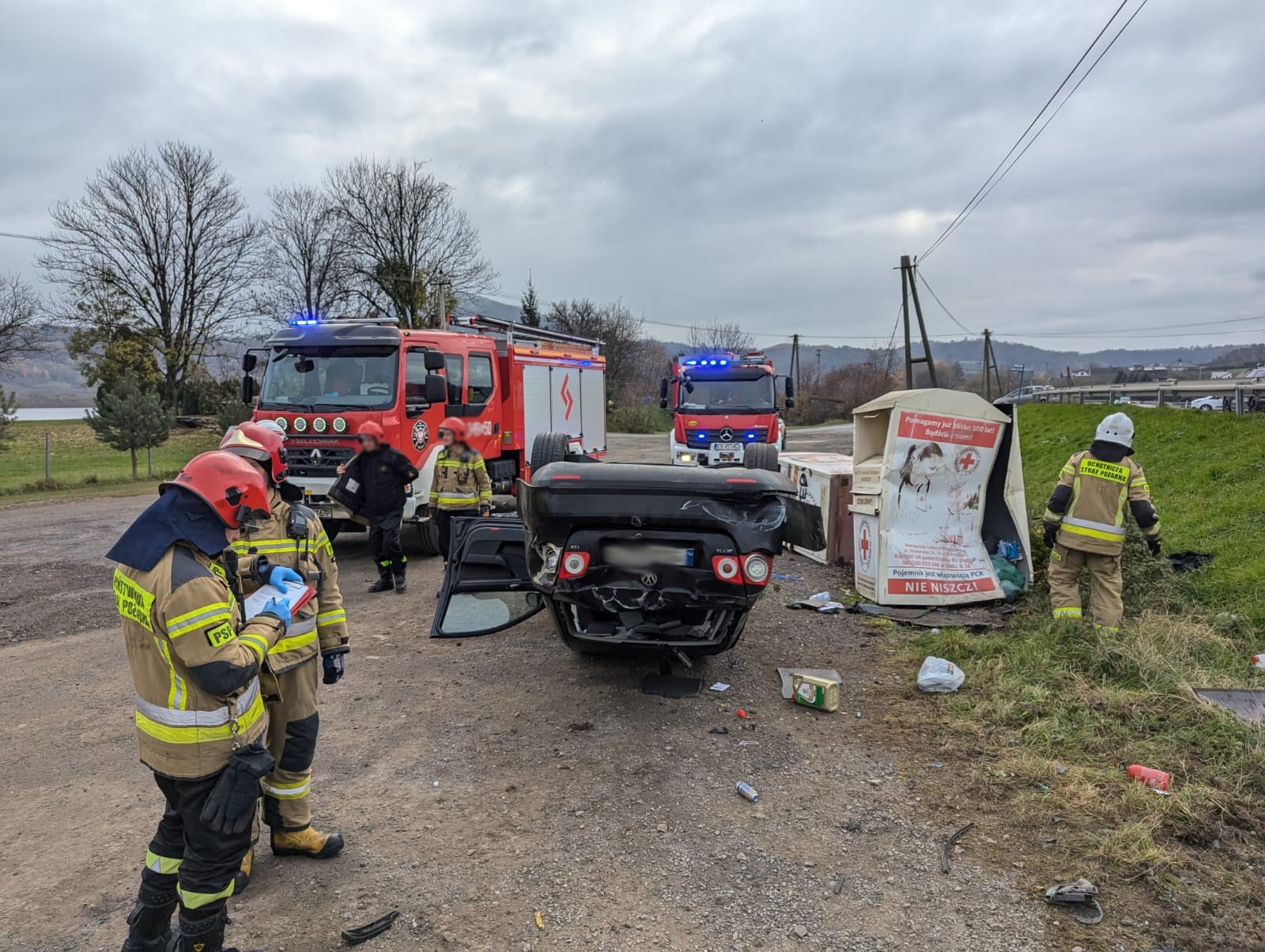 14 listopada o godzinie 8.45 zastępy z JRG nr 1 w Nowym Sączu oraz OSP Tęgoborze zadysponowane zostały do działań w Tęgoborzy. Po przybyciu na miejsce zdarzenia ustalono, że w zdarzeniu brał udział jeden samochód osobowy, którym podróżował sam kierujący. Pojazd znajdował się na dachu, poza obrysem jezdni. Mężczyzna opuścił pojazd o własnych siłach i znajdował się pod opieką ratowników medycznych. Z samochodu nastąpił wyciek płynów eksploatacyjnych. Działania zastępów straży polegały na zabezpieczeniu miejsca zdarzenia oraz przemieszczeniu samochodu na koła przy użyciu wciągarki samochodowej w celu wykonania dostępu do akumulatora. Odłączono instalacje elektryczną w uszkodzonym pojeździe. Substancje ropopochodną zasypano sorbentem. Po przebadaniu uczestniczący w zdarzeniu mężczyzna pozostał na miejscu zdarzenia.