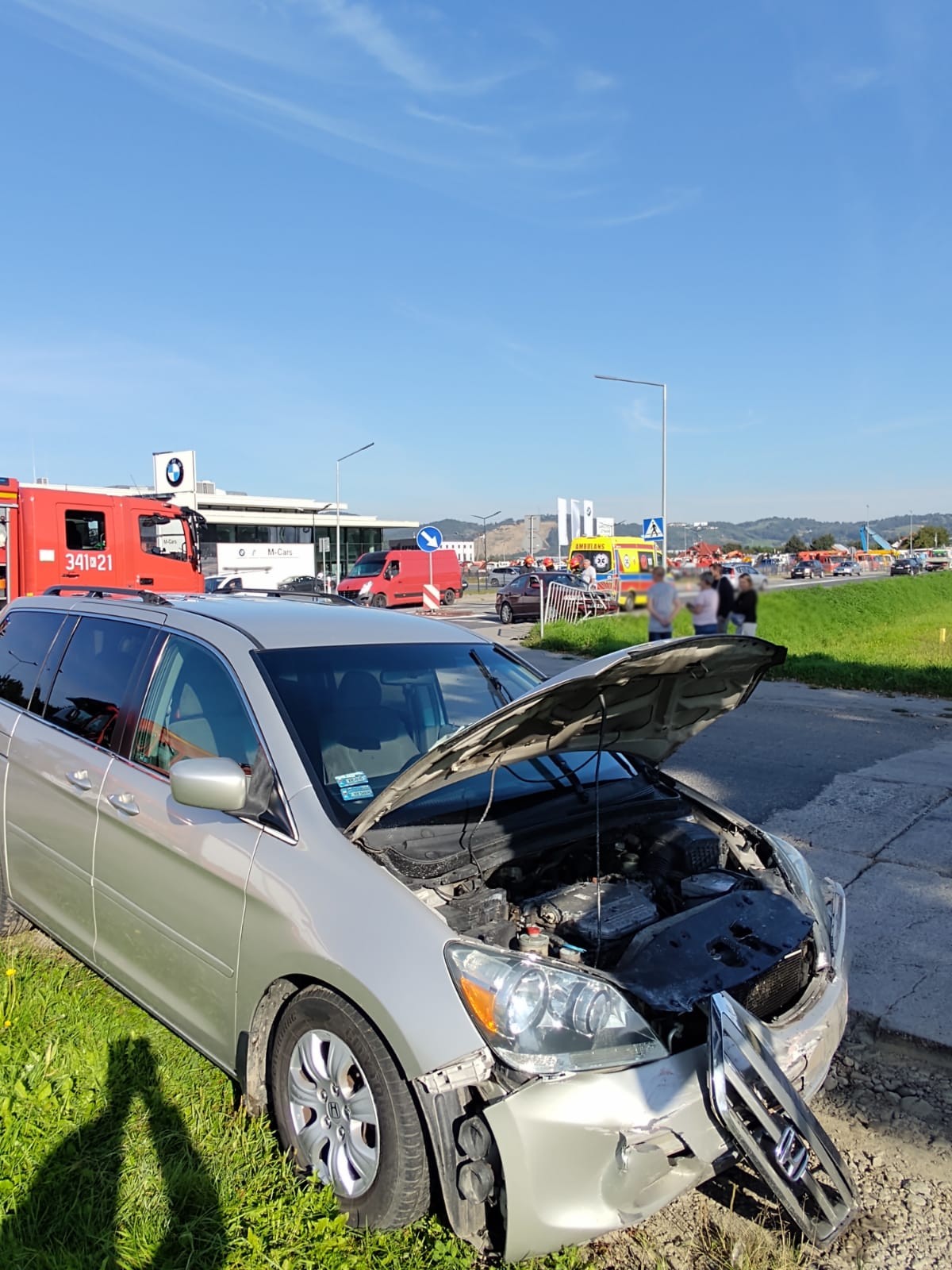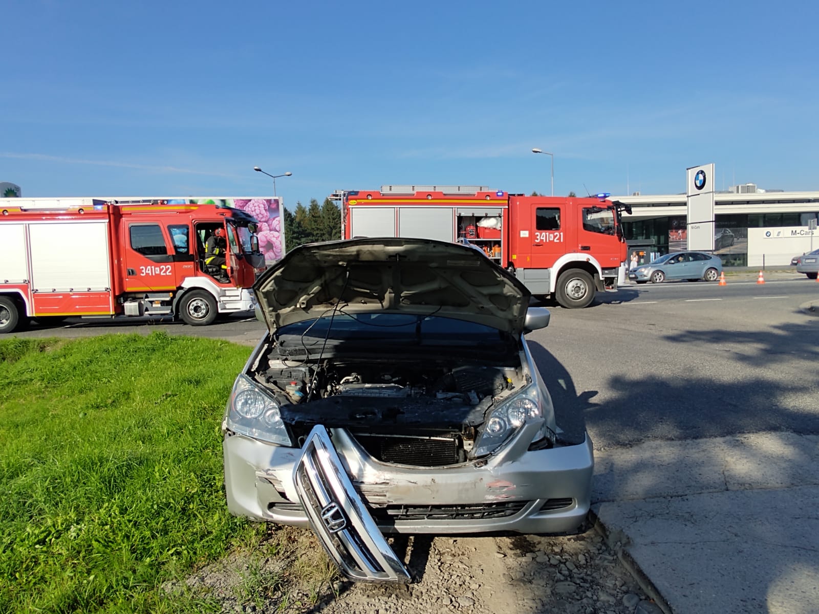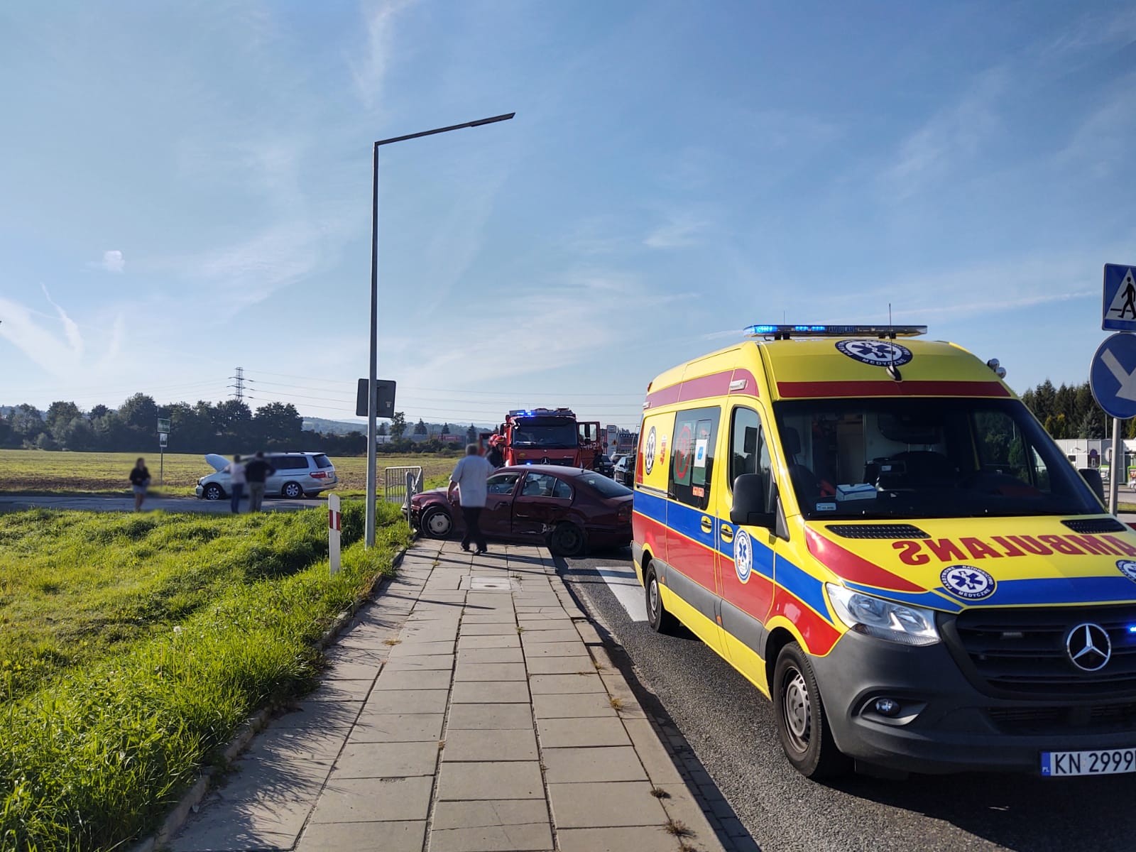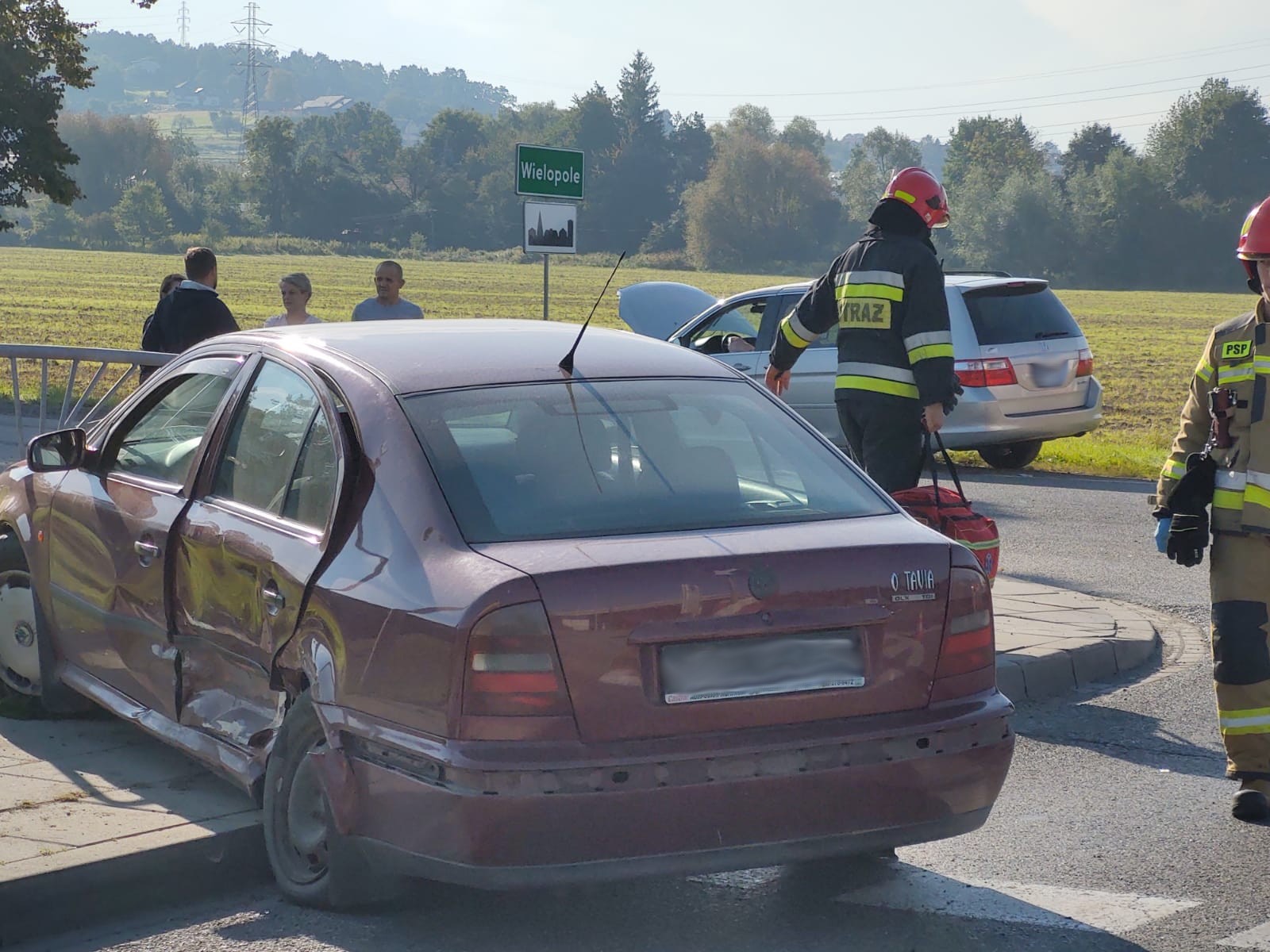 11 września o godzinie 8.45 zastępy z JRG nr 1 w Nowym Sączu zadysponowane zostały do działań w Wielopolu. Po przybyciu na miejsce zdarzenia stwierdzono, że na drodze krajowej 75, doszło do zderzenia samochodów osobowych Skoda oraz Honda. Skoda uderzyła w barierę ochronną rowu przydrożnego i zajmowała część pasa ruchu i chodnik dla pieszych. Honda znajdowała się na poboczu drogi bocznej. Samochodami podróżowało łącznie trzy osoby. Dwie osoby samodzielnie opuściły pojazdy w tym jedna z widocznymi obrażeniami. Natomiast jedna pozostawała w samochodzie. Ruch odbywał się bez utrudnień z wykorzystaniem pasa przeznaczonego do skrętu. Działania strażaków polegały na zabezpieczeniu miejsca zdarzenia, udzieleniu kwalifikowanej pierwszej pomocy osobom poszkodowanym. Rozłączono instalacje elektryczne w pojazdach. Zakręcono zawór butli gazowej w samochodzie Honda. Osoby poszkodowane przekazano przybyłym karetkom Pogotowia ratunkowego. Jedna osoba została przewieziona do szpitala. Działania strażaków trwały ponad godzinę.