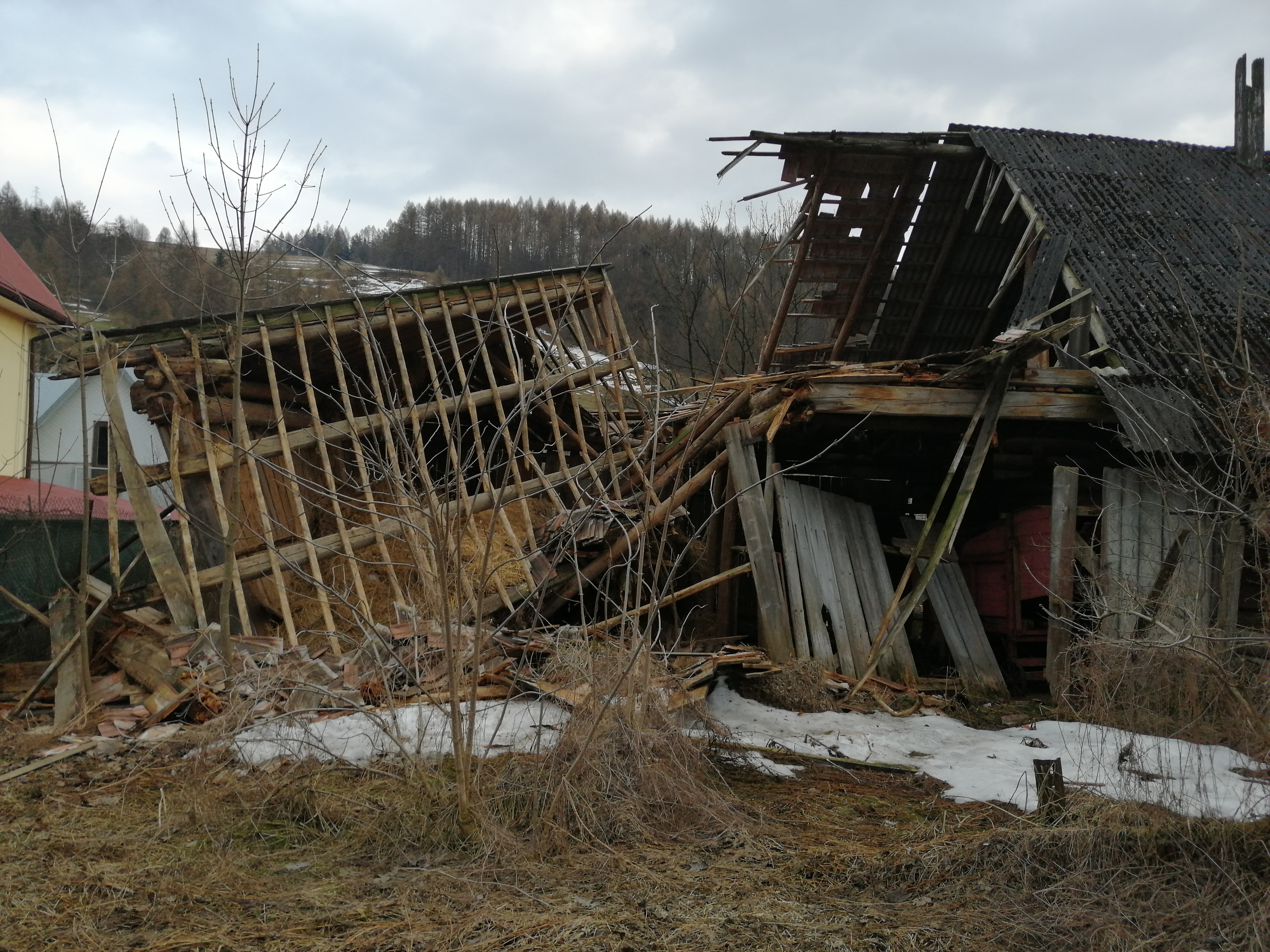 27 marca około godziny 16.46 zastępy z JRG nr 2 w Nowym Sączu oraz OSP Wierchomla Wielka zadysponowane zostały do działań w Wierchomli Wielkiej. Po przybyciu na miejsce zdarzenia ustalono, że doszło do częściowego zawalenia się dachu budynku gospodarczego. Budynek gospodarczy był konstrukcji drewniano-murowanej. W środku budynku nikt nie przebywał. Do zawalenia doszło w drewnianej jego części. Dach zawalił się do środka, natomiast ściana boczna niebezpiecznie odchyliła się w stronę budynku mieszkalnego stanowiąc dla niego zagrożenie. Działania strażaków polegały na zabezpieczeniu miejsca zdarzenia, rozebraniu uszkodzonej konstrukcji dachu oraz ściany bocznej przy użyciu wyciągarki samochodowej z OSP Wierchomla oraz pilarek do drewna. Na miejscu zdarzenia w czasie rozbiórki obecny był współwłaściciel budynku. Następnie cały teren zabezpieczono poprzez otaśmowanie. Na miejsce przybył inspektor nadzoru budowlanego, który po oględzinach budynku udał się do współwłaściciela budynku w celu poinformowania go o dalszych czynnościach. Na tym działania trwające ponad dwie i pół godziny zostały zakończone.