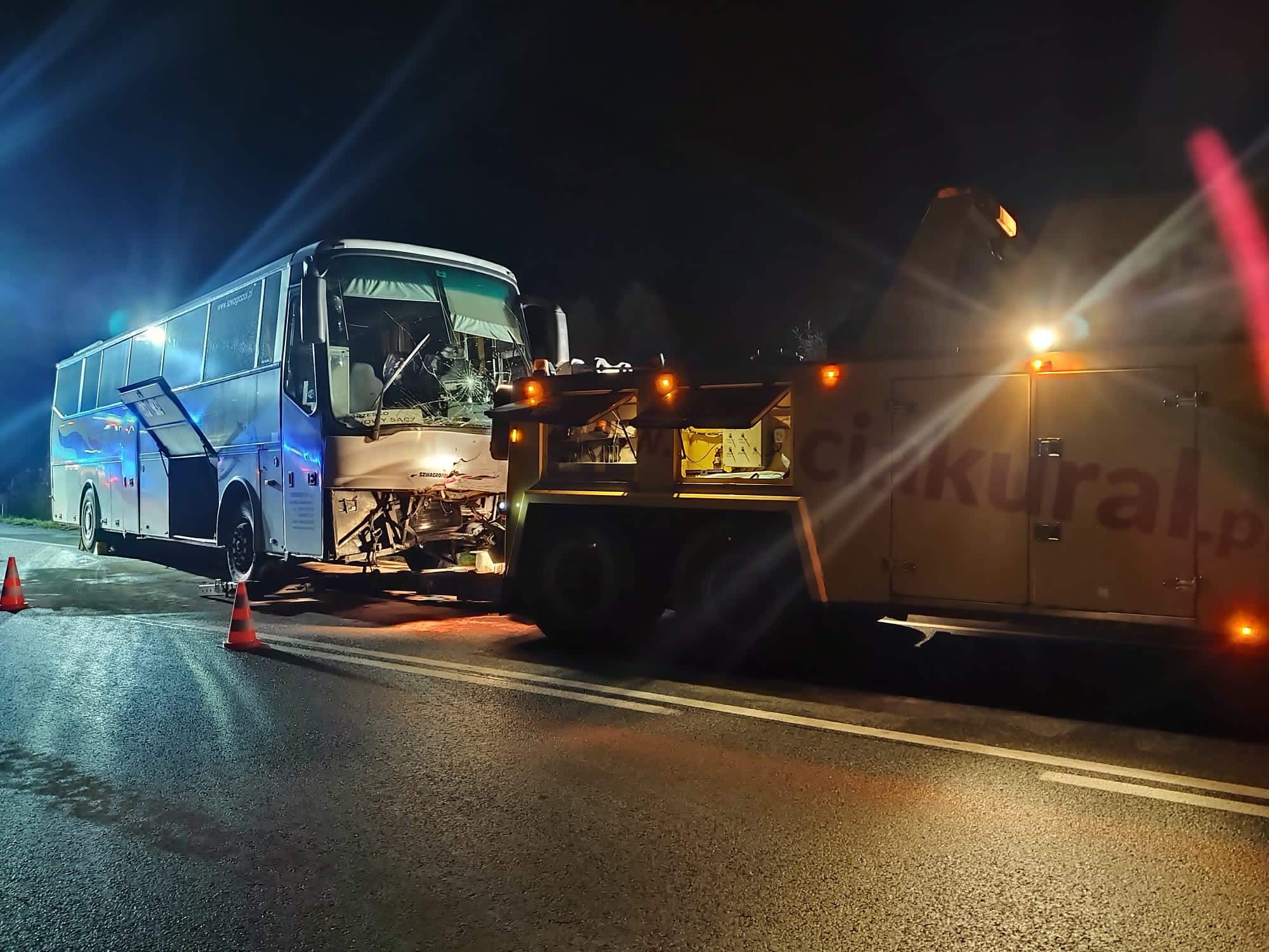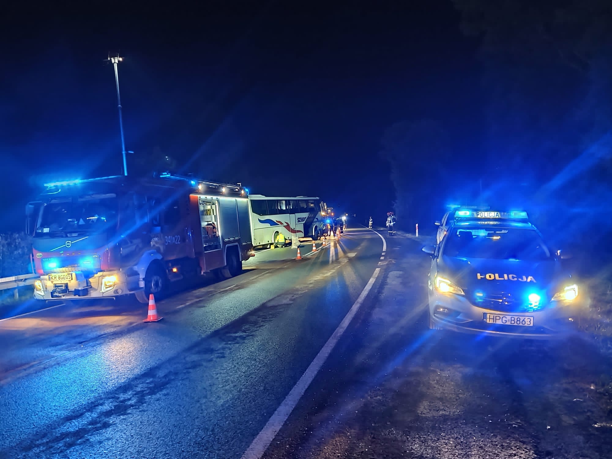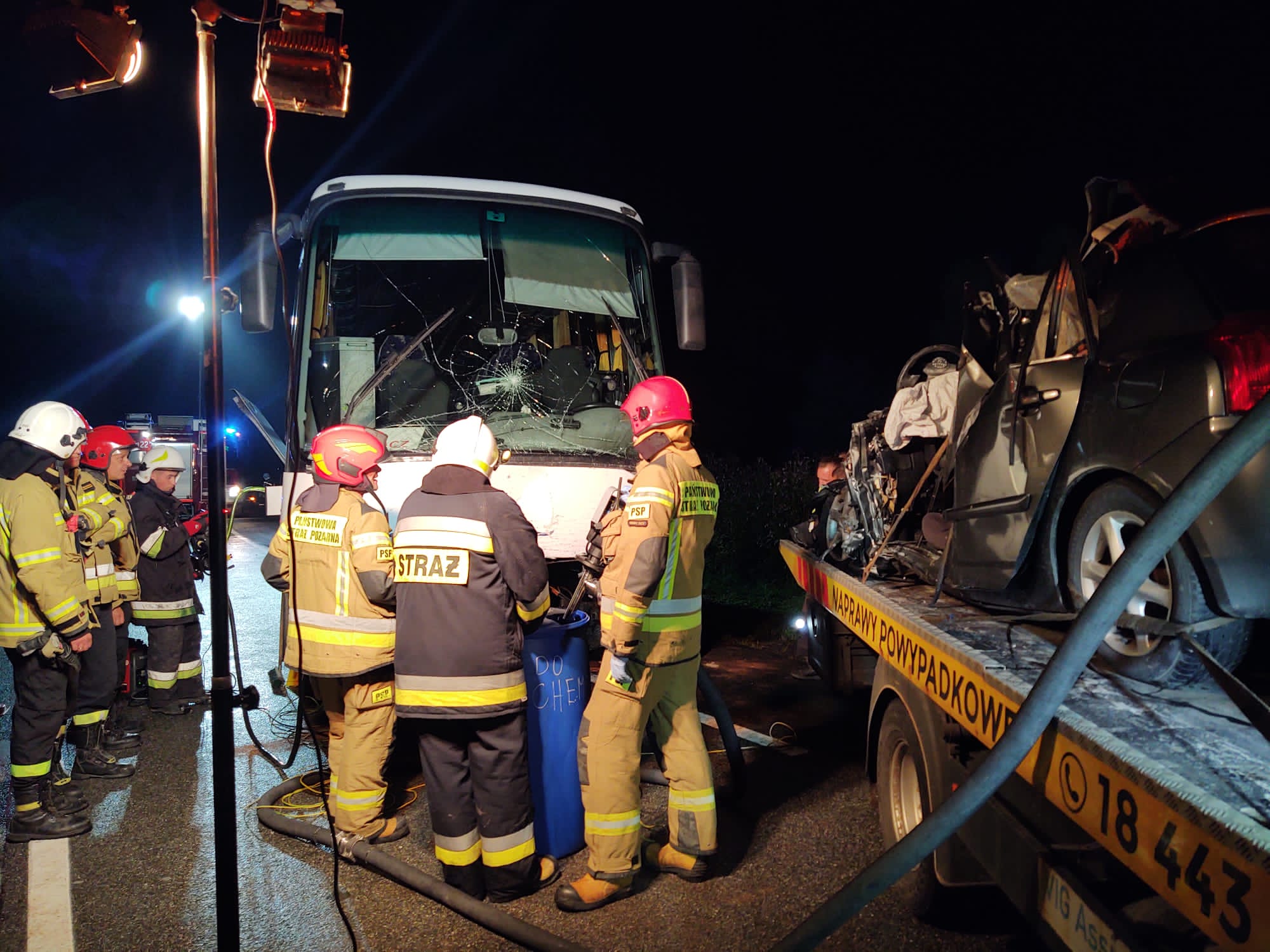 Tragiczny wypadek zderzenia samochodu osobowego z autobusem w którym zginęły dwie osoby a cztery inne zostały przewiezione do szpitala w dniu 26 sierpnia zakończył się działaniami chemiczno-ekologicznymi. Gdyż po przybyciu na miejsce zdarzenia holownika mającego zabrać uszkodzony autobus oraz w trakcie jego przemieszczania doszło do rozszczelnienia się zbiornika paliwa wewnątrz którego było około 700 litrów oleju napędowego. Po zauważeniu i zgłoszeniu tego faktu do stanowiska kierowania Komendanta miejskiego PSP w Nowym Sączu w celu jego likwidacji zadysponowano grupę chemiczno – ekologiczną z JRG nr 1 w Nowym Sączu. Przybyła grupa podjęły działania polegające na wypompowaniu za pomocą pompy beczkowej paliwa ze zbiornika do przygotowanych wcześniej zbiorników zastępczych. Usunięto z jezdni znajdujący się na niej olej napędowy. Doczyszczono drogę ze znajdujących się na niej płynów eksploatacyjnych oraz pozostałości powypadkowych. Strażacy działania zakończyli około godziny 22.43.