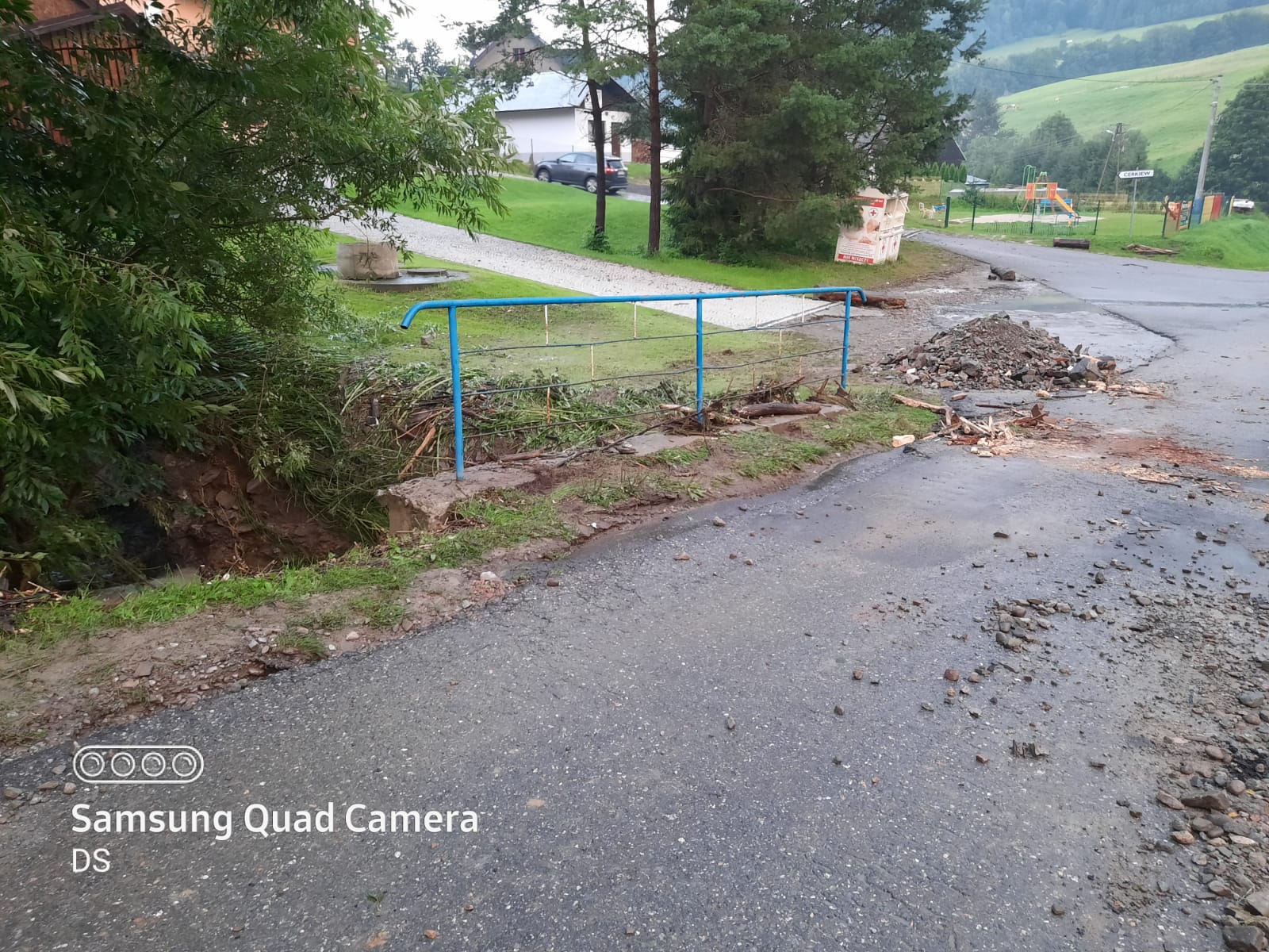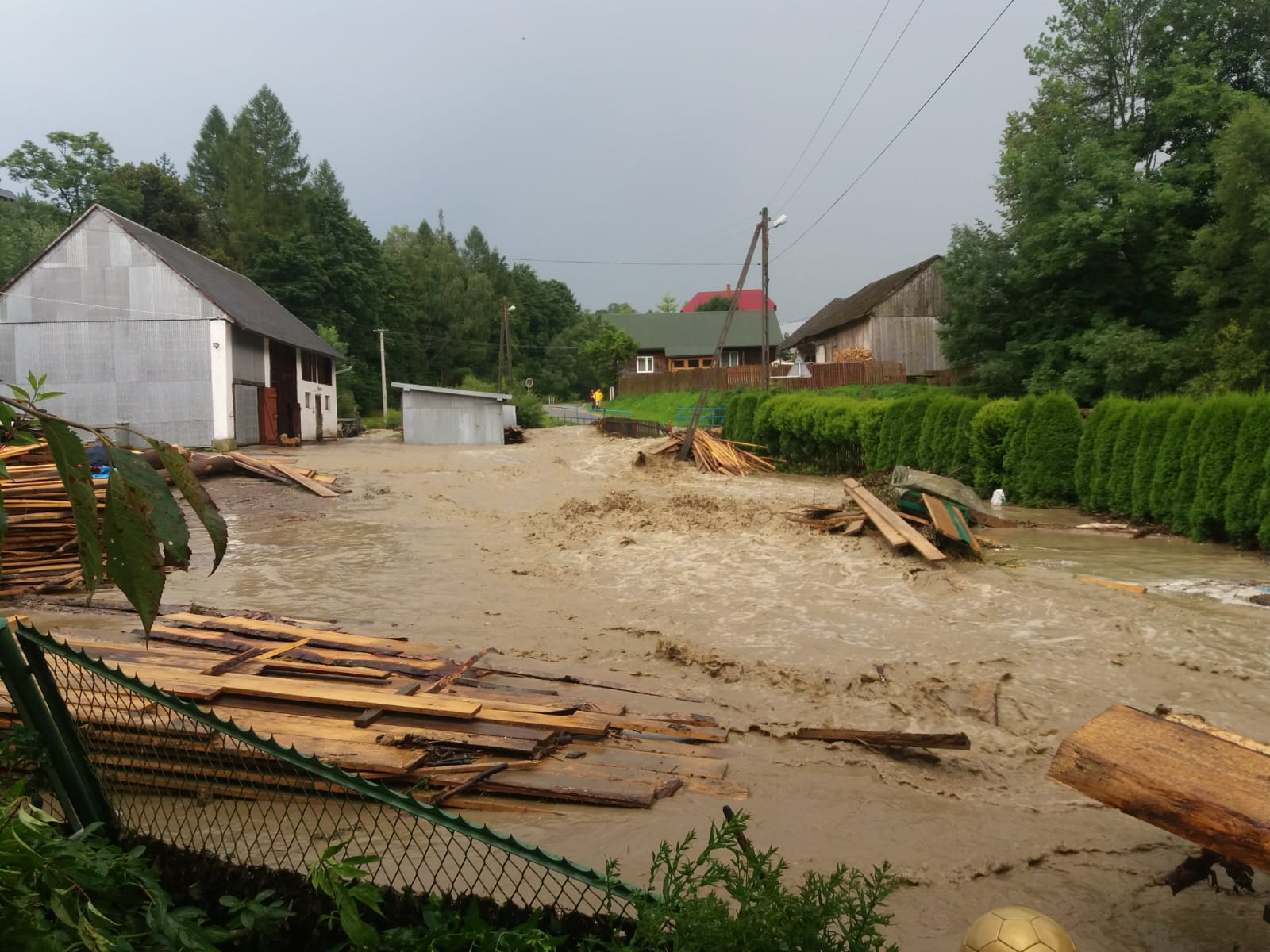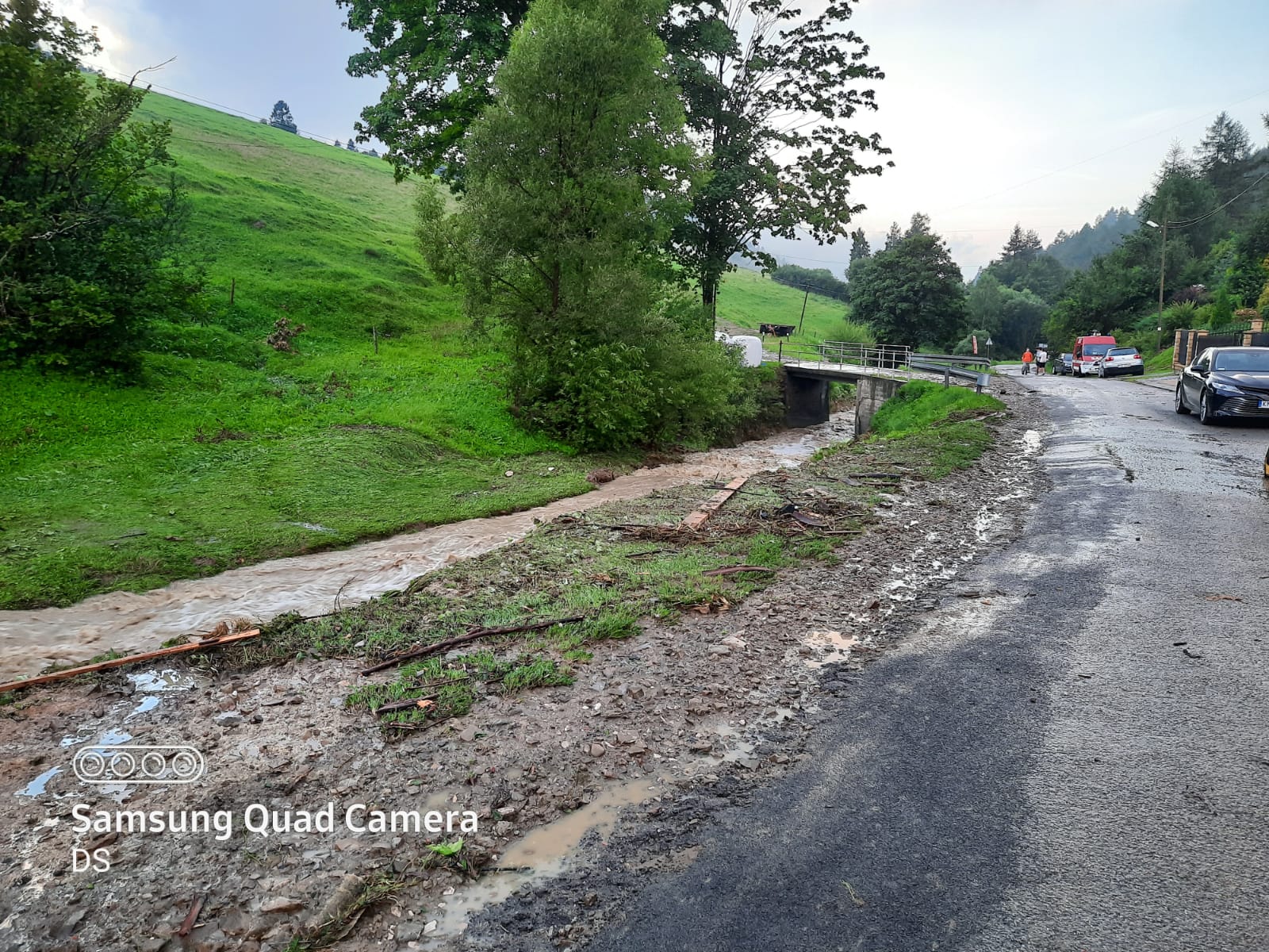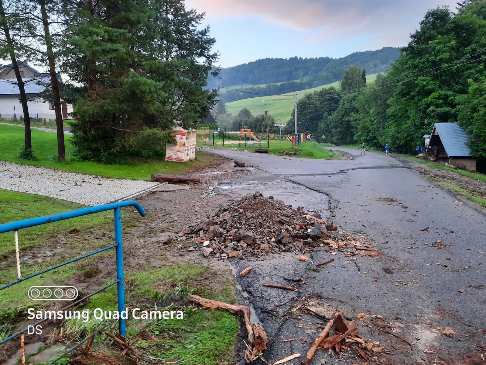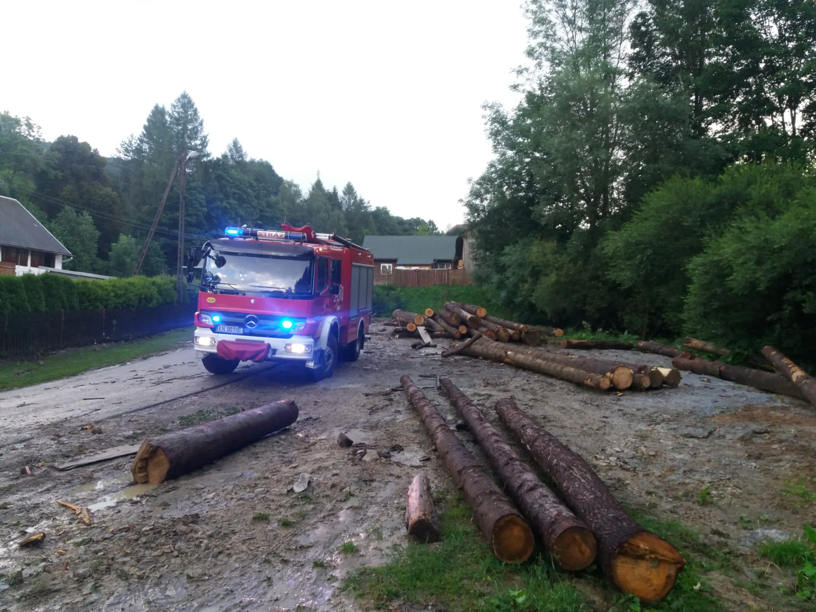 W ostatni weekend przez Sądecczyznę przetoczyły się gwałtowne burze. W niedzielę 15 sierpnia po południu burza z opadami przeszła przez Wojkową w gminie Muszyna. Do działań w tamtym terenie zadysponowano zastępy z JRG w Krynicy Zdroju oraz cztery zastępy OSP. W trakcie dojazdu do miejsca zdarzenia przed miejscowością Wojkowa zastęp PSP usunął blokujące drogę drzewo. Po przyjeździe na miejsce zdarzenia ustalono, że wskutek gwałtownych opadów wezbrała woda "Wojkowskiego Potoku". Potok wystąpił z koryta zalał drogę gminną oraz posesje w miejscowości. Przepusty zostały zatkane nanoszonymi przez wodę materiałami. Droga w miejscowości zablokowana była pniami drzew oraz innymi materiałami. Woda gwałtownym strumieniem przelewała się przez jezdnię. Istniało niebezpieczeństwo, że droga była podmyta. Woda zalewała budynki gospodarcze oraz garaże typu blaszak. Na miejscu zdarzenia był Burmistrz Miasta i Gminy Muszyna, który przekazał informację, że będzie dysponował na miejsce zdarzenia koparkę oraz inny potrzebny sprzęt. W miejscowości brak zasięgu telefonii komórkowej a łączność stacjonarna była niemożliwa z powodu przerwy w dostawie prądu elektrycznego. Działania strażaków polegały na zabezpieczeniu miejsca zdarzenia, próbie udrożnienia przepustu pod drogą, które zakończone zostało niepowodzeniem gdyż potrzebny był ciężki sprzęt. W innym miejscu stwierdzono podmycie drogi dojazdowej przed miejscowością na odcinku około 500 m. Strażacy zabezpieczyli go przy użyciu pachołków oraz taśmy ostrzegawczej. W dalszej części działania polegały na przecięciu kłód drzewa blokujących przejazd i przemieszczeniu ich na pobocze. Wraz z okolicznymi mieszkańcami usuwano naniesione przez wodę materiały blokujące przejazd. Koparka udrażniała przepusty. Woda uszkodziła podjazdy do budynków.Zastępy OSP udrażniały przepusty pod podjazdami do posesji oraz usuwały z drogi naniesione przez wodę materiały. Po udrożnieniu zatkanych przepustów, operator koparki interwencyjnie wykonał pogłębienie koryta rzeki gdzie woda wypływała na jezdnię. Działania kilkudziesięciu strażaków trwały ponad trzy godziny. W sobotę 14 sierpnia burze z gwałtownymi ulewami przeszły w okolicach Tęgoborzy oraz Siennej.