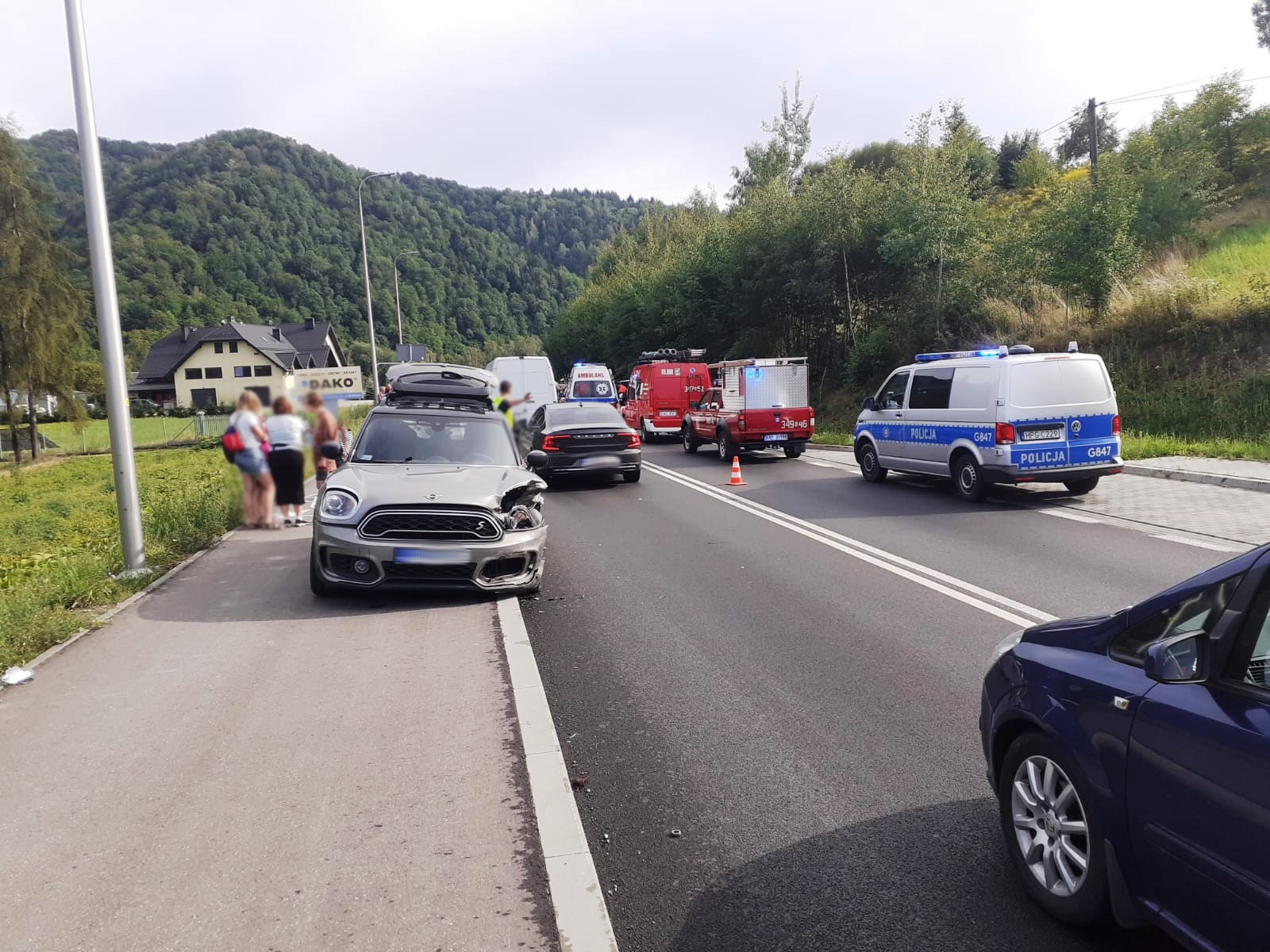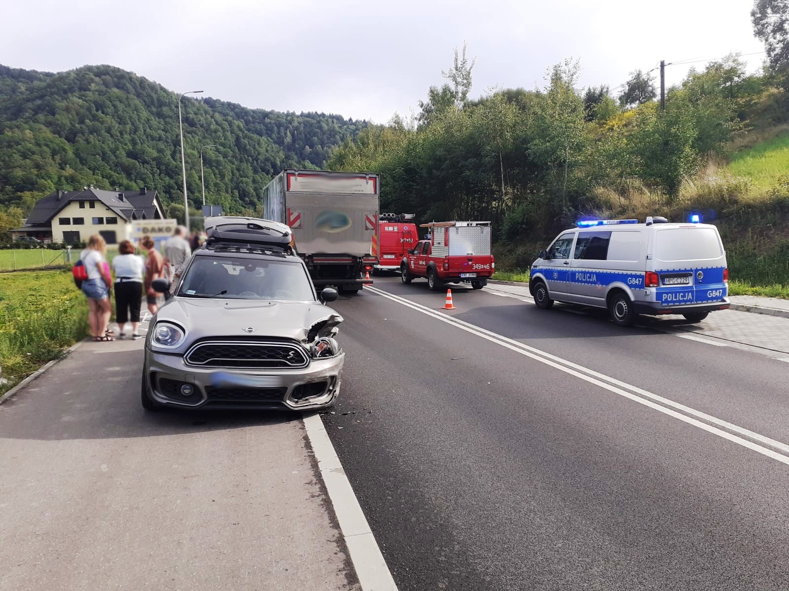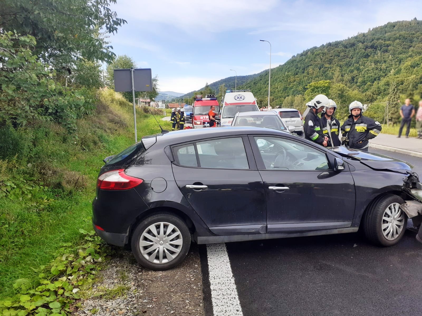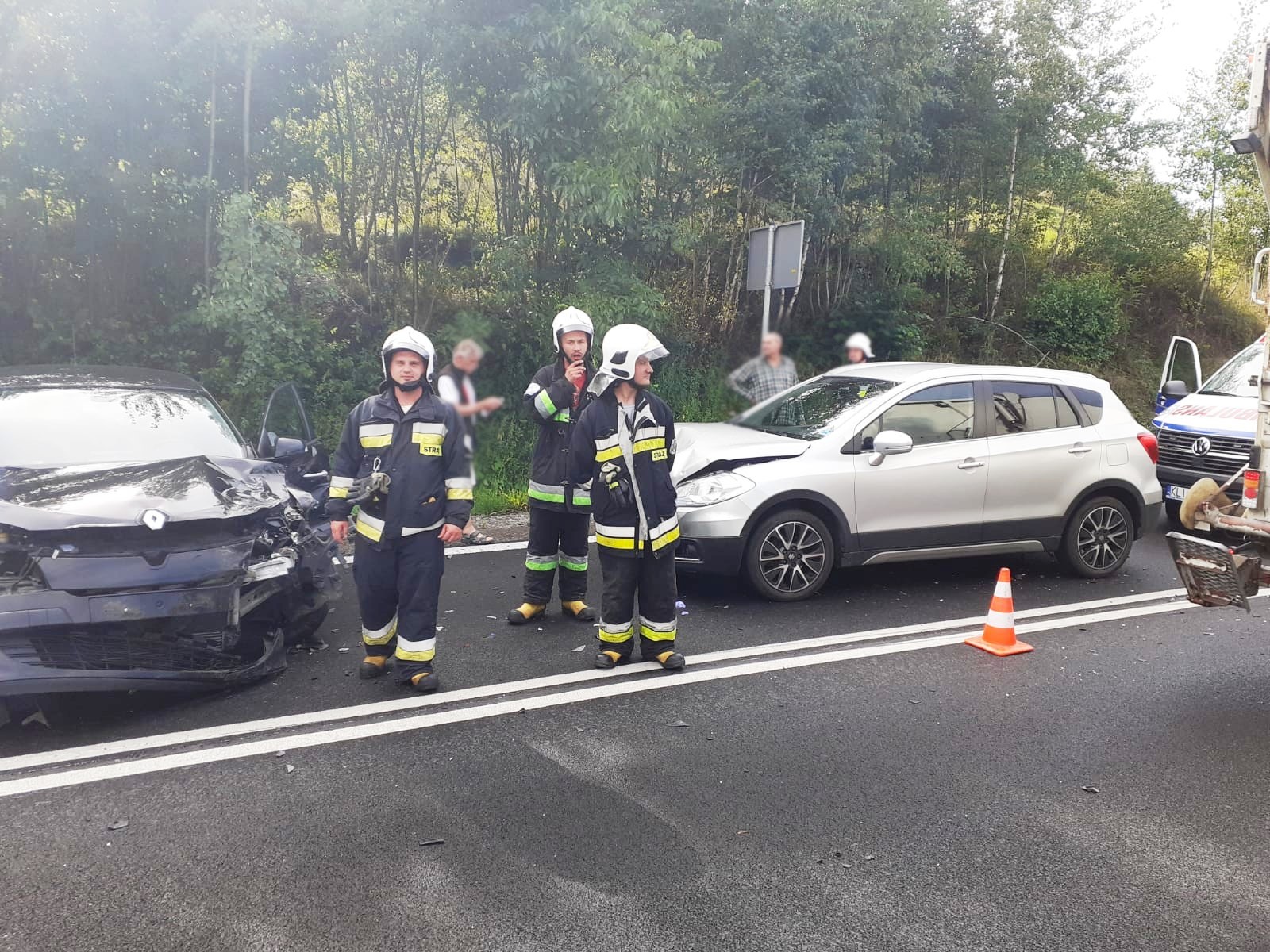 11 sierpnia o godzinie 16.09 zastępy z JRG nr 2 w Nowym Sączu, OSP Zabrzeż oraz OSP Czerniec zadysponowane zostały do działań w Zabrzeży. Po przybyciu na miejsce zdarzenia ustalono, że doszło do kolizji trzech samochodów osobowych (Renault Megane, Mini Cooper S oraz Suzuki SX4 S-Cross), którymi podróżowało łącznie osiem osób, w tym dwoje dzieci. W chwili przybycia zastępów straży pożarnej wszyscy podróżujący znajdowali się poza pojazdami. Pasażerka jednego samochodu uskarżała się na dolegliwości bólowe. Osobie tej udzielono pomocy. Osoba poszkodowana została przebadana przez przybyłą na miejsce załogę karetki Pogotowia ratunkowego. Po przebadaniu przez ratowników medycznych, kobieta pozostała na miejscu zdarzenia. Strażacy dokonali odłączenia klem akumulatorów w pojazdach oraz sorpcji rozlanych płynów eksploatacyjnych sorbentem. Pojazdy uczestniczące w zdarzeniu zostały zabrane przez Pomoc Drogową. Usunięto pozostałości powypadkowe z jezdni. Działania Straży Pożarnej trwały ponad dwie godziny.
