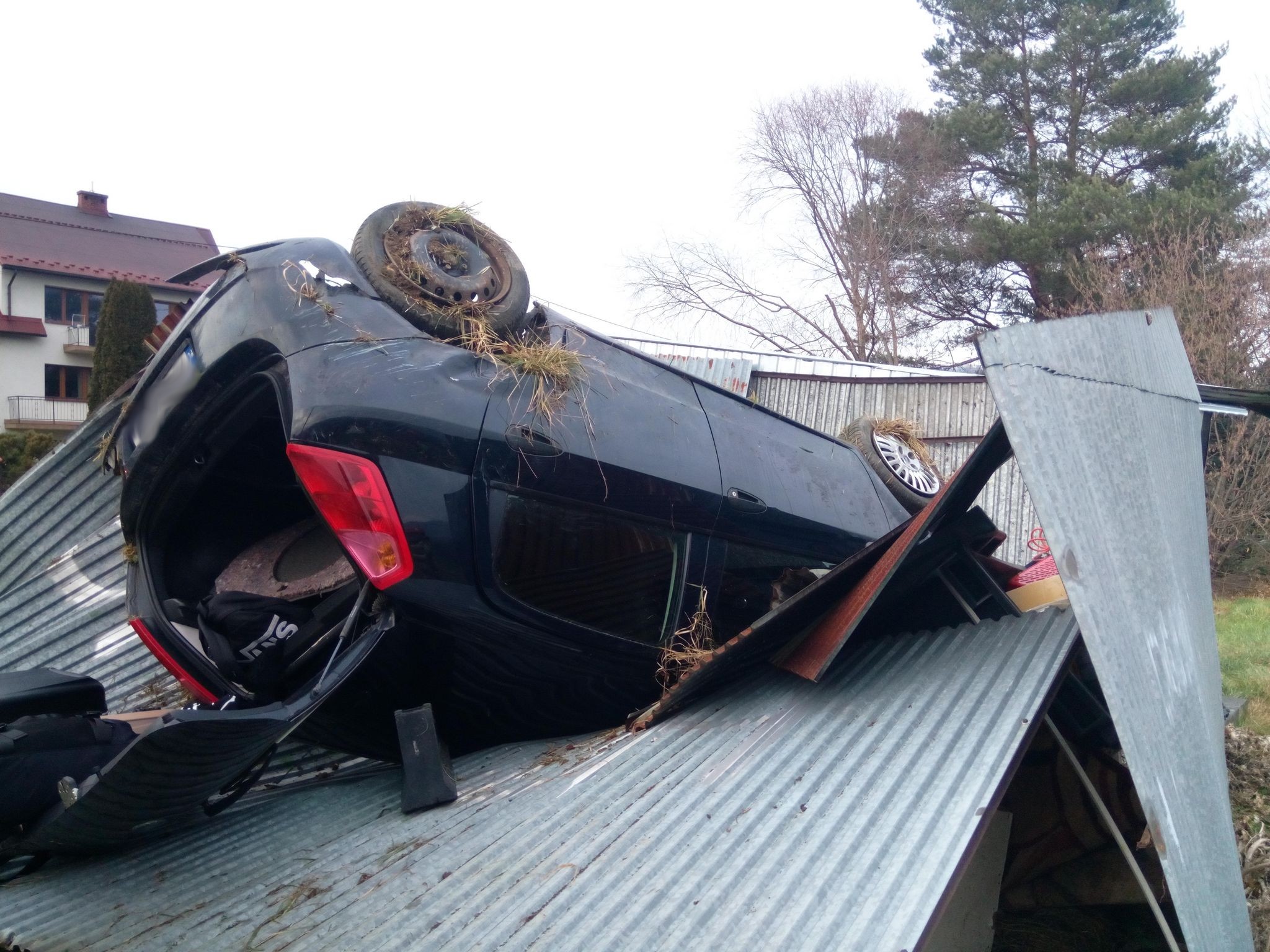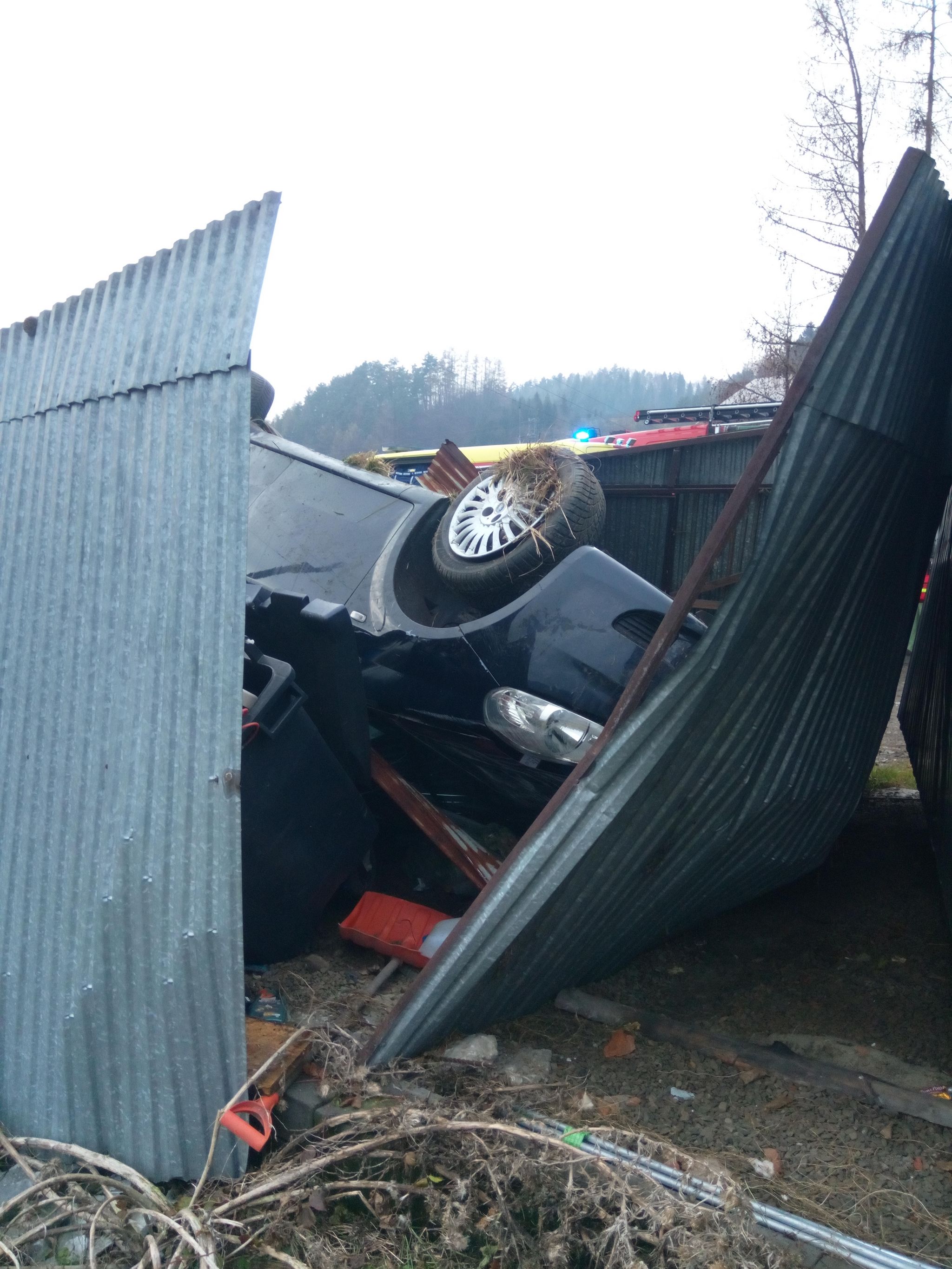 Zabrzeż-samochód osobowy wypadł z drogi i uderzył w blaszane garaże