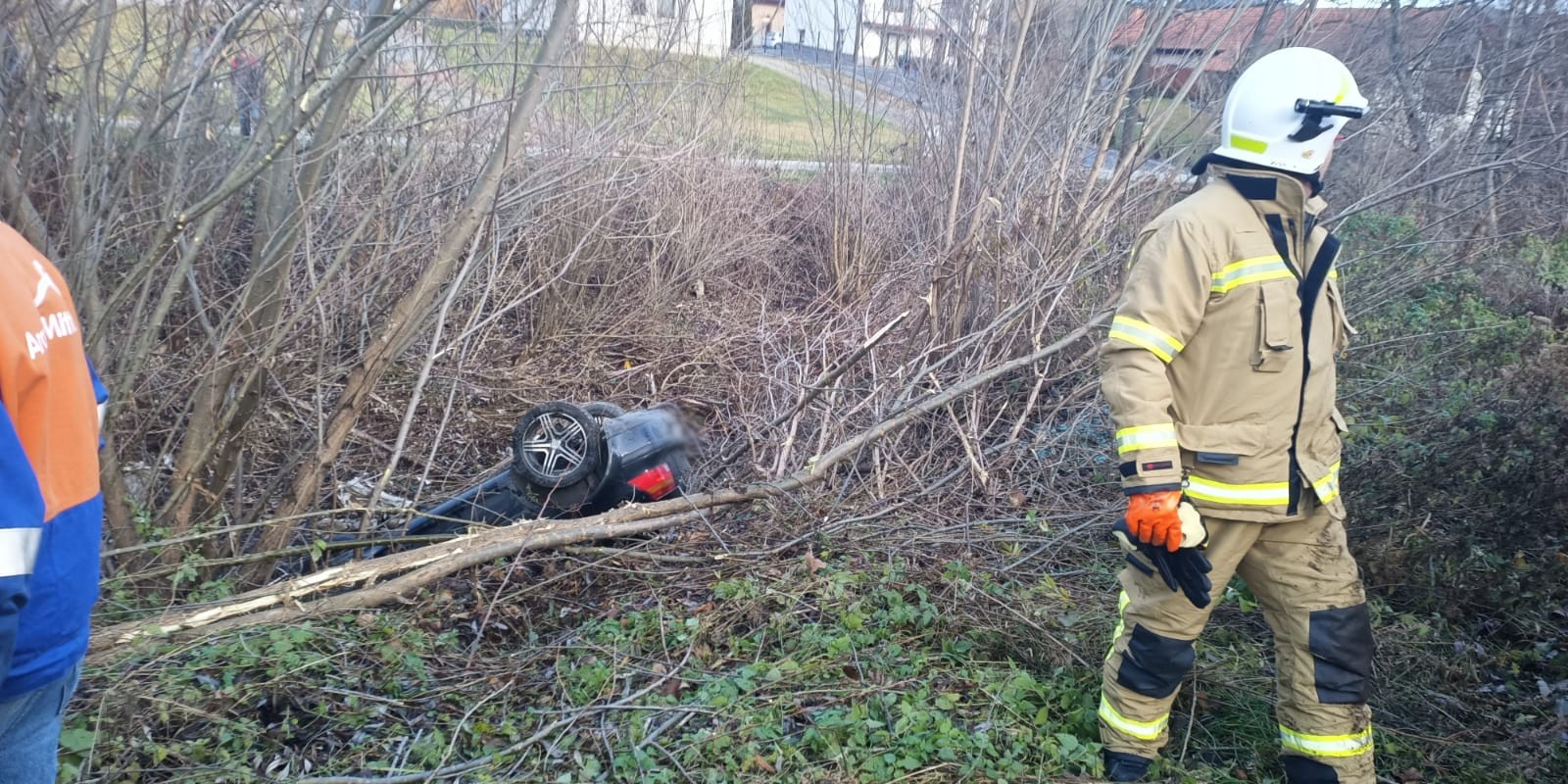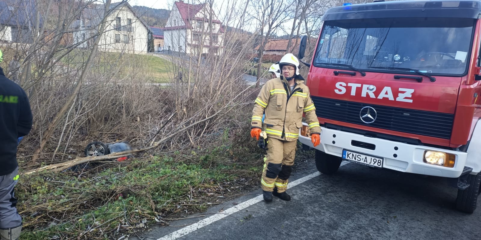 27 listopada o 12.17 zastępy z JRG nr 2 w Nowym Sączu, OSP Zagorzyn oraz OSP Łącko zadysponowane zostały do działań w Zagorzynie. Po przybyciu na miejsce zdarzenia ustalono, że samochód osobowy wypadł z drogi i znajdował się w korycie potoku. Pojazdem podróżowały dwie osoby tj. 19 letnia kobieta wraz dwumiesięcznym dzieckiem. Obydwoje znajdowały się poza pojazdem. Działania strażaków polegały na zabezpieczeniu miejsca zdarzenia oraz wezwaniu na miejsce karetki Pogotowia Ratunkowego w celu przebadania uczestników zdarzenia. Udzielono wsparcia psychicznego osobom uczestniczącym w zdarzeniu oraz komfort cieplny poprzez umieszczenie w kabinie pojazdu pożarniczego. Zabezpieczono uszkodzony pojazd pod względem ppoż. i ewentualnym powstaniu wycieków do koryta potoku. Przy użyciu wciągarki wyciągnięto samochód na pobocze, następnie odłączono klemy akumulatora. Załoga przybyłej na miejsce karetki Pogotowia ratunkowego przebadała podróżujących. Osoby przebadane pozostały na miejscu zdarzenia. W trakcie przemieszczania pojazdu na jezdni powstał wyciek płynów eksploatacyjnych, który usunięto przy użyciu sorbentu. Działania strażaków trwały półtorej godziny.