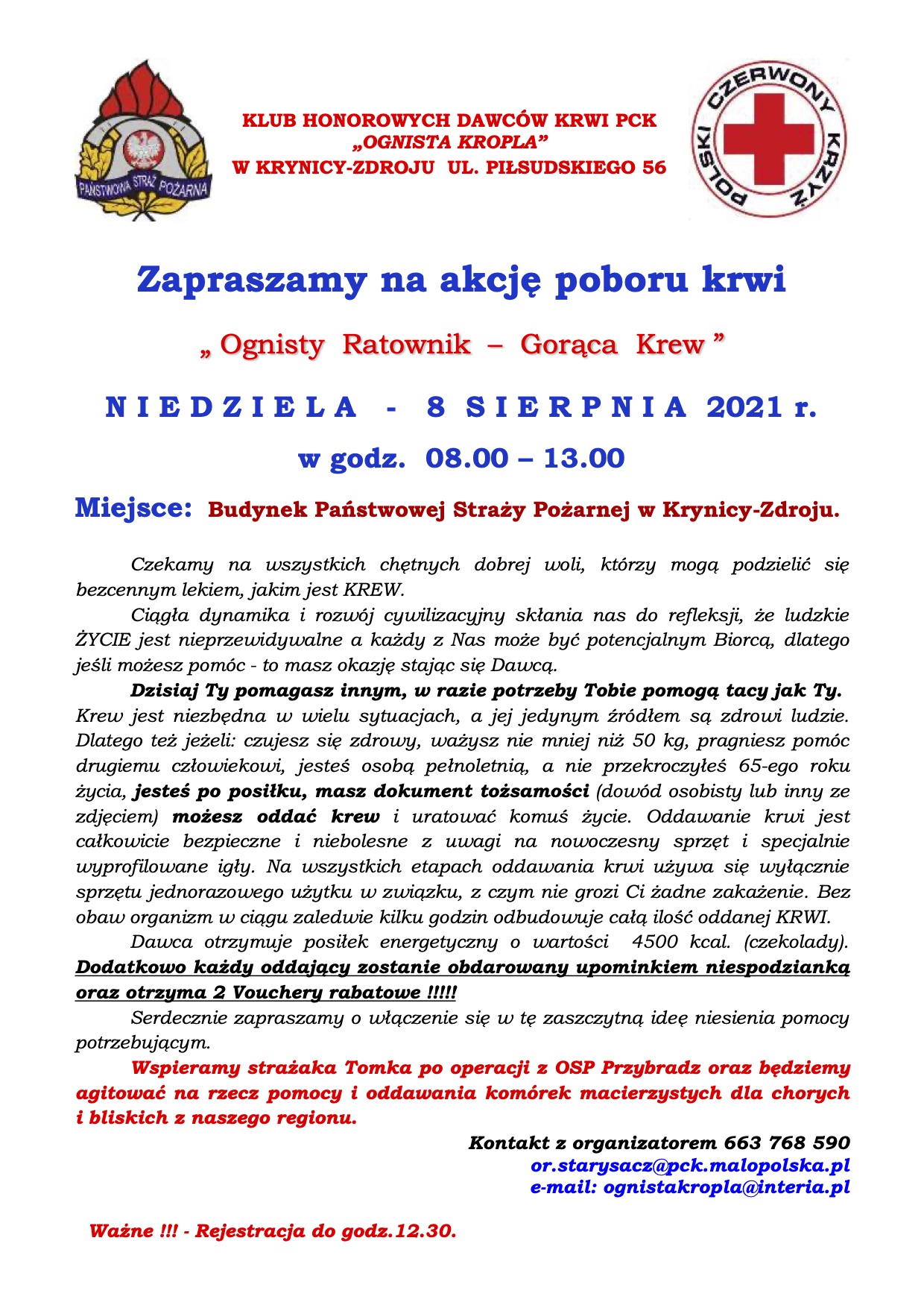 Akcja odbędzie sie w dniu 8 SIERPNIA (niedziela) 2021. w godz. od 8.00 do 13.00 w Strażnicy JRG w Krynicy ul. Piłsudskiego 56.