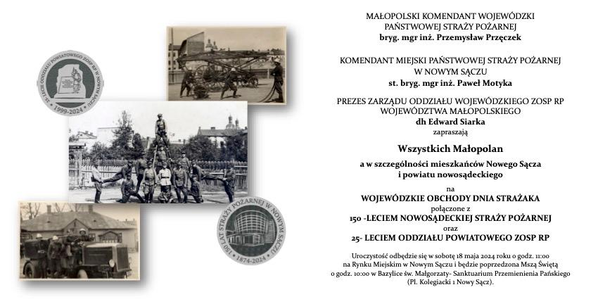 Zapraszamy na obchody Dnia Strażaka, które odbędą się w sobotę 18 maja 2024 roku o godz. 11:00 na Rynku w Nowym Sączu i będzie poprzedzona Mszą Świętą o godz. 10:00 w Bazylice św. Małgorzaty- Sanktuarium Przemienienia Pańskiego (Pl. Kolegiacki 1 Nowy Sącz).