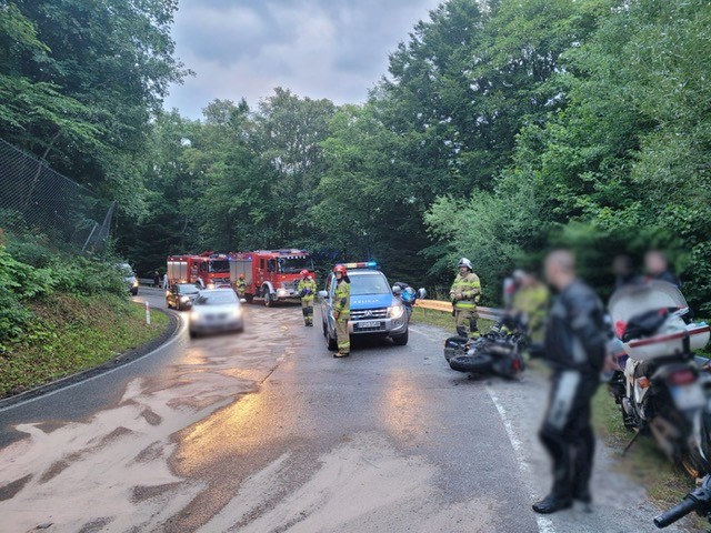 16 lipca o godzinie 19.24 zastępy z JRG w Krynicy Zdroju, OSP Żegiestów oraz OSP Muszyna zadysponowane zostały do działań w Żegiestowie. Po przybyciu na miejsce zdarzenia ustalono, że doszło do zdarzenia samochodu osobowego z motocyklem. Pojazdami podróżowało pięć osób w tym cztery osoby samochodem a jedna osoba motocyklem. Poszkodowany motocyklista był pod opieką ratowników medycznych w karetce Pogotowia ratunkowego. Osoby podróżujące samochodem nie doznały obrażeń. Motocykl znajdował się na poboczu i wyciekały z niego płyny eksploatacyjne. Samochód znajdował się na jezdni blokując jeden pas. Działania zastępów straży polegały na zabezpieczeniu miejsca zdarzenia, dokonaniu sorpcji rozlanych płynów eksploatacyjnych oraz kierowaniu ruchem drogowym. Po odjeździe z miejsca zdarzenia karetki Pogotowia ratunkowego z poszkodowanym do szpitala, do czasu zakończenia czynności przez Policję na miejscu pozostał zastęp OSP. Działania strażaków trwały ponad pięć godzin.