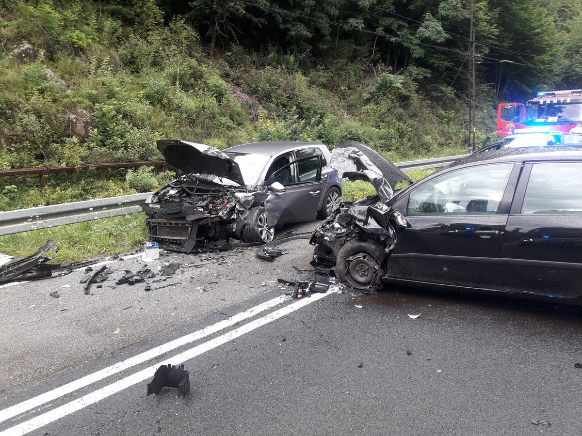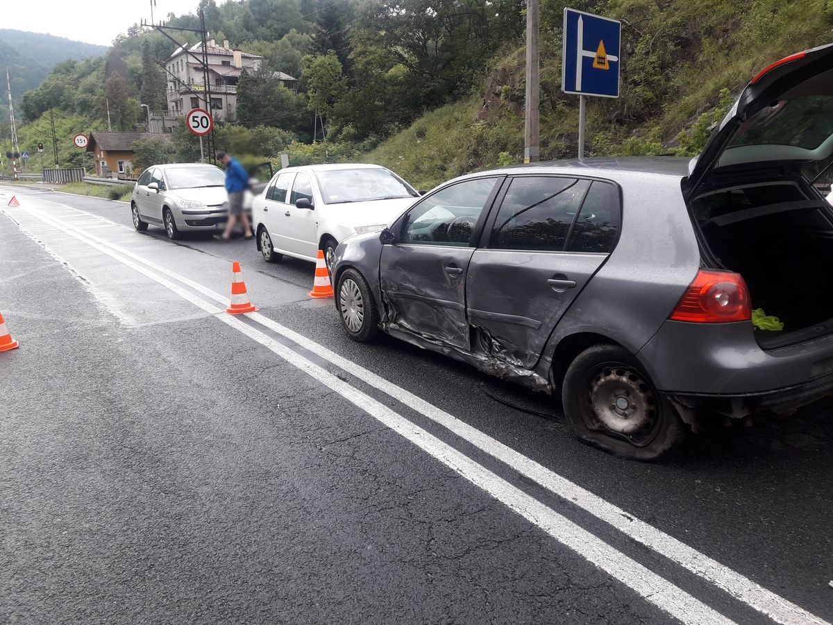 1 sierpnia około godziny 10.37 zastępy z JRG w Krynicy Zdroju, OSP Muszyna oraz OSP Żegiestów zadysponowane zostały do działań w Żegiestowie. Po przybyciu na miejsce zdarzenia ustalono, że w zdarzeniu uczestniczyły trzy samochody osobowe, którymi podróżowało łącznie 4 osoby. Rozbite samochody całkowicie blokowały ruch na drodze wojewódzkiej. Wszystkie osoby opuściły pojazdy o własnych siłach. Dwie z nich uskarżały się na dolegliwości. Nastąpił wyciek płynów eksploatacyjnych. Działania straży pożarnej polegały na zabezpieczeniu terenu działań oraz udzieleniu kwalifikowanej pierwszej pomocy poszkodowanym osobom. Odłączono akumulatory z rozbitych samochodów. Poszkodowane osoby zostały przekazane ratownikom medycznym Pogotowia ratunkowego. Po częściowym przywróceniu ruchu wsparto działania Policji i kierowano ruchem wahadłowo. Po zakończeniu czynności dochodzeniowych przez Policję usunięto płyny eksploatacyjne z użyciem sorbentu.