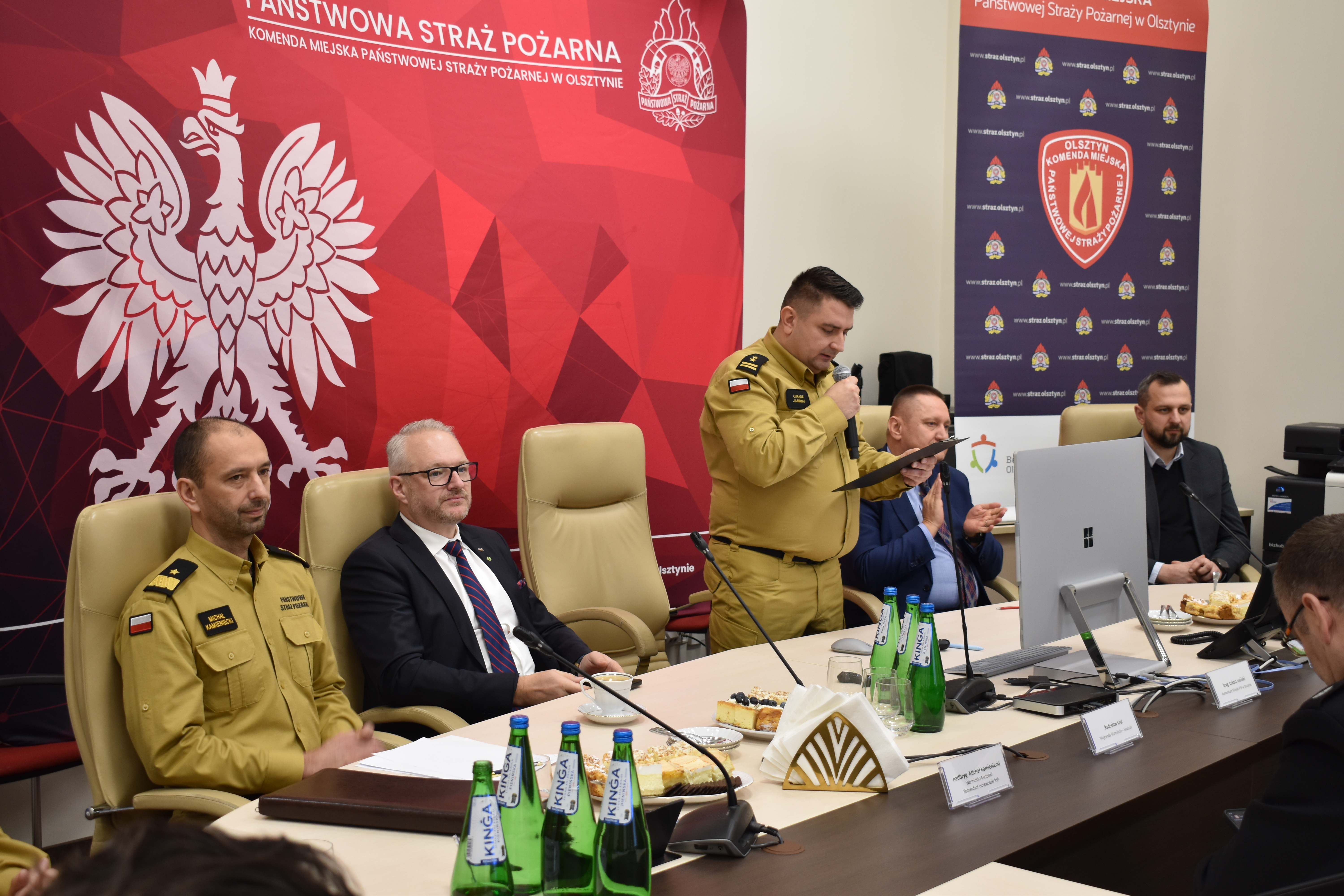Następnie głos zabrał Wojewoda Warmińsko-Mazurski Radosław Król, a po nim Warmińsko-Mazurski Komendant Wojewódzki PSP nadbryg. Michał Kamieniecki, który podziękował wszystkim przybyłym gościom, władzom samorządowym, pracownikom cywilnym komendy, strażakom za codzienną służbę i zaangażowanie oraz przedstawił główne cele i kierunki działań Państwowej Straży Pożarnej w województwie warmińsko-mazurskim.