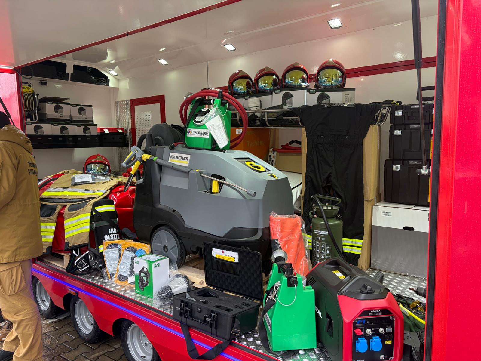 Po zakończeniu odprawy KM PSP w Olsztynie dokonał prezentacji sprzętu zakupionego przez komendę oraz gminy powiatu olsztyńskiego z dofinansowania w ramach Programu Ochrony Ludności i Obrony Cywilnej.