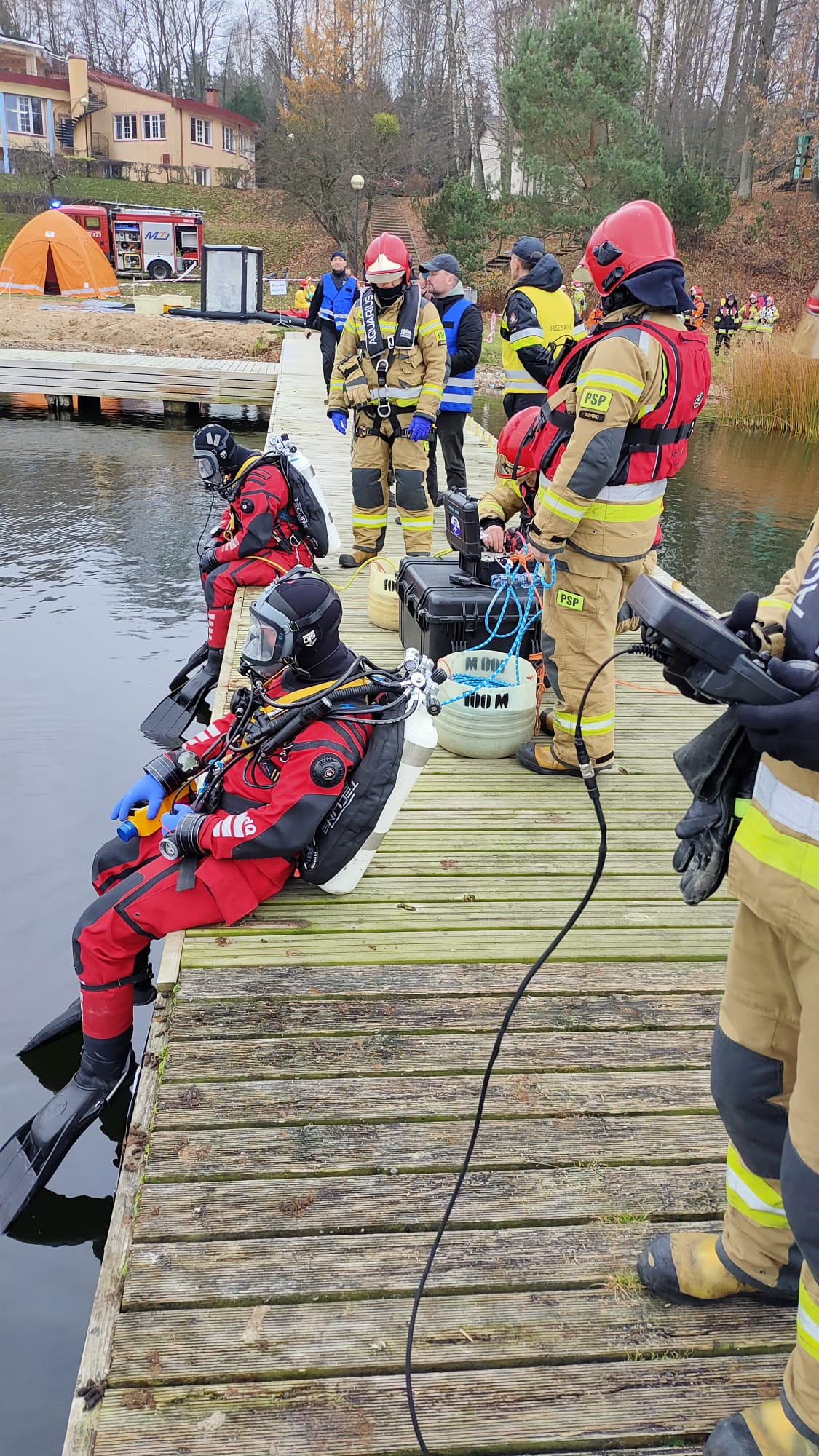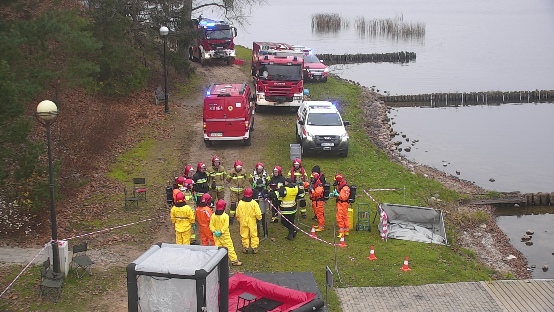 Z uwagi na charakter zdarzenia na miejsce zadysponowano siły Państwowej Straży Pożarnej w postaci Specjalistycznej Grupy Ratownictwa Wodno-Nurkowego (SGRW-N) oraz Specjalistyczną Grupę Ratownictwa Chemiczno-Ekologicznego (SGRChem-Eko). Po przeprowadzonym rozpoznaniu ustalono, iż na dnie jeziora, na głębokości do 6 m znajdują się żółte pojemniki oznakowane symbolem promieniotwórczości w postaci czerwonej „koniczynki”. Działania SGRW-N potwierdziły obecność 6 żółtych, bez śladów uszkodzeń pojemników, z czego każdy z nich ma objętość ok. 60 litrów. W celu oceny narażenia na promieniowanie jonizujące, pod wodę zszedł nurek wyposażony w przyrząd dozymetryczny identiFINDER-U, który jest dedykowany do prac podwodnych. W wyniku pomiarów dozymetrycznych ustalono, że na jednym z zatopionych pojemników występuje znacznie podwyższona moc dawki, zmierzona wartość to ok. 15 mSv/h. Podjęto decyzję o wydobyciu zatopionych pojemników i przekazaniu celem przewiezienia do Ośrodka Radioizotopów POLATOM. Były to pierwsze w kraju tego typu ćwiczenia. Z bieżącej relacji obserwatorów wynika, że strażacy naszego województwa poradzili sobie wzorowo z przedstawionym zagadnieniem .