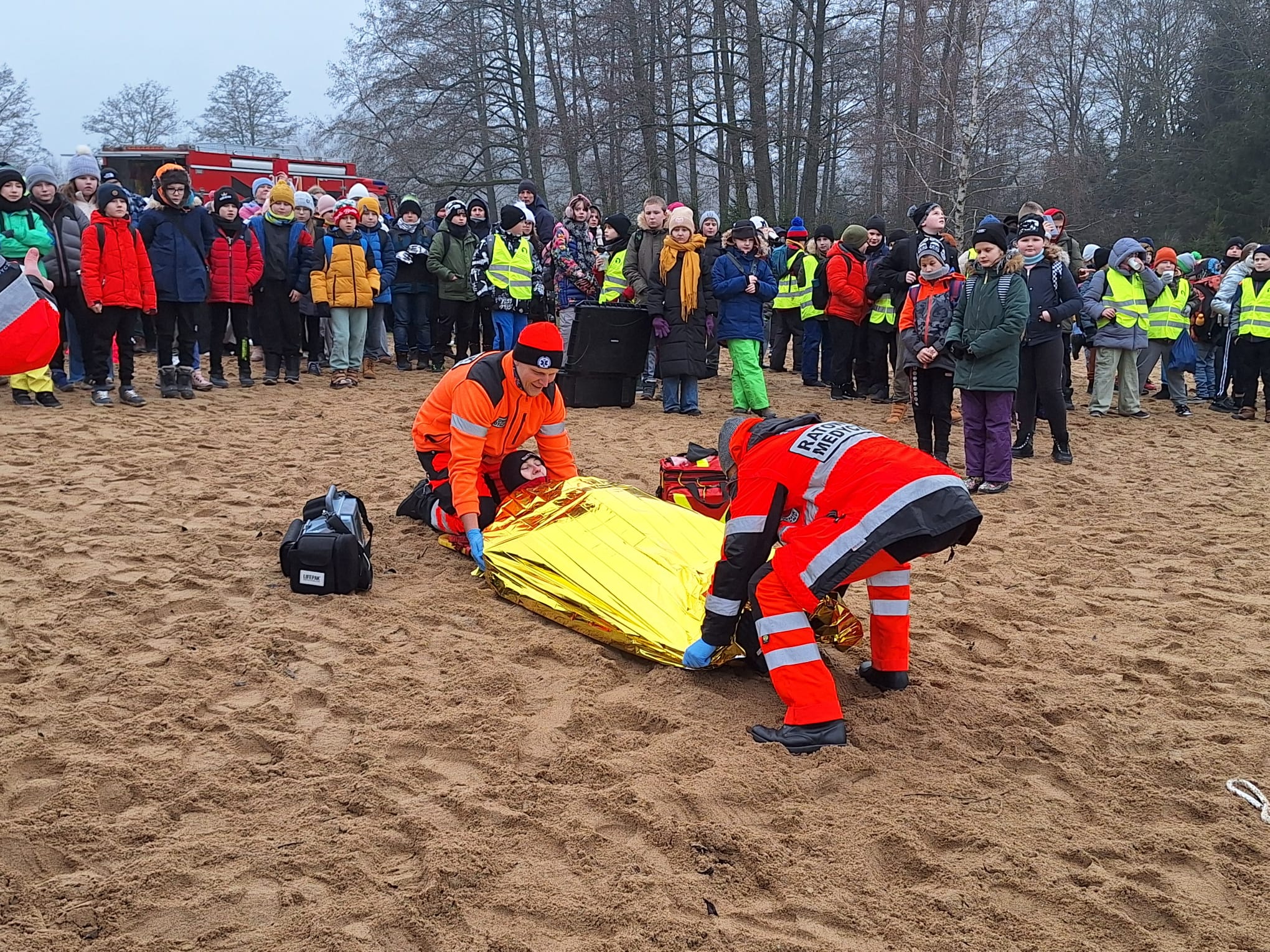 w Olsztynie we współpracy z lokalnymi OSP prowadzili pokaz ratowania osoby, pod którą załamał się lód przy wykorzystaniu profesjonalnego w tym zakresie sprzętu. Zaprezentowano m. in. umiejętności nurków z JRG2, którzy wyciągali manekina zanurzonego pod powierzchnią wody. Przekazano dzieciom informacje w jaki sposób wzywać pomoc oraz służby i jakie informacje przekazać podczas zgłoszenia zdarzenia. Zaprezentowano, jak powinno się zachować w takich sytuacjach oraz jak udzielać pomocy dbając równocześnie o swoje bezpieczeństwo. Uratowanego z wody pozoranta strażacy przekazywali ratownikom medycznym, którzy opowiadali o zasadach udzielania pierwszej pomocy oraz reanimacji i przedstawili zasady postępowania w przypadku wychłodzenia organizmu.