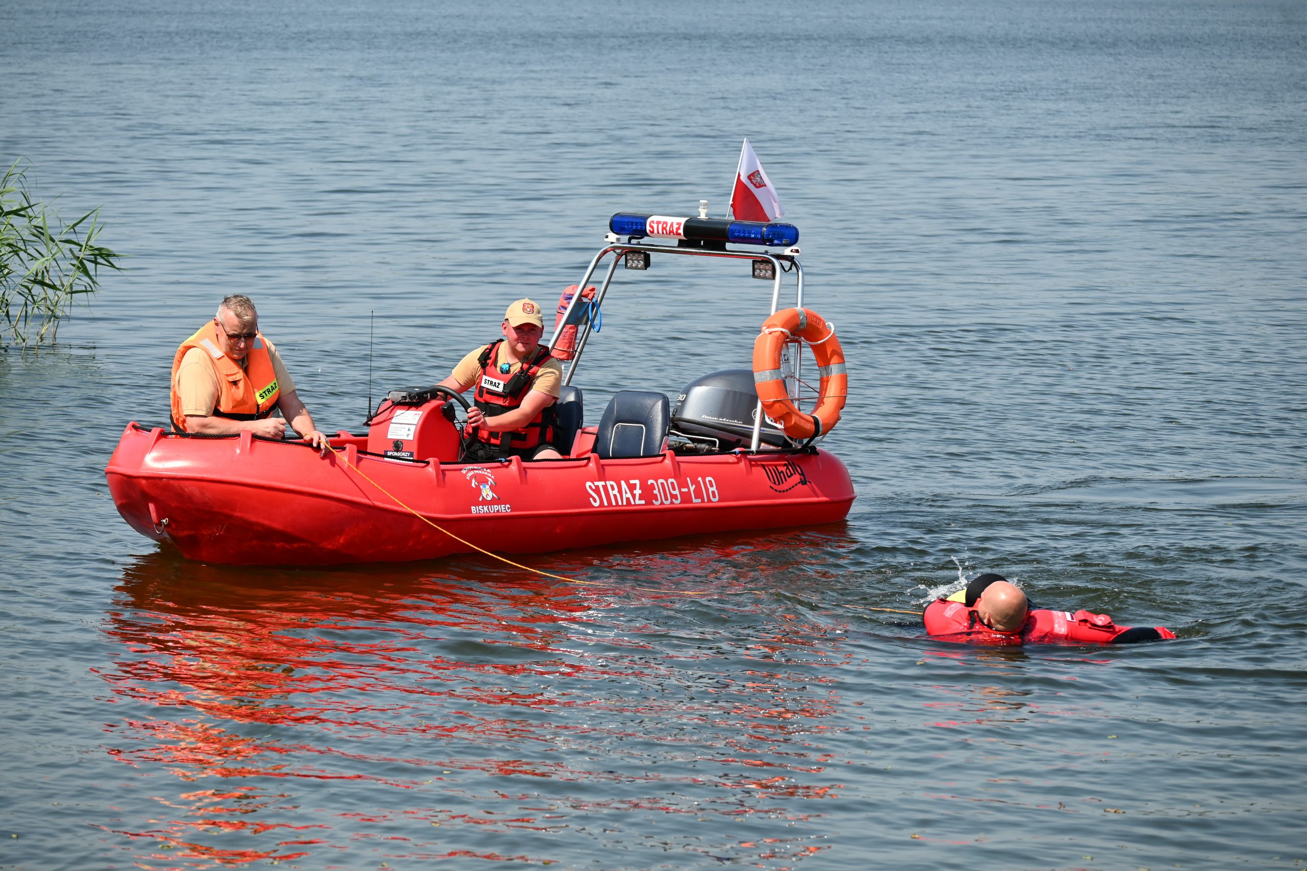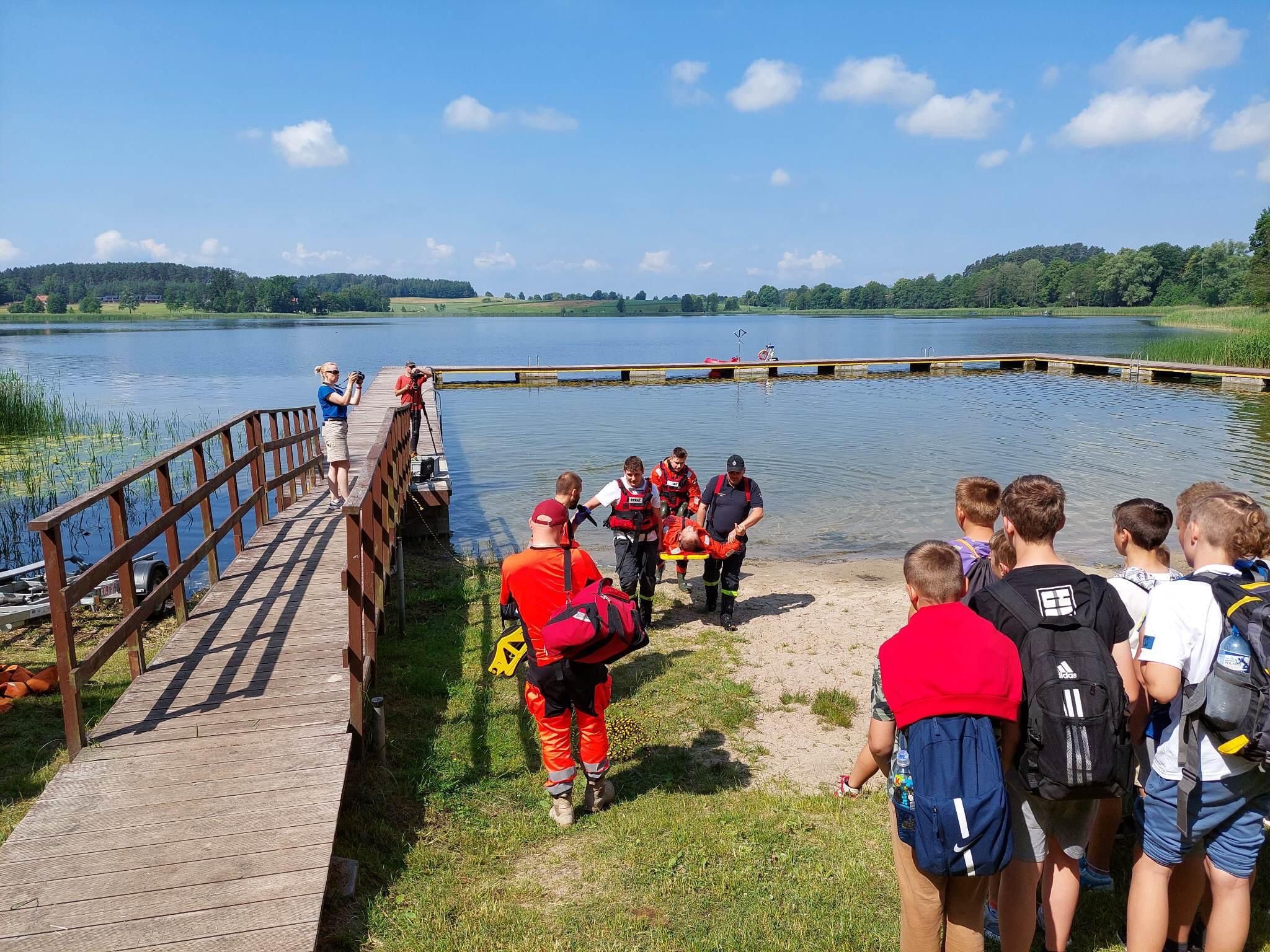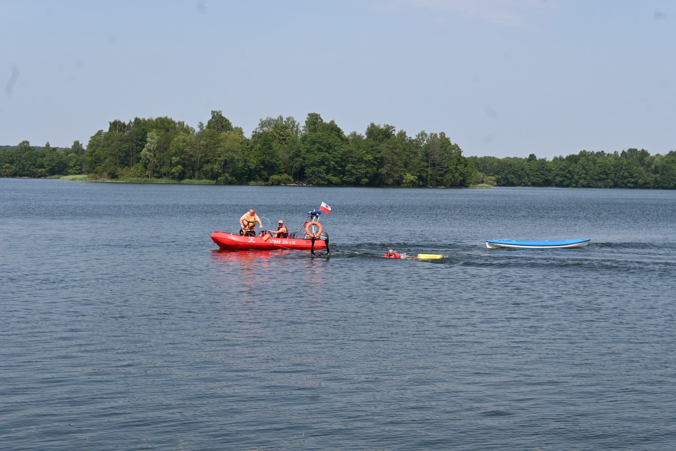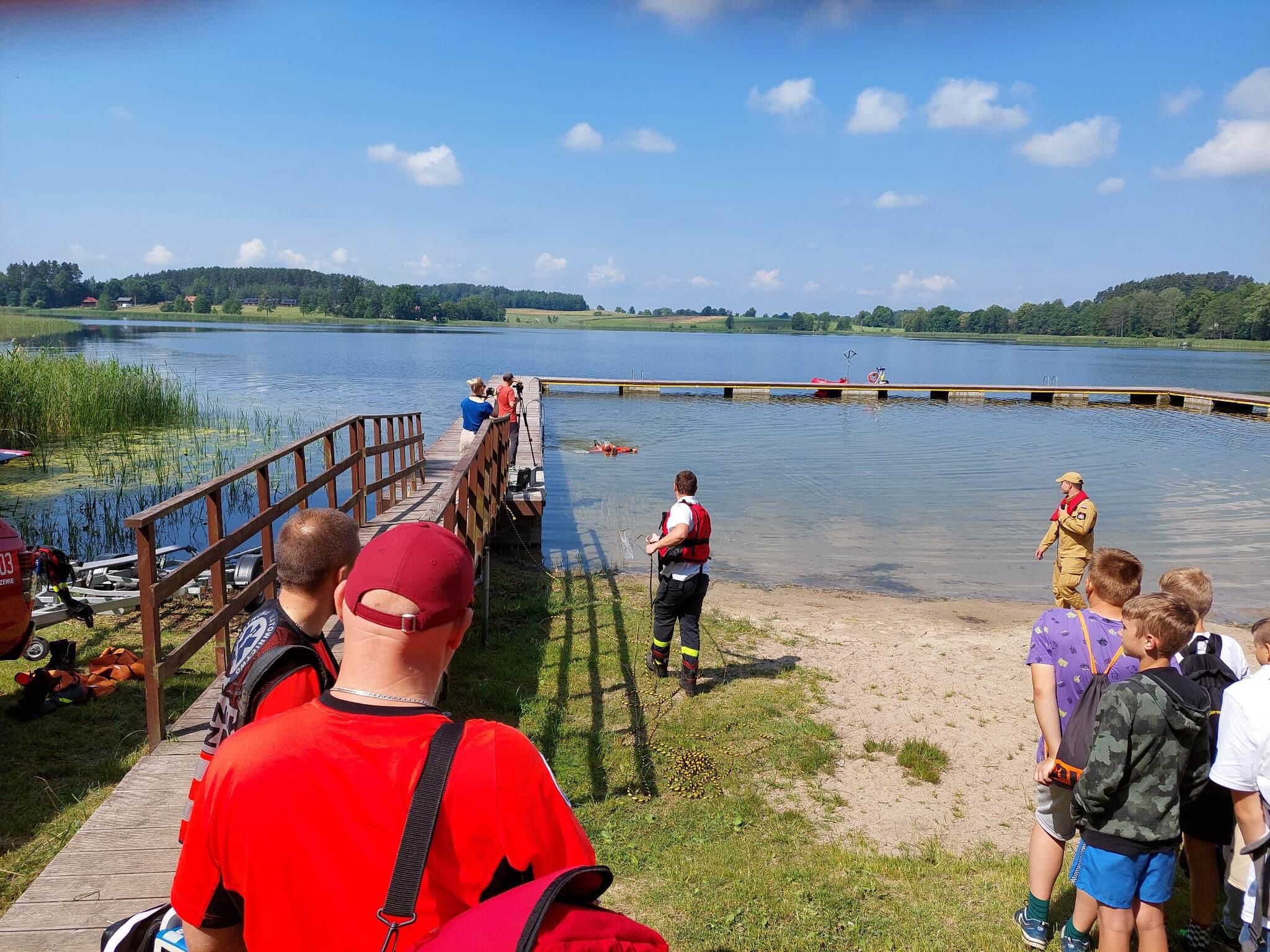Nasi strażacy ze Specjalistycznej Grupy Ratownictwa Wodno – Nurkowego działającej w JRG2 Olsztyn przy wsparciu strażaków z OSP zaprezentowali sposób prowadzenia poszukiwań osoby pod wodą oraz pokaz działań w sytuacji podjęcia poszkodowanego, który wypadł z łódki.