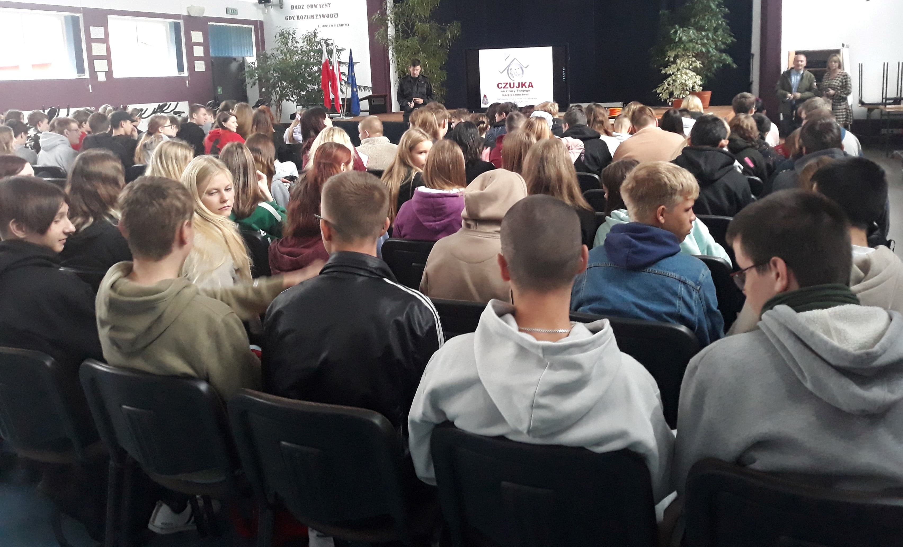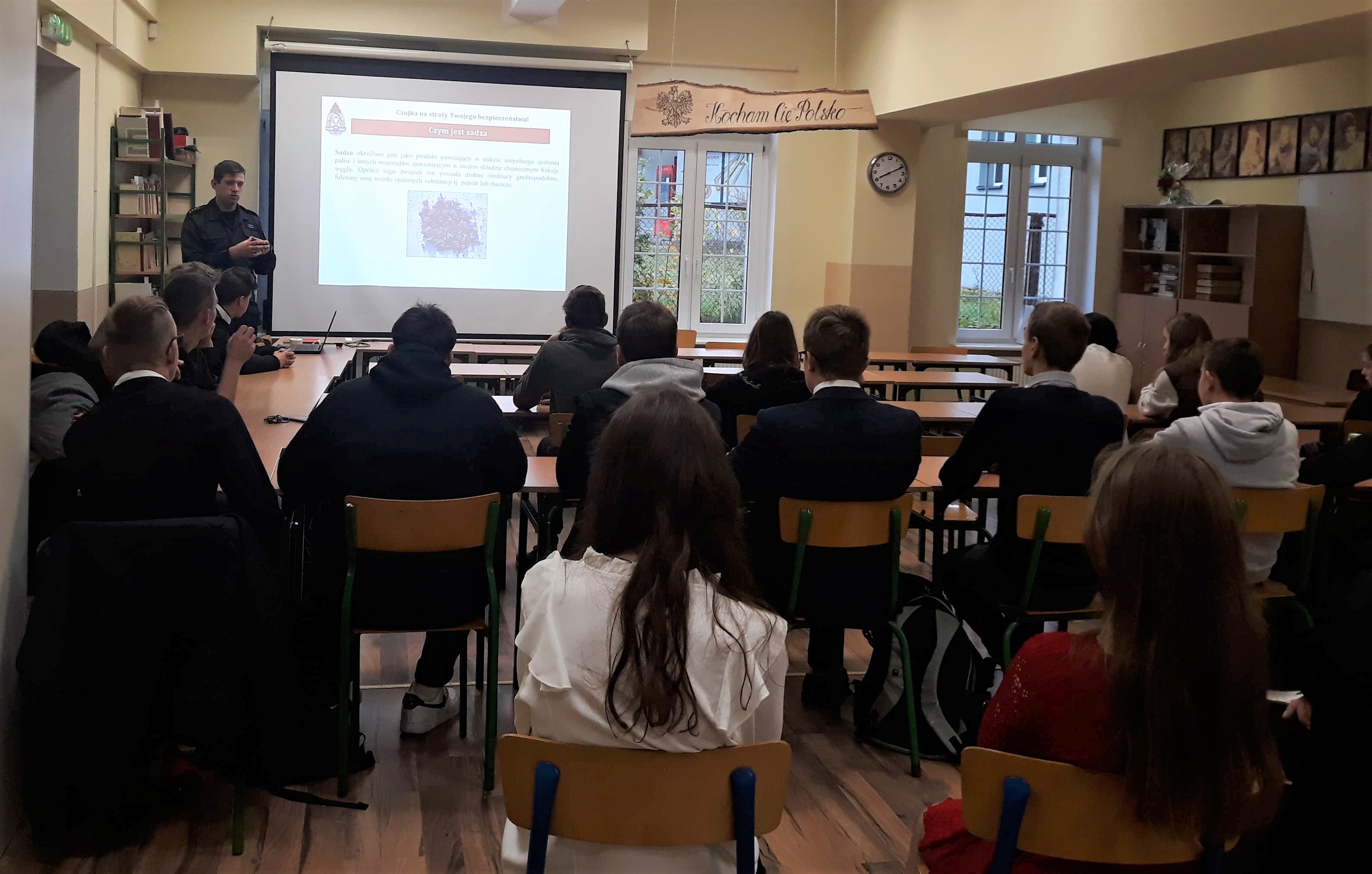 i wentylacyjnych. Przedstawiono przyczyny powstawania sytuacji podczas których dochodzi do zatrucia tlenkiem węgla, jak im zapobiegać oraz jak postępować w przypadku zagrożenia związanego z jego emisją. Omówiono również zagrożenia związane z nagromadzeniem sadzy w przewodach kominowych. Łącznie w zajęciach uczestniczyło 450 uczniów klas pierwszych szkół średnich.
