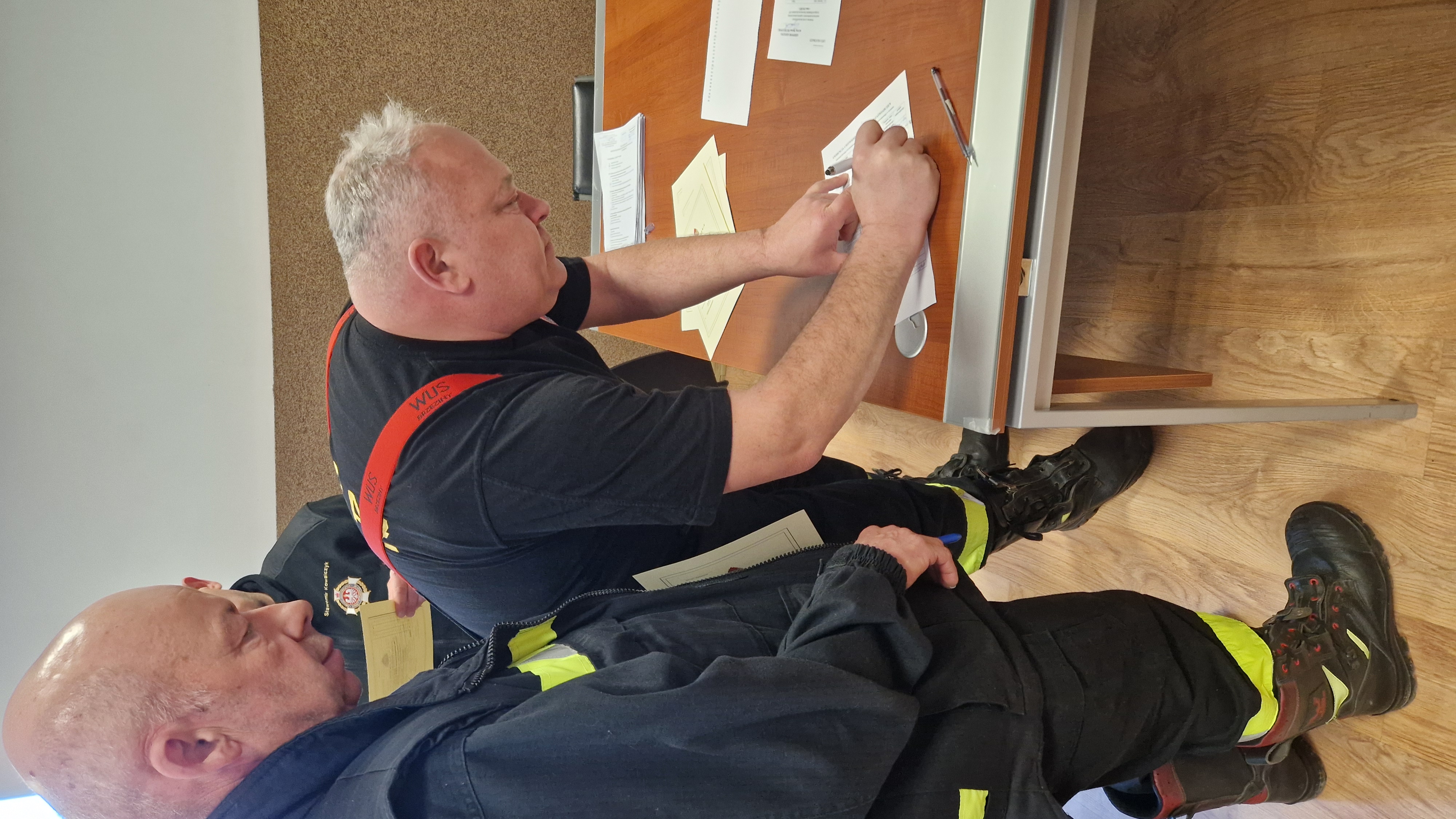 Egzamin kończący kurs „Kierujących działaniem ratowniczym dla członków Ochotniczych Straży Pożarnych (dowódców OSP)”.