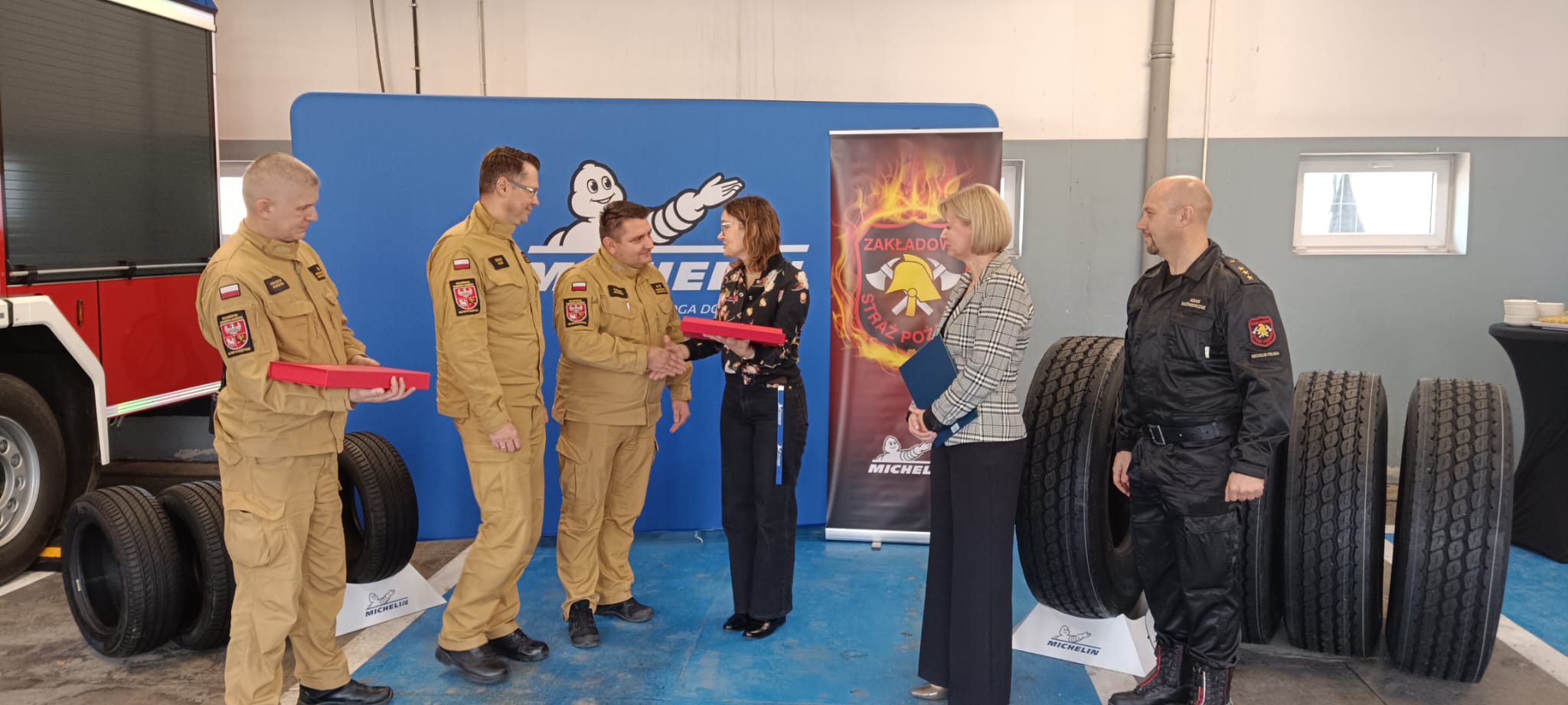 We wtorek 5 listopada 2024 r. w remizie Zakładowej Straży Pożarnej Michelin doszło do uroczystego przekazanie ośmiu specjalistycznych opon Komendzie Miejskiej Państwowej Straży Pożarnej w Olsztynie. Ogumienie zostanie zamontowane w pojazdach pożarniczych przeznaczonych do działań ratowniczo - gaśniczych.
