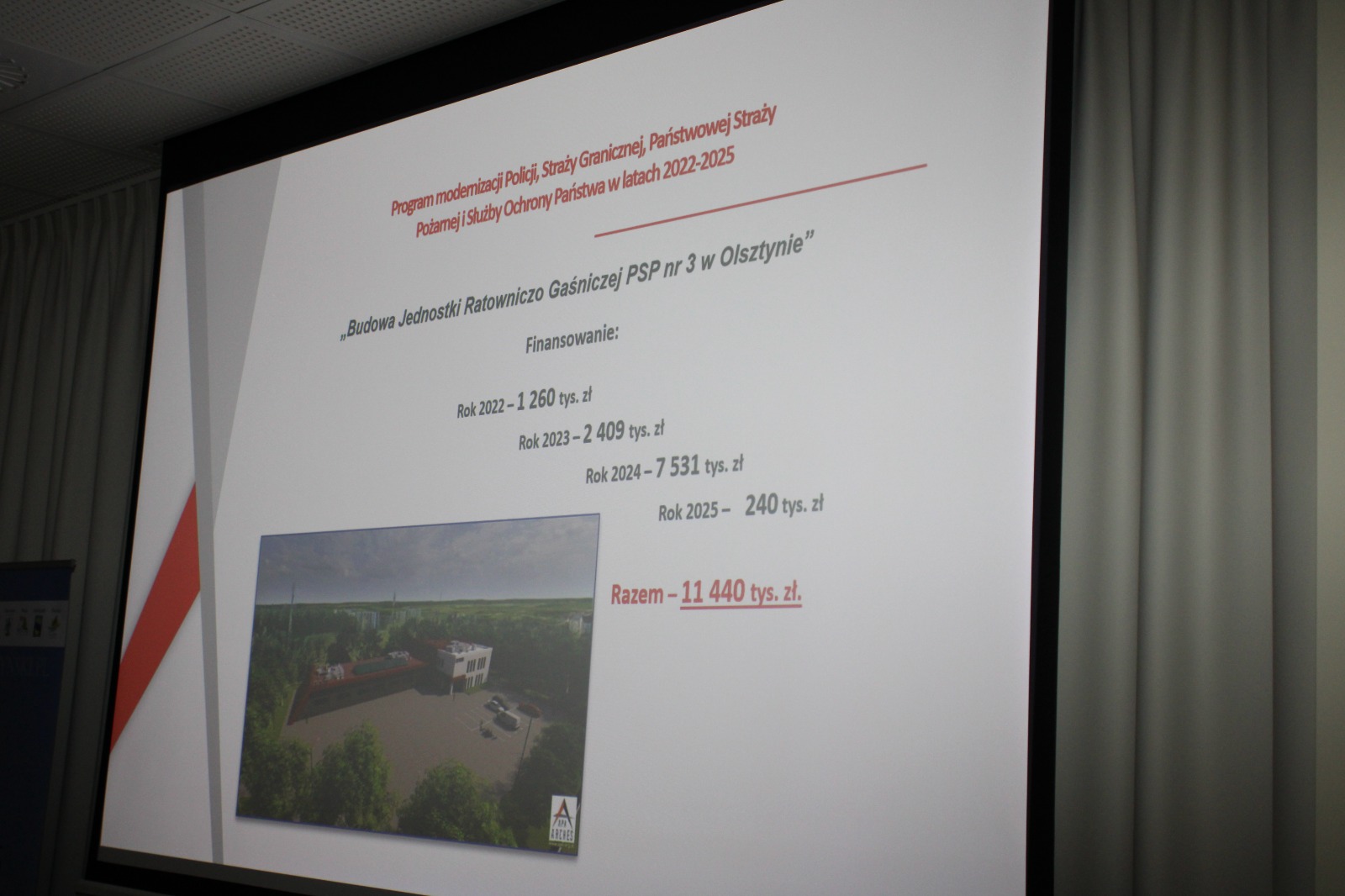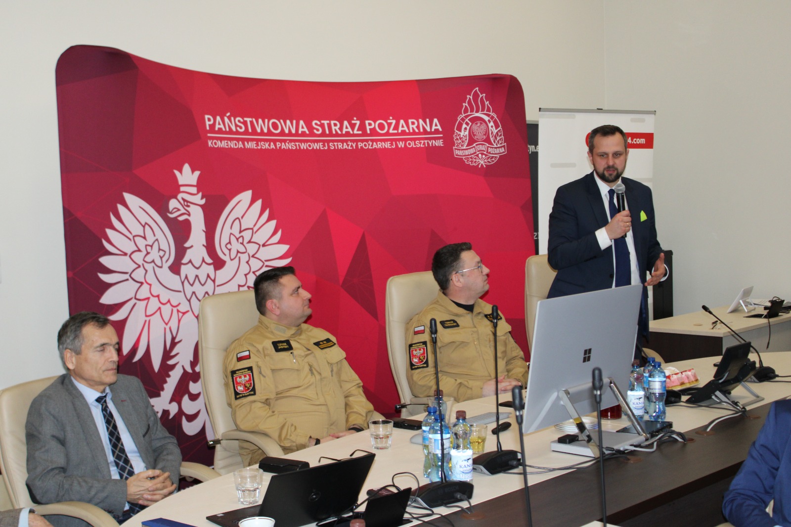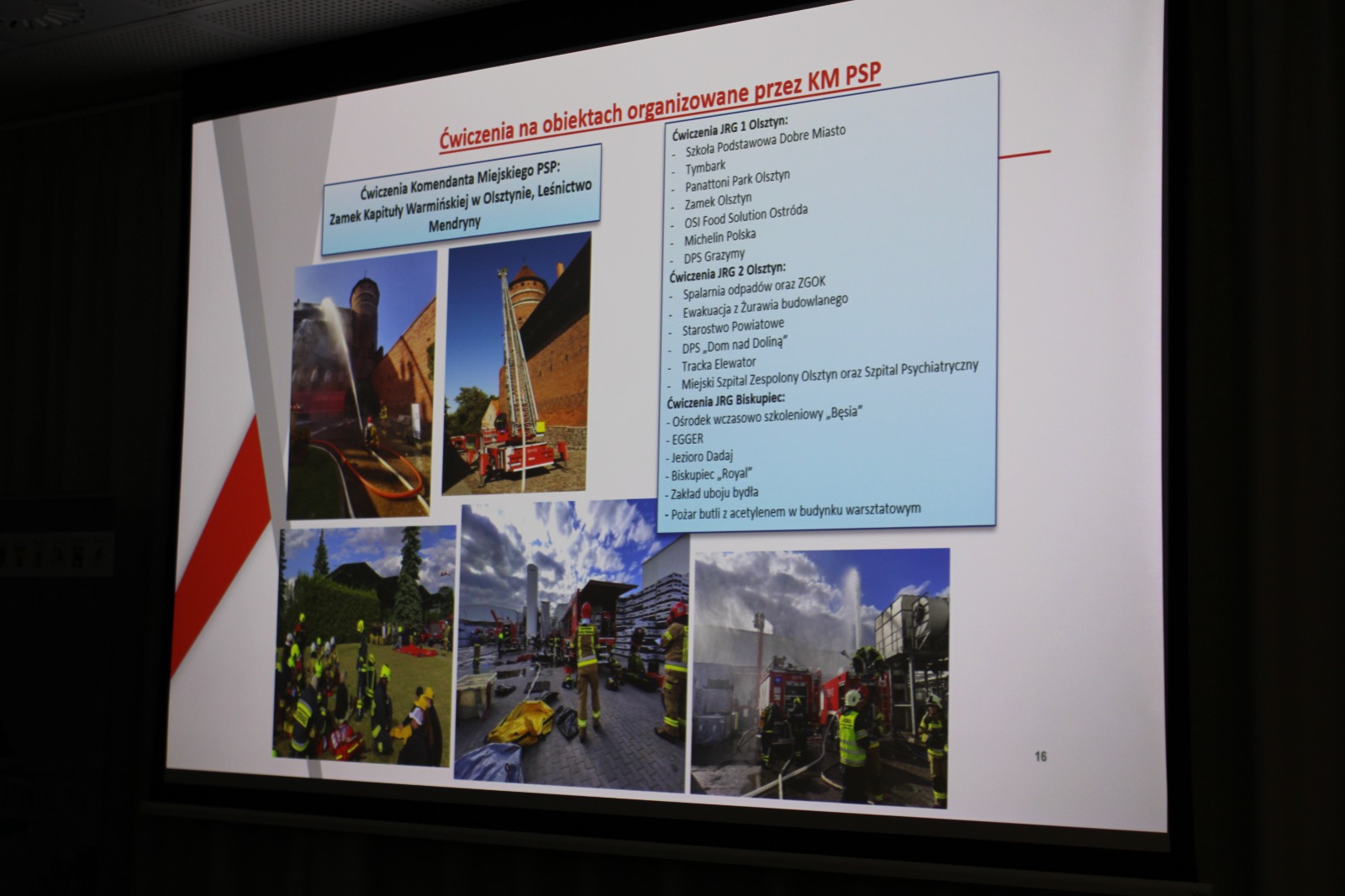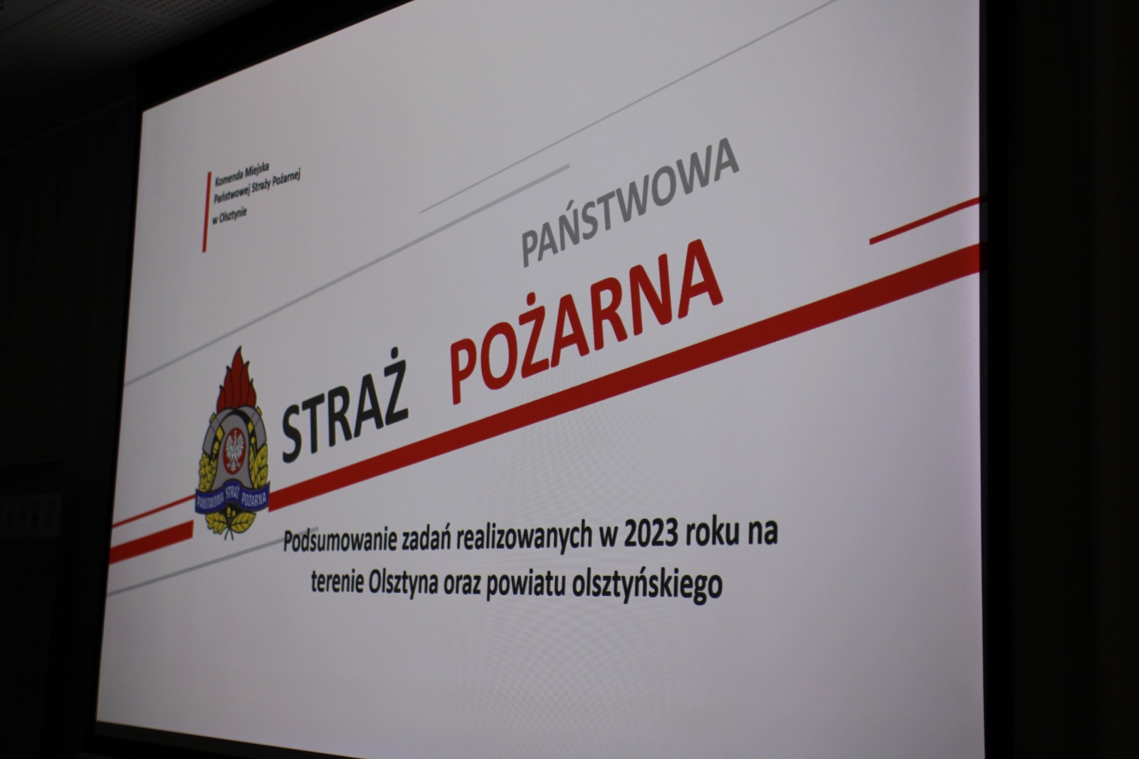 a następnie głos zabrał bryg. Łukasz Jasiński Komendant Miejski PSP w Olsztynie, który przywitał zgromadzonych gości a następnie przedstawił w formie prezentacji elektronicznej całoroczną działalność Komendy Miejskiej PSP w Olsztynie na rzecz ochrony przeciwpożarowej na terenie Miasta Olsztyna i Powiatu Olsztyńskiego uwzględniając również plany na rok 2024.