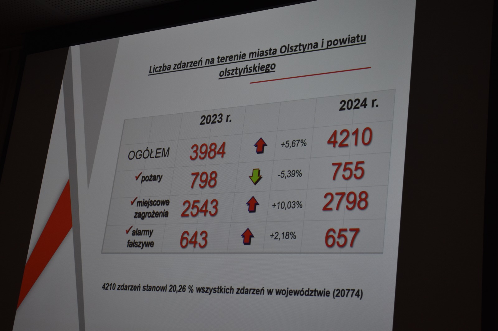 Komendant Miejski PSP w Olsztynie bryg. Łukasz Jasiński przedstawił w formie prezentacji elektronicznej całoroczną działalność Komendy Miejskiej PSP w Olsztynie na rzecz ochrony przeciwpożarowej na terenie Miasta Olsztyna i Powiatu Olsztyńskiego w roku 2024, uwzględniając również plany na rok 2025.