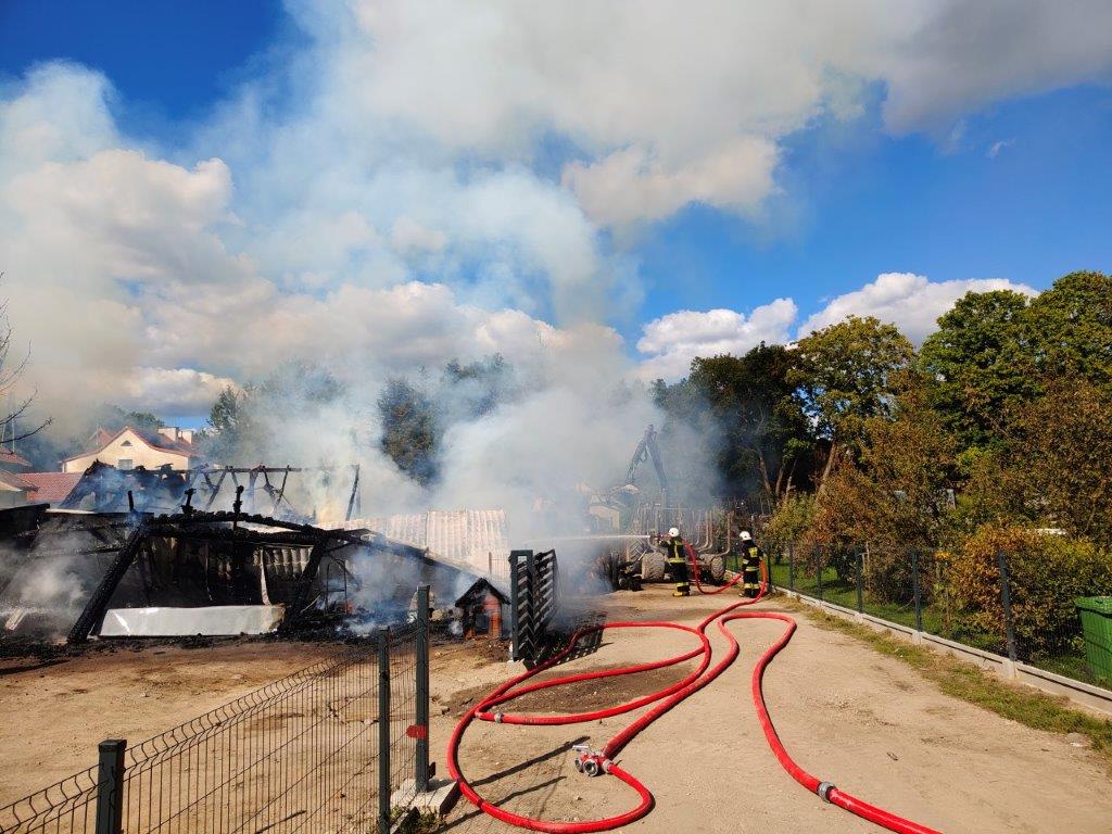 Działania Straży Pożarnej polegały na podaniu 4 prądów gaśniczych wody, w tym w natarciu na palące się obiekty i w obronie na zagrożone budynki mieszkalne, zorganizowaniu zaopatrzenia wodnego z sieci hydrantowej oraz dogaszeniu