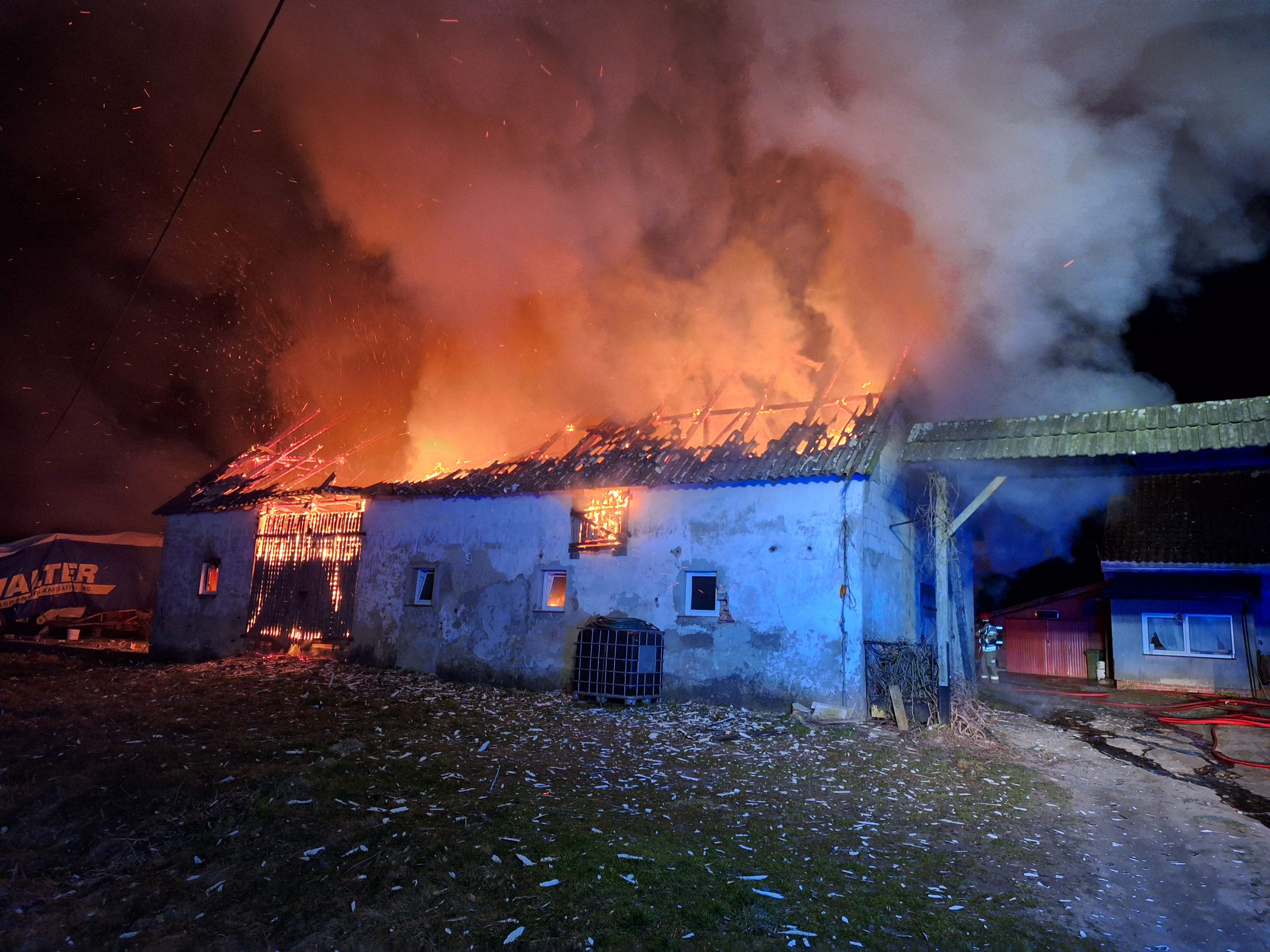 Po przybyciu na miejsce zdarzenia zastano obiekt całkowicie objęty pożarem. Bezpośrednio zagrożony był budynek mieszkalny.