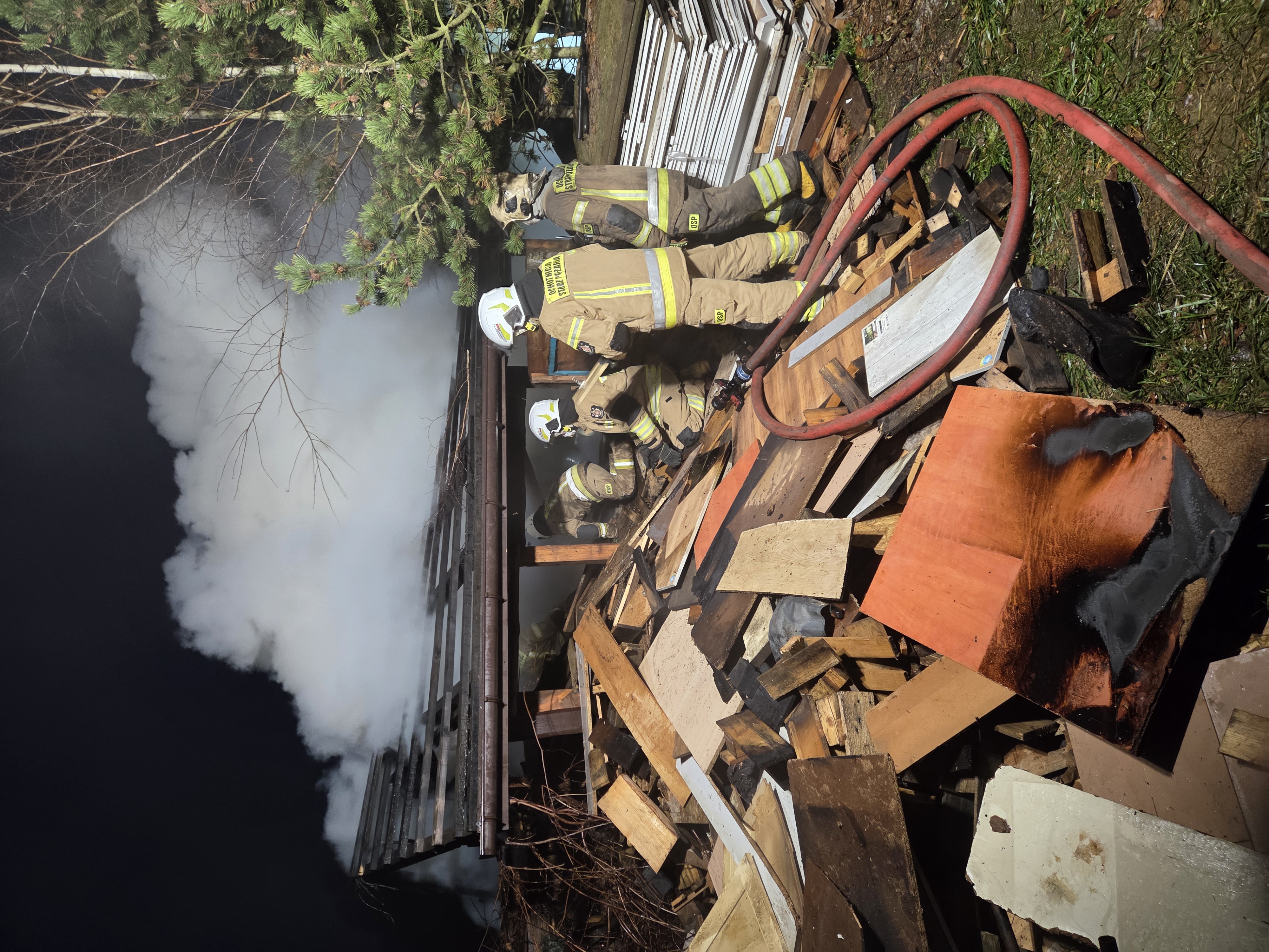 Działania Straży Pożarnej polegały na podaniu łącznie 5 prądów wody w natarciu na palące się obiekty, wyrzuceniu na zewnątrz drewna znajdującego się pod wiatą i dogaszeniu zarzewi ognia.
