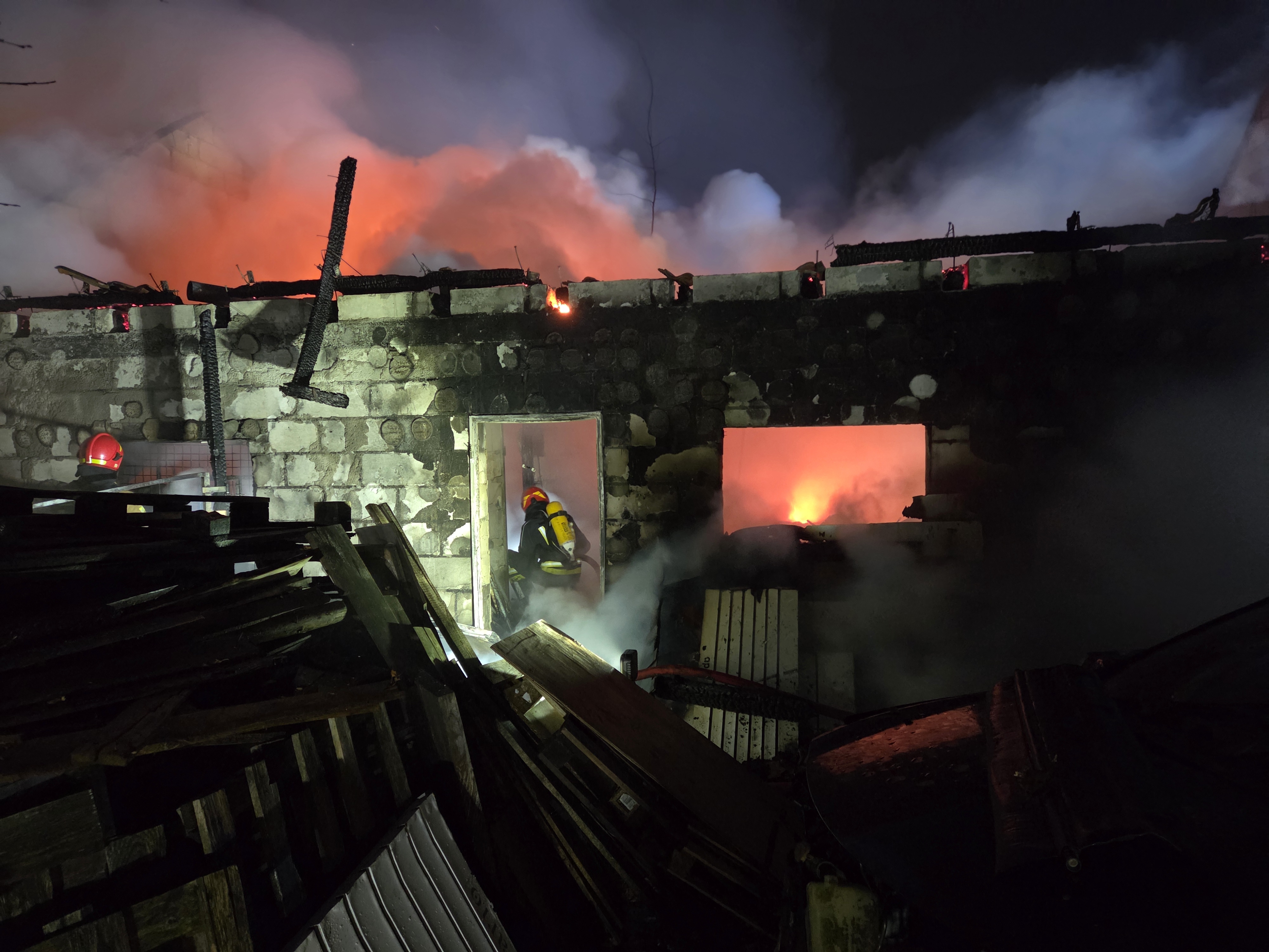 Po przybyciu na miejsce zdarzenia Kierujący Działaniem Ratowniczym stwierdził, że pożarem objęty jest całkowicie budynek gospodarczy znajdujący się na posesji oraz stojąca obok wiata z drewnem opałowym.