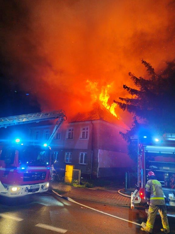 Po przybyciu na miejsce zdarzenia Kierujący Działaniem Ratowniczym stwierdził, że pożarem objęte jest poddasze oraz część dachu o konstrukcji drewnianej. Wszystkie osoby zamieszkujące budynek opuściły swoje mieszkania przed przybyciem zastępów JOP.