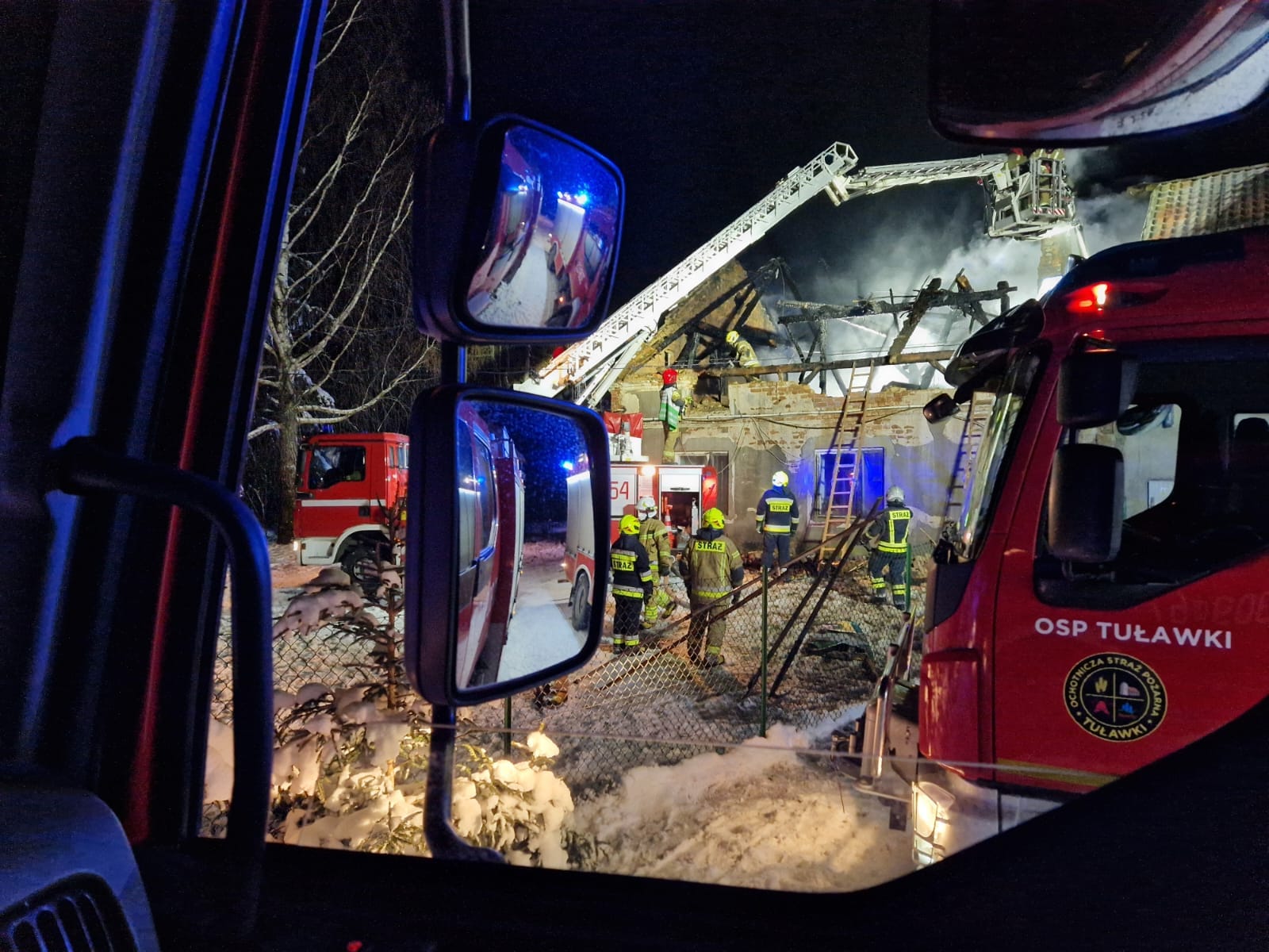 (w tym jeden z podnośnika hydraulicznego) na palący się dach oraz w obronie zagrożonej części. Po przygaszeniu ognia, wykonaniu niezbędnych prac rozbiórkowych elementów konstrukcyjnych budynku i całkowitym ugaszeniu pożaru.