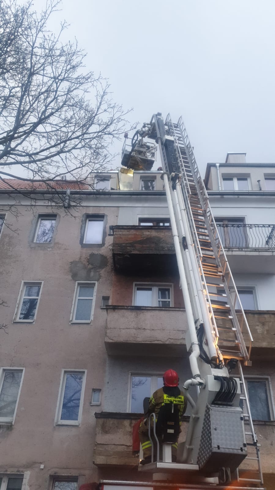 Następnie podano 3 prądy gaśnicze wody w natarciu. Pierwszy prąd wody poprowadzony został po klatce schodowej, a pozostałe dwa z drabiny mechanicznej oraz podnośnika hydraulicznego.