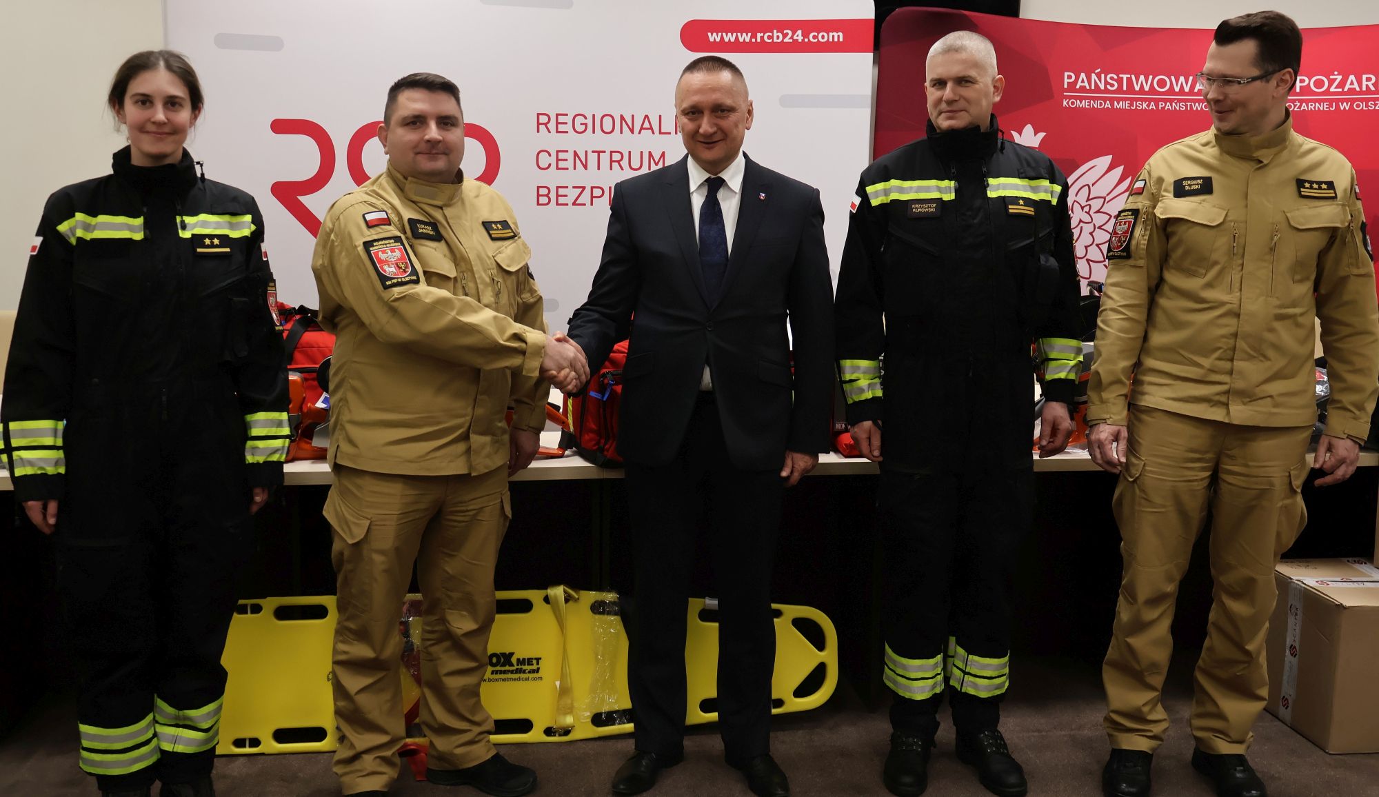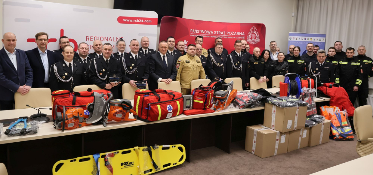W dniu 13 marca 2024 r. w Regionalnym Centrum Bezpieczeństwa w Olsztynie przy ul. Augustowskiej 44 odbyło się uroczyste przekazanie specjalistycznego sprzętu jednostkom OSP powiatu olsztyńskiego oraz nowych kombinezonów przeznaczonych dla Specjalistycznej Grypy Ratownictwa Chemiczno-Ekologicznego „Olsztyn” działającej w JRG1 Olsztyn. Sprzęt i umundurowanie zostało przekazane przez Starostę Olsztyńskiego Andrzeja Abako z zasobów Regionalnego Magazynu Kryzysowego (RMK), a zakupiony został w ramach Projektu „Bezpieczny MOF” (Miejski Obszar Funkcjonalny).