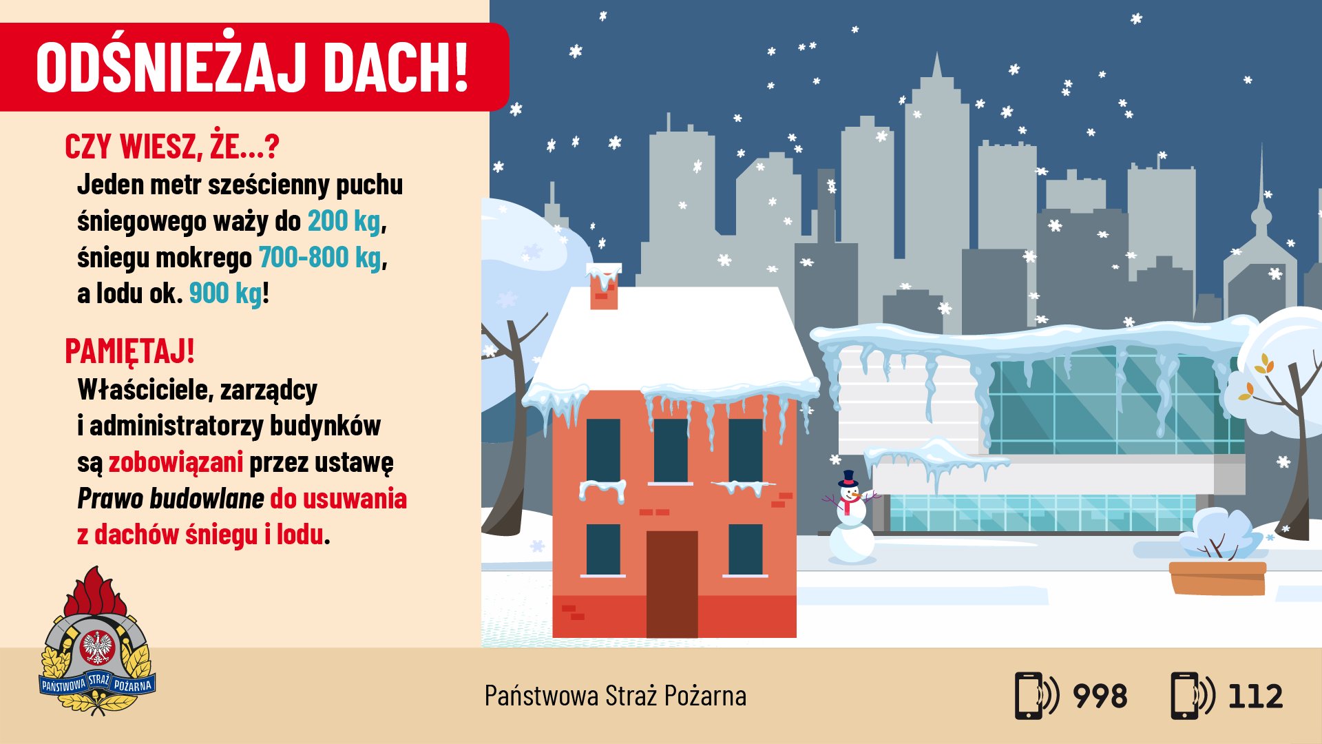 Przypominamy, że zgodnie z ustawą z dnia 7 lipca 1994 r. Prawo budowlane art. 61, pkt 2, obowiązek odśnieżania dachów i usuwania nawisów śniegu i lodu, spoczywa na właścicielach, zarządcach i administratorach obiektów. Szczególna uwaga skierowana jest na bezpieczeństwo obiektów handlowych i użyteczności publicznej.
