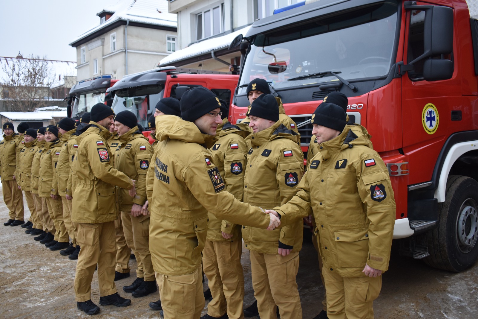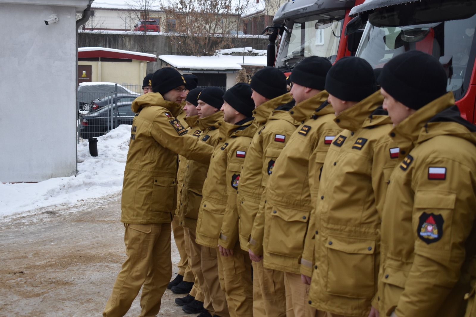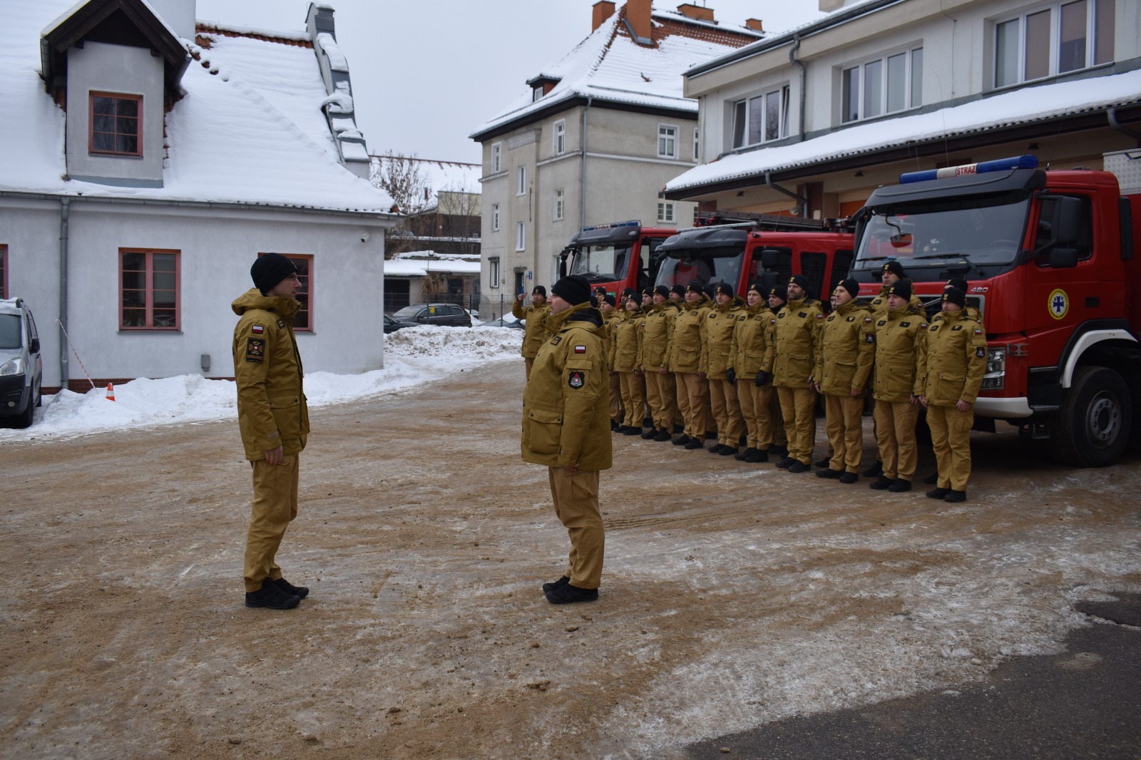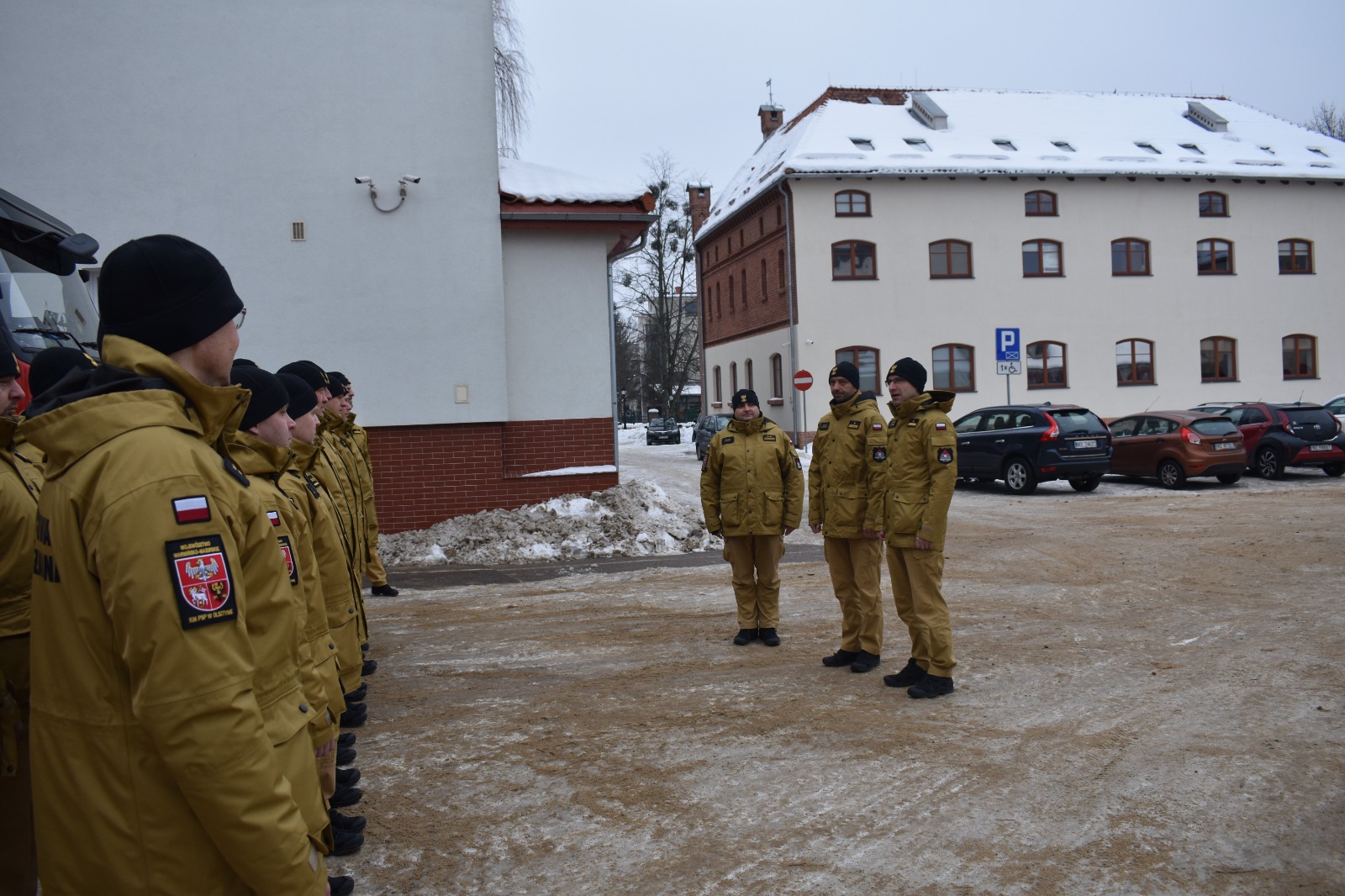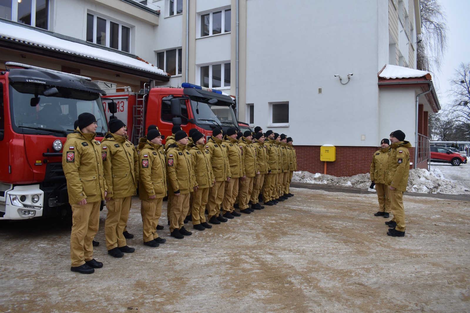 Po meldunku złożonym przez Komendanta Miejskiego PSP w Olsztynie bryg. Łukasza Jasińskiego, Komendant Główny PSP nadbryg. Wojciech Kruczek przywitał się z pododdziałem funkcjonariuszy z KM PSP Olsztyn, którzy ustawili się na tle garażu i pojazdów Jednostki Ratowniczo-Gaśniczej nr 1 Olsztynie.