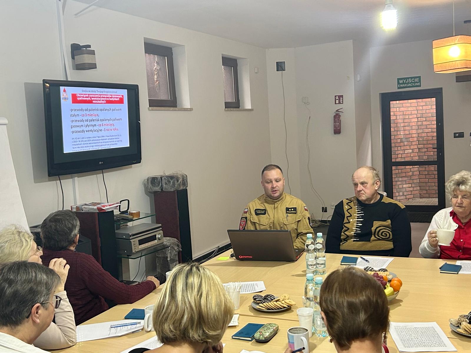 Głównym tematem spotkania było omówienie zagrożeń związanych z niewłaściwym użytkowaniem pieców na paliwo stałe lub gazowe oraz nieprawidłowym korzystaniem z przewodów kominowych i wentylacyjnych. Przedstawiono przyczyny powstawania sytuacji podczas których dochodzi do zatrucia tlenkiem węgla, jak im zapobiegać oraz jak postępować w przypadku zagrożenia związanego z jego emisją. Omówiono również zagrożenia związane z nagromadzeniem sadzy w przewodach kominowych.