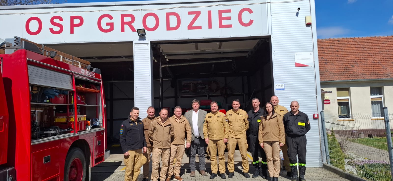 Kolejnym punktem wizyty było OSP Grodziec, gdzie komendantów powitał prezes, druh Sławomir Seweryn, wraz z miejscowymi strażakami. Spotkanie było okazją do zapoznania się z osiągnięciami jednostki, jej wyposażeniem oraz omówienia ewentualnych potrzeb i wyzwań stojących przed druhami z Grodźca.