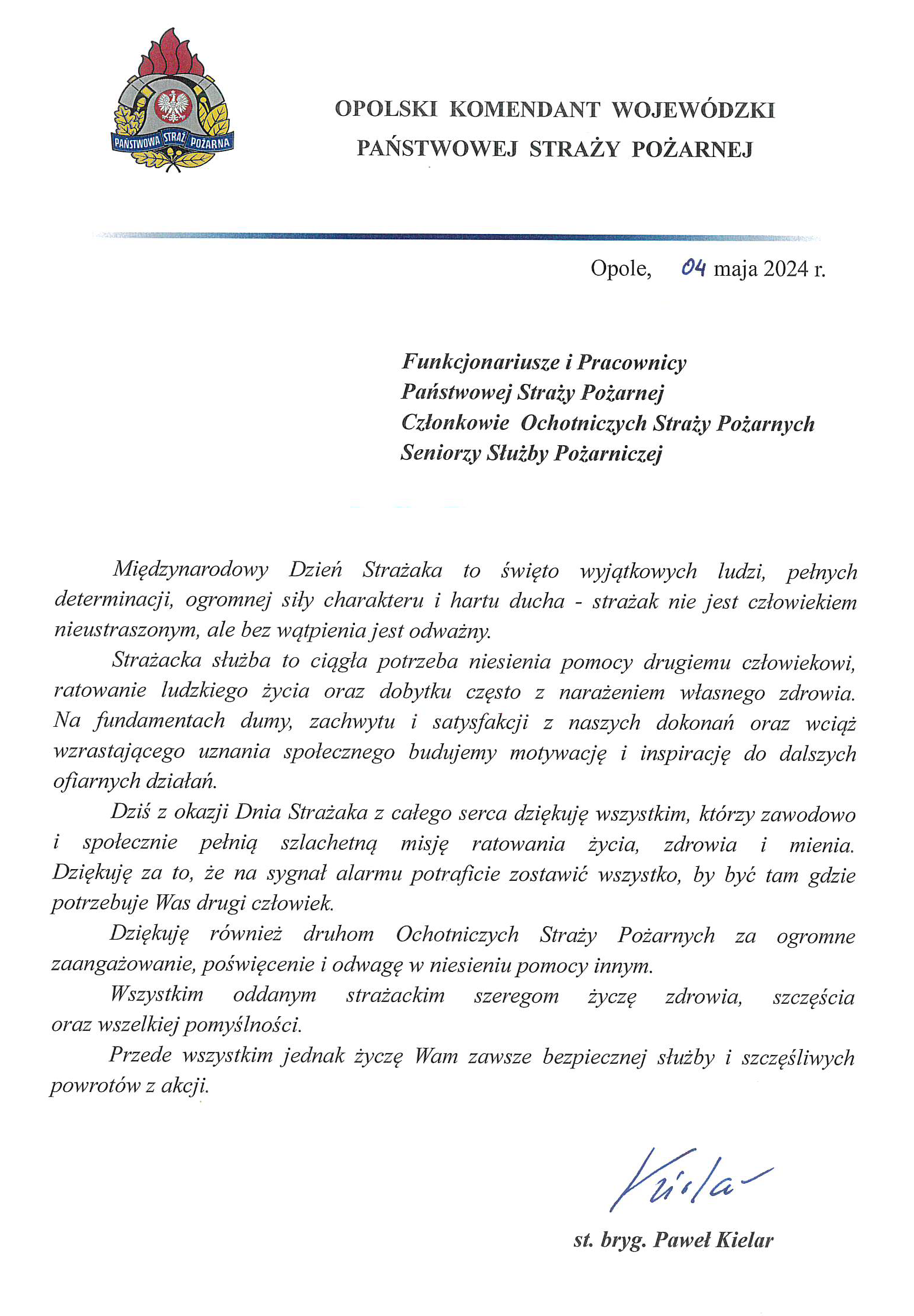 Życzenia Opolskiego Komendanta Wojewódzkiego Państwowej Straży Pożarnej z okazji Dnia Strażaka 2024