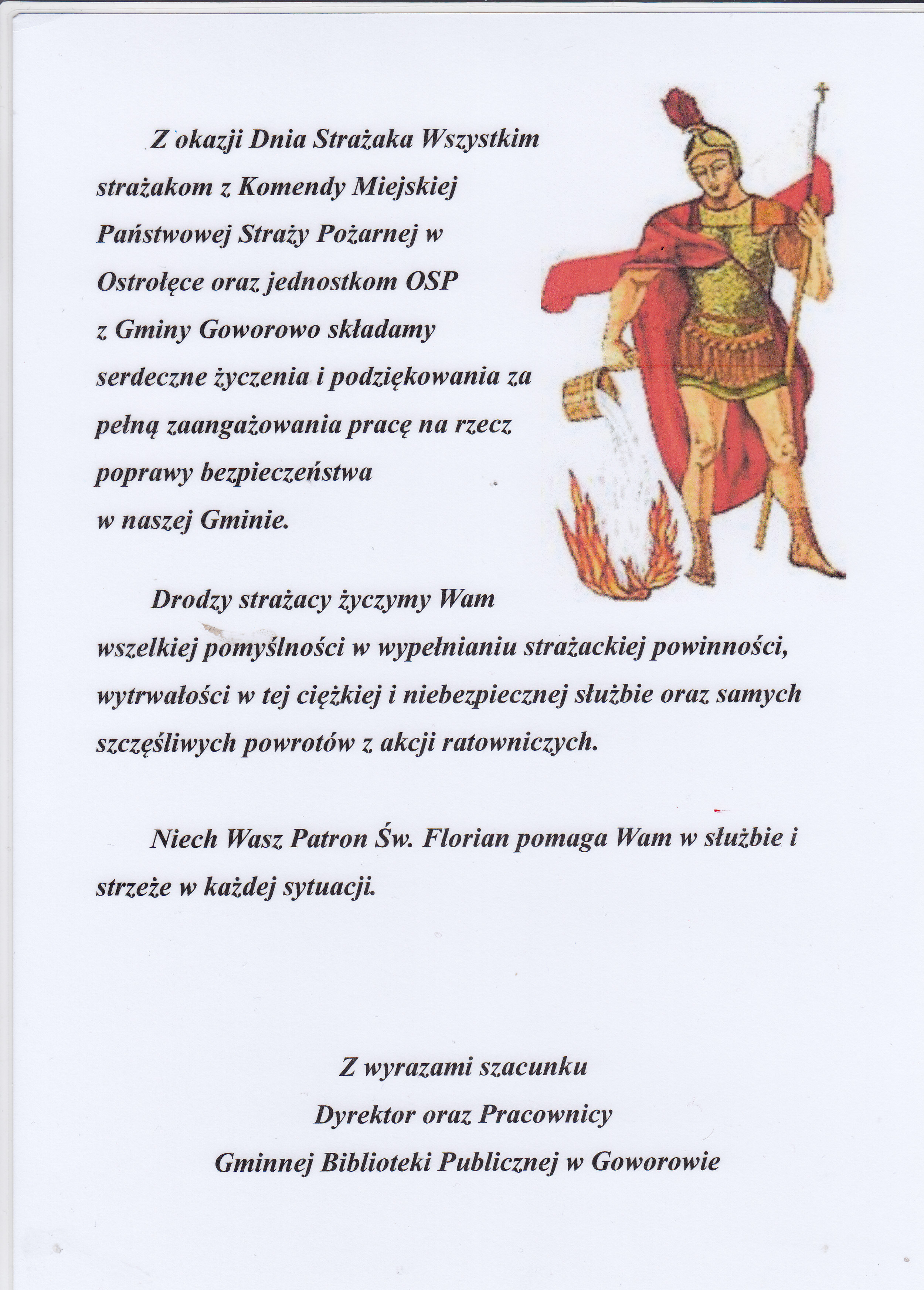 Życzenia napłynęły również z wyrazami szacunku od Dyrektora i pracowników z Gminnej Biblioteki Publicznej w Goworowie.