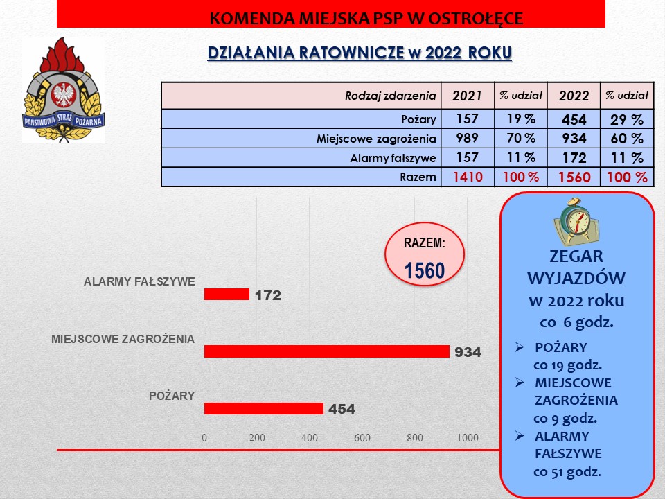 Komenda Miejska Państwowej Straży Pożarnej w Ostrołęce w roku 2022 odnotowała 1560 zdarzeń, co stanowi wzrost w porównaniu do roku poprzedniego o 150 interwencji (11%). Strażacy gasili pożary 454 razy czyli o 190 pożarów więcej (wzrost o 72%) niż w roku 2021 roku. Miejscowe zagrożenia odnotowano 934 razy, gdzie w roku 2021 było ich 989 co stanowi spadek o 55 (6%). Nieznacznie wzrosła liczba alarmów fałszywych ze 157 (2021) do 172 (2022). Najwięcej zdarzeń zanotowano w m. Ostrołęka – 439 oraz gminach: Goworowo – 153, Olszewo Borki – 144 i Rzekuń - 141, a najmniej w gminie Czarnia – 41 i Troszyn - 67. W roku 2022 ofiar śmiertelnych było 26 w tym trzy w pożarach w budynków mieszkalnych, a poszkodowanych osób było 82. Analogicznie w roku 2021, śmierć poniosło 22 osoby, a rannych zostało 165 osób.