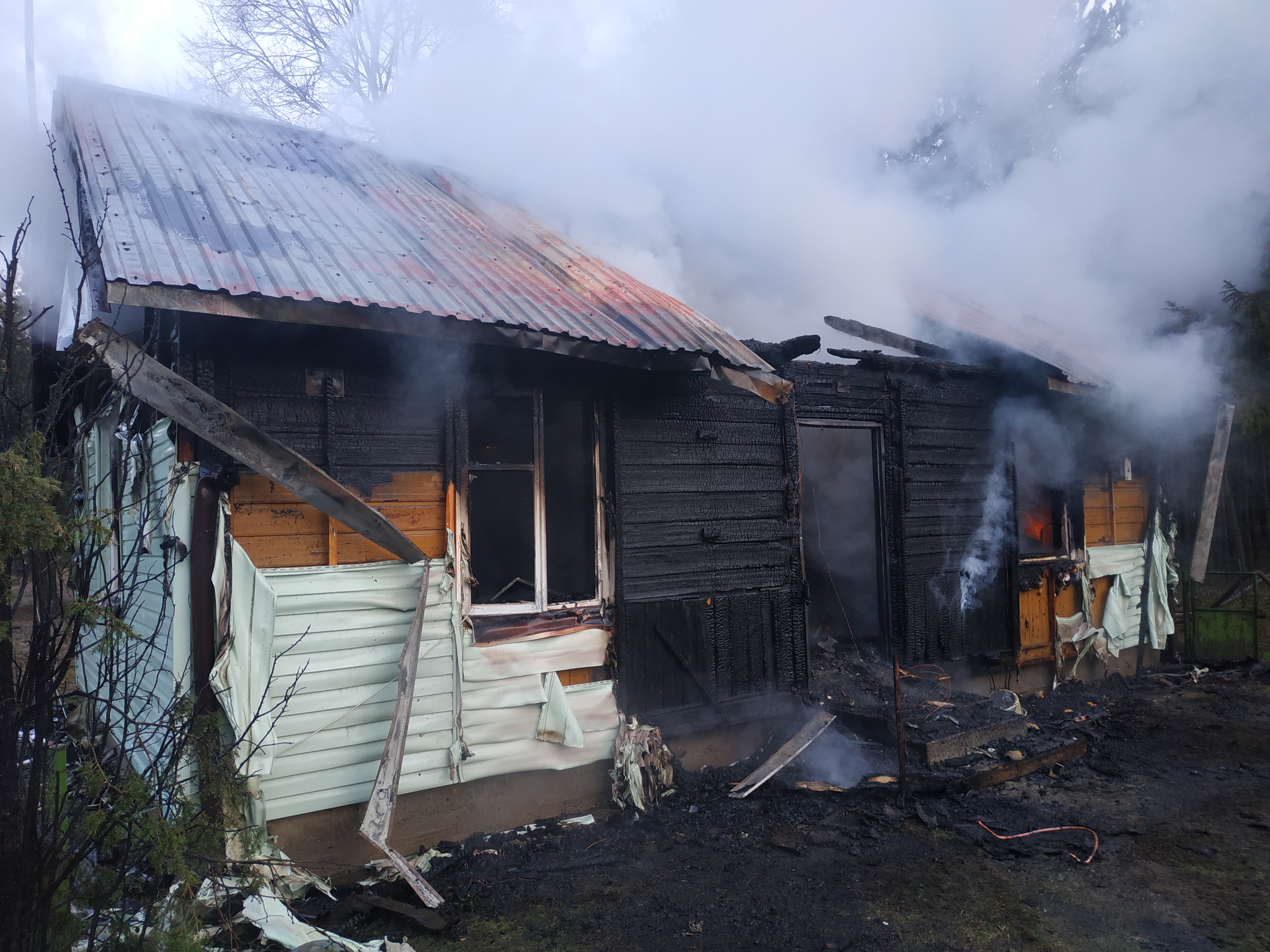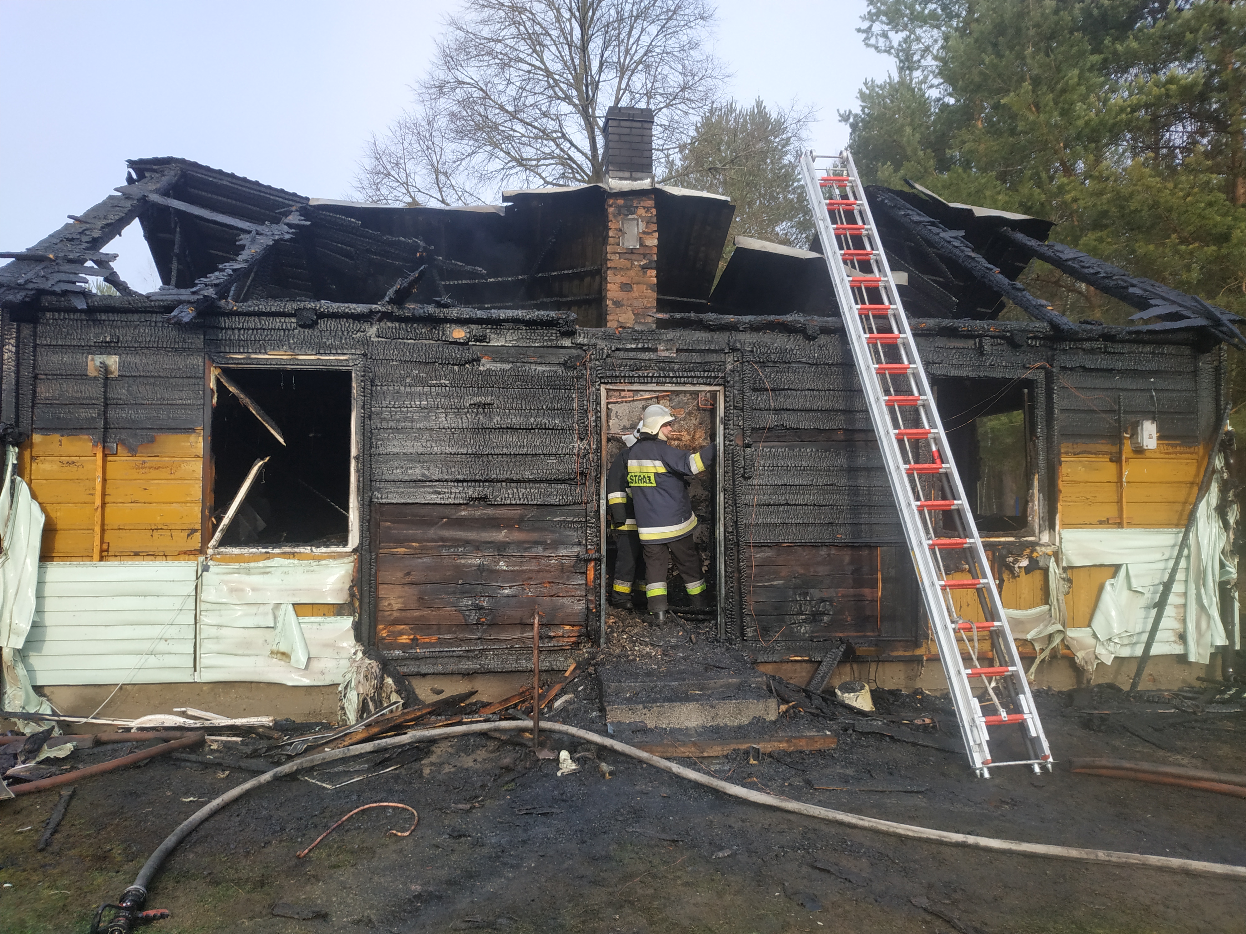 Po przybyciu kolejnych zastępów i podaniu kolejnych prądów wody, przygaszono pożar przystępując do przeszukania palącego się budynku. Niestety w środku odnaleziono ciało kobiety (91 lat) i mężczyzny (58 lat), ciała częściowo zwęglone, brak funkcji życiowych. Dalsze działania polegały na dogaszeniu pożaru oraz oddymieniu budynku. W celu wykluczenia zagrożenia, budynek sprawdzono kamerą termowizyjną. Przypuszczamy, że prawdopodobną przyczyną tego tragicznego pożaru mogło być zwarcie instalacji elektrycznej. Spaleniu uległo wnętrze budynku z wyposażeniem oraz dach. Straty oszacowano na kwotę kilkudziesięciu tys. zł.