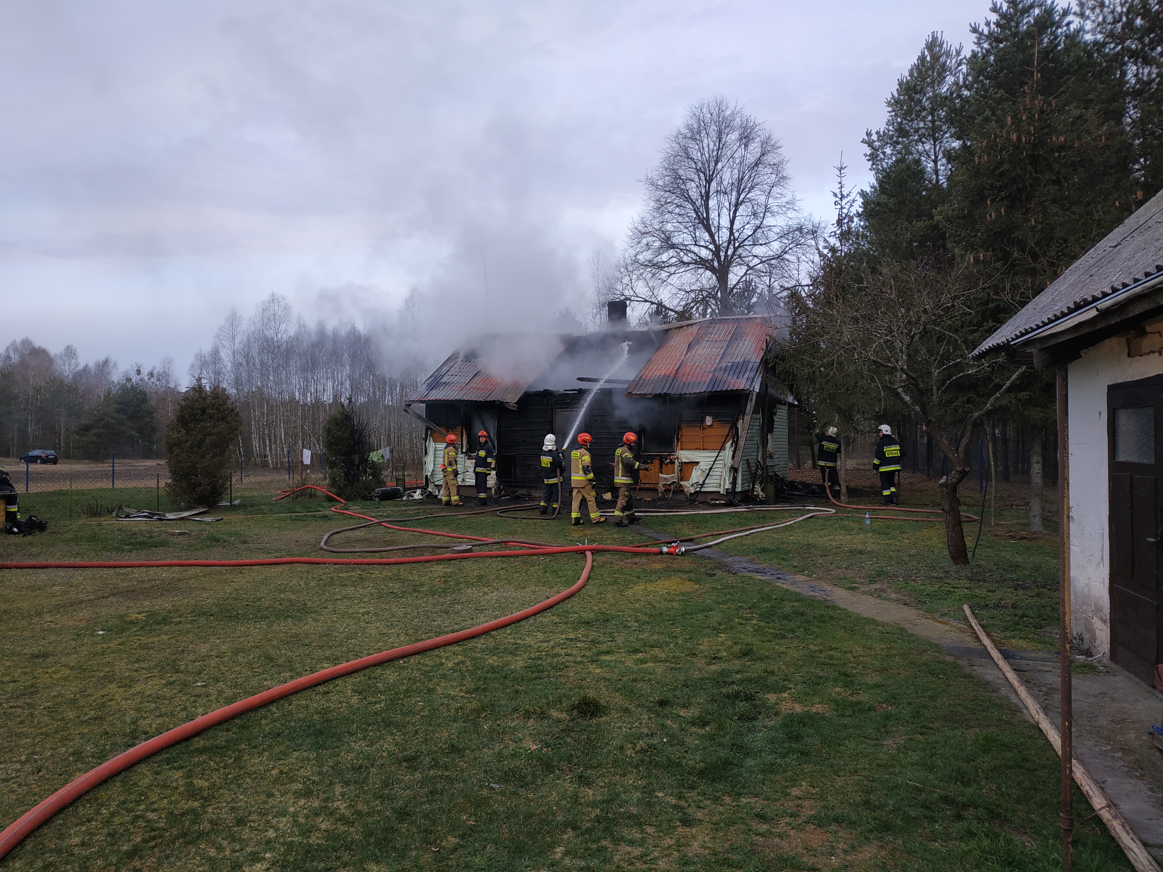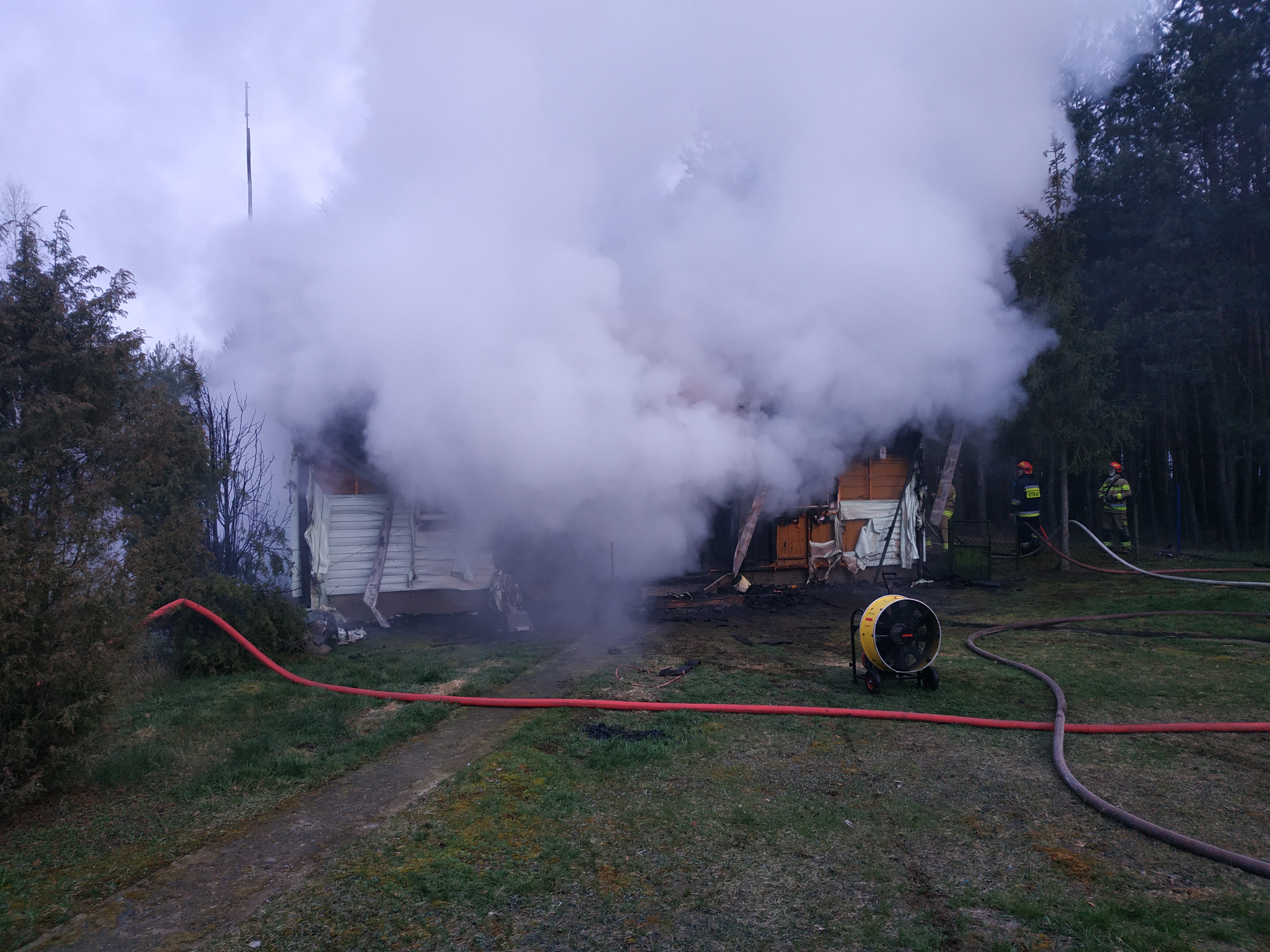 Przybyłe na miejsce zdarzenia pierwsze zastępy staży pożarnej zastały drewniany budynek mieszkalny w całości objęty pożarem. Przez otwory okienne i drzwiowe wydobywały się płomienie. Strażacy otrzymali również informację, że w płonącym budynku znajdują się dwie osoby. Niestety pożar w fazie rozwiniętej uniemożliwiał strażakom wejście do wnętrza budynku.
