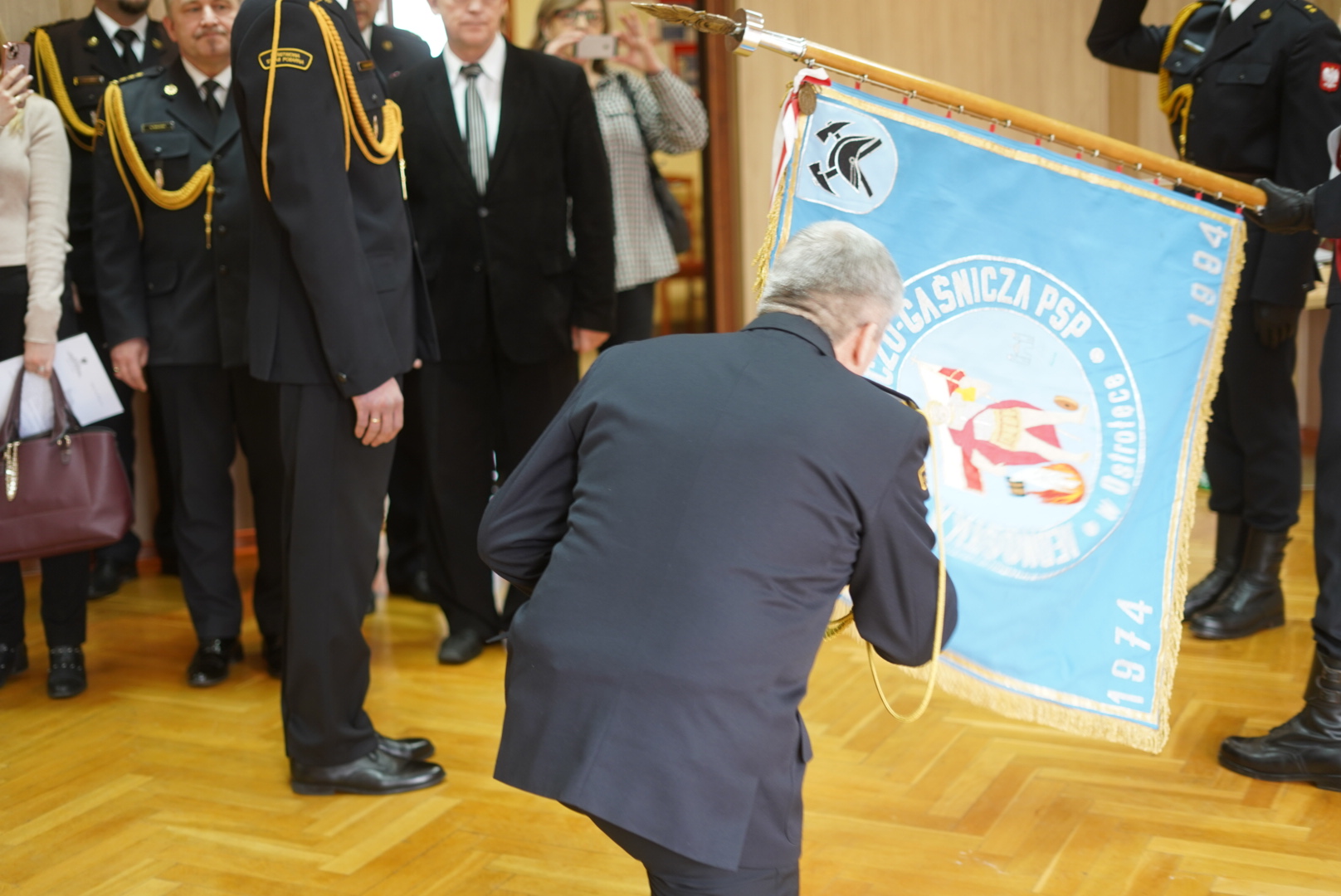 Kulminacyjnym punktem uroczystości było pożegnanie ze sztandarem zdającego obowiązki Komendanta Miejskiego PSP w Ostrołęce st. bryg. Grzegorza Pragacza.
