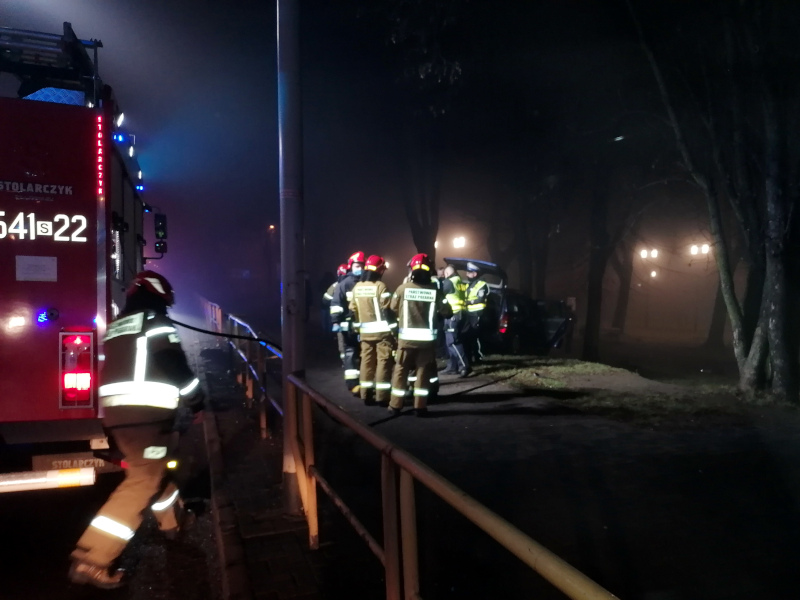 Po dojeździe na miejsce zdarzenia i przeprowadzeniu rozpoznania Kierujący Działaniami Ratowniczymi potwierdził, że samochód uderzył w barierki, a następnie w drzewo. Nie stwierdzono oznak pożaru. Kierujący i jego pasażer, w chwili przybycia zastępów straży pożarnej na miejsce zdarzenia znajdowali się poza pojazdem. Wraz z zastępami straży pożarnej przybył zespół ratownictwa medycznego, którego ratownicy po przebadaniu poszkodowanych zadecydowali o zabraniu poszkodowanych do Wojewódzkiego Szpitala Chirurgii Urazowej w Piekarach Śląskich.
