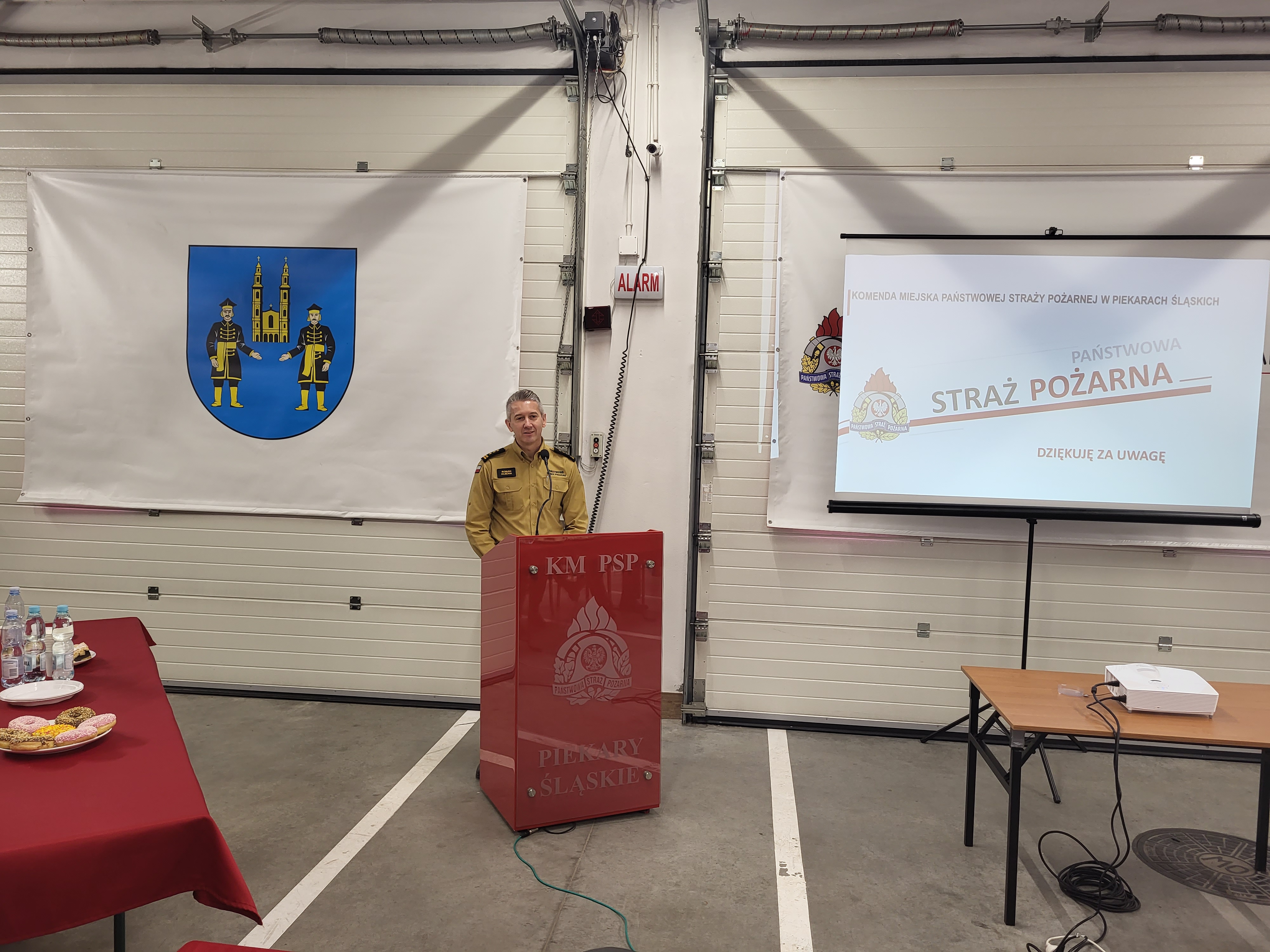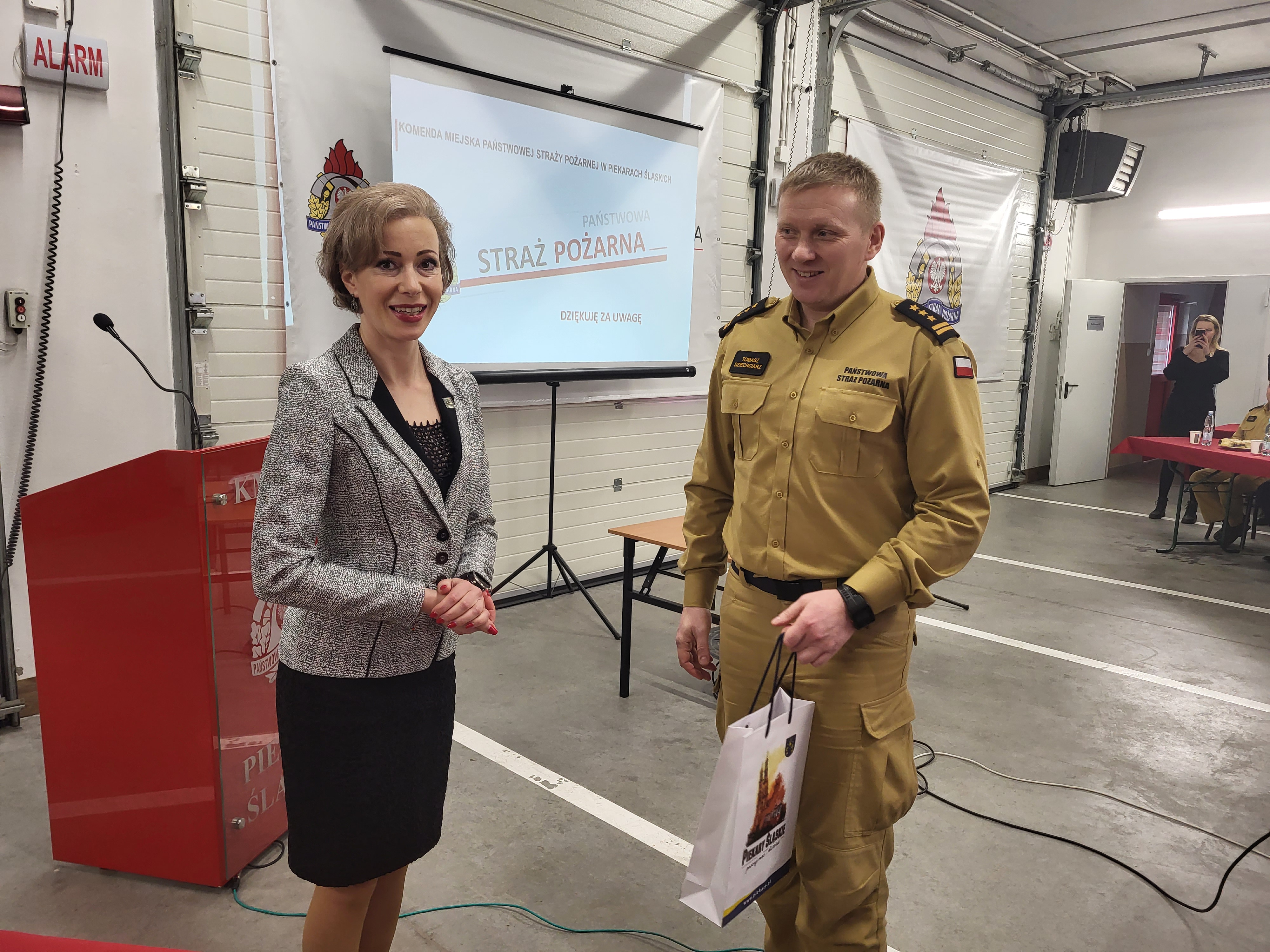 Następnie Komendant Miejski PSP w Piekarach Śląskich st. bryg. Tomasz Dziechciarz podziękował Posłom na Sejm RP Panu Łukaszowi Ściebiorowskiemu oraz Panu Jerzemu Polaczkowi, Zastępcy Śląskiego Komendanta Wojewódzkiego PSP st. bryg. Romanowi Klecha oraz Prezydent Piekar Śląskich Pani Sławie Umińskiej - Kajdan za okazane wsparcie oraz pomoc w realizacji wszelkich przedsięwzięć w Komendzie Miejskiej PSP w Piekarach Śląskich, a także podziękował za współpracę Komendantowi Miejskiemu Policji w Piekarach Śląskich oraz Komendantowi Straży Miejskiej i Zarządzania Kryzysowego w Piekarach Śląskich.