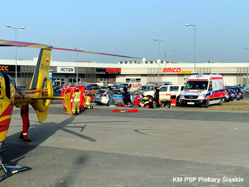 Po przybyciu na miejsce zdarzenia kierujący działaniami ratowniczymi potwierdził obecność na miejscu zespołu ratownictwa medycznego (ZRM), którego ratownicy prowadzili reanimację mężczyzny. Ratownicy zadysponowali śmigłowiec Lotniczego Pogotowia Ratunkowego. Kierujący działaniami ratowniczymi niezwłocznie polecił wyznaczyć dogodne miejsce na terenie parkingu centrum handlowego, do przyjęcia zadysponowanego śmigłowca.