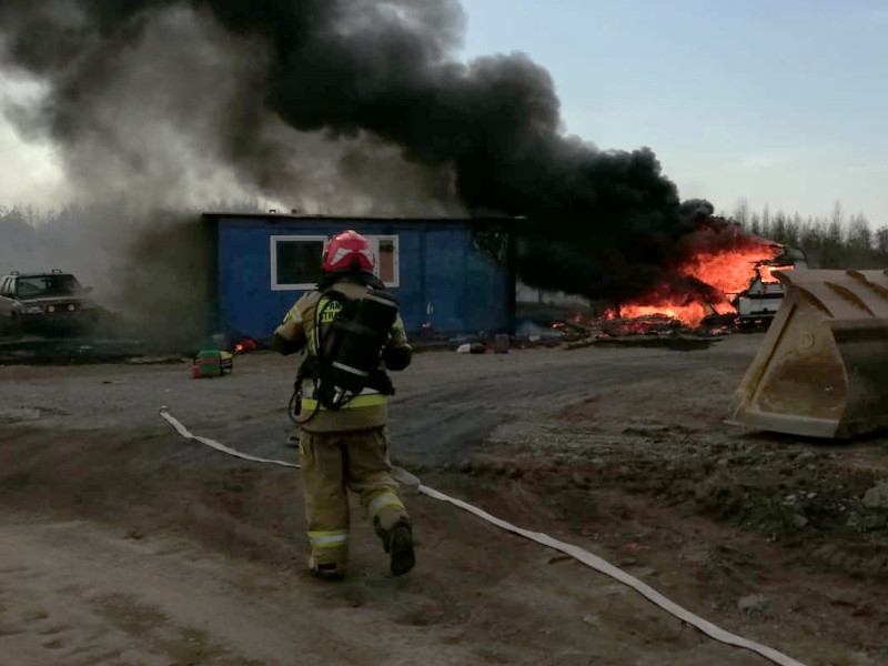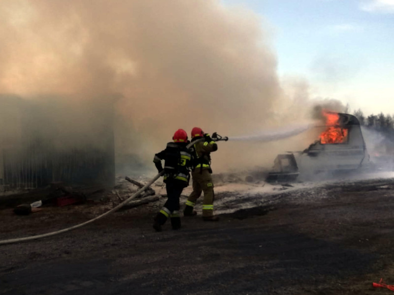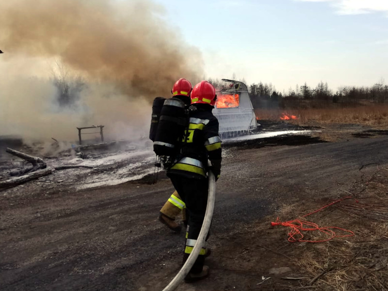 Działania straży pożarnej polegały na zabezpieczeniu miejsca zdarzenia, ugaszeniu palącej się przyczepy podając jeden prąd piany w natarciu, ugaszeniu palącego się barakowozu podając jeden prąd wody w natarciu, ugaszeniu palącej się trawy przy pomocy tłumic oraz jednego prądu wody, sprawdzeniu przy pomocy kamery termowizyjnej pogorzeliska, jego przelaniu oraz zabezpieczaniu.