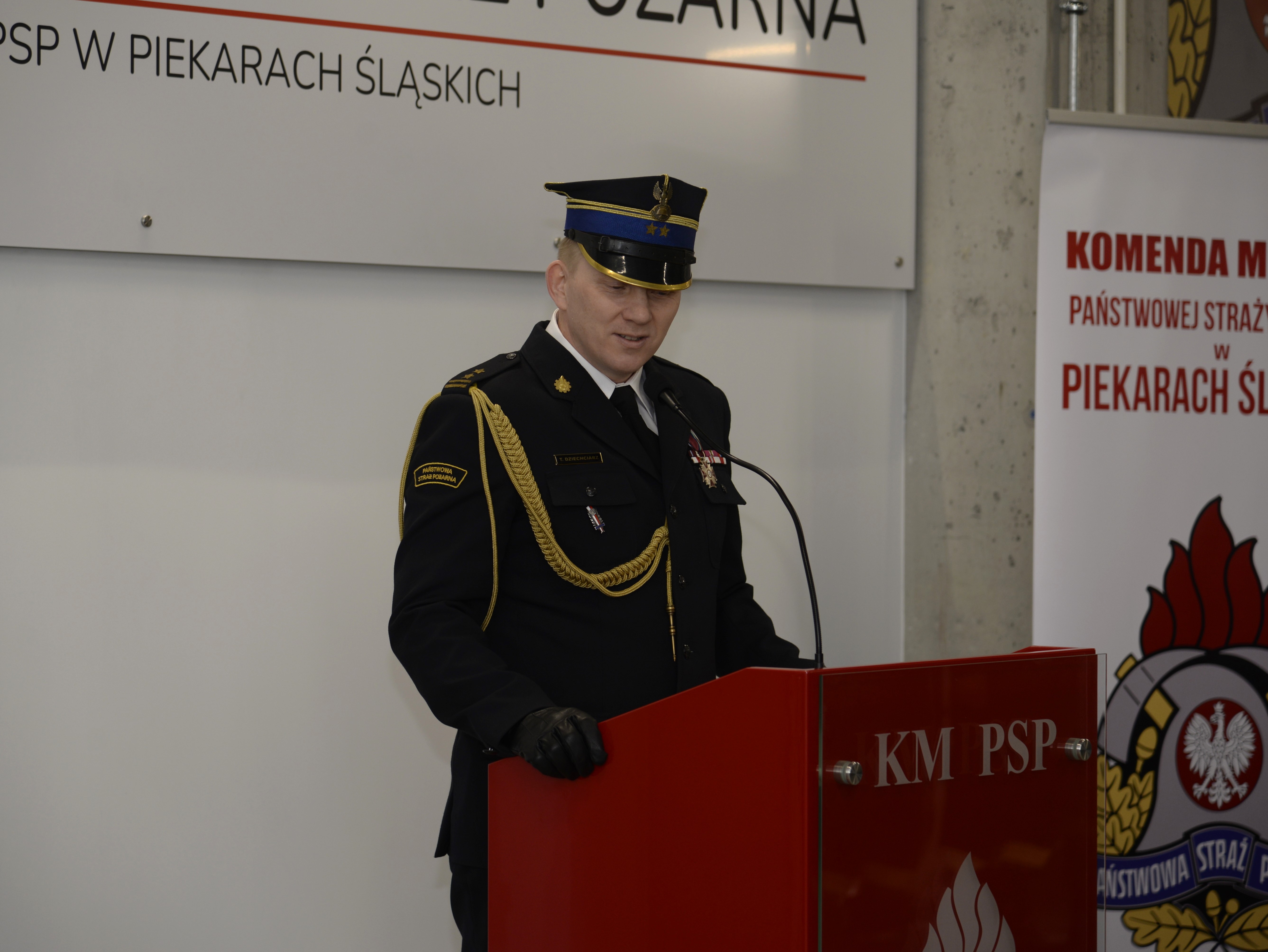 Zbiórkę rozpoczęło złożenie meldunku przez Zastępcę Dowódcy Jednostki Ratowniczo - Gaśniczej w Piekarach Śląskich mł. kpt. Roberta Gubałę Komendantowi Miejskiemu Państwowej Straży Pożarnej w Piekarach Śląskich bryg. Tomaszowi Dziechciarzowi. Po przyjęciu meldunku głos zabrał komendant miejski, który w swoim przemówieniu przypomniał przebieg służby bryg. Adriana Patalonga w Państwowej Straży Pożarnej, podkreślił jego zasługi oraz dokonania mające wpływ na rozwój piekarskiej komendy oraz podziękował za jego trud i zaangażowanie w zapewnieniu właściwego funkcjonowania komendy miejskiej oraz jednostki ratowniczo - gaśniczej. Przypomniał ponadto, że w życiu strażaka jest wiele pięknych, niezapomnianych chwil, z których jedną jest moment przyjęcia do służby, a druga, którą pamięta się przez całe życie to pożegnanie ze służbą. Następnie głos zabrał odchodzący na zaopatrzenie emerytalne dowódca jednostki ratowniczo - gaśniczej, który w swoich słowach podziękował kierownictwu komendy, swojemu zastępcy oraz funkcjonariuszom i pracownikom cywilnym komendy za lata wspólnej służby. Z rąk komendanta miejskiego bryg. Adrian Patalong, od funkcjonariuszy i pracowników cywilnych komendy, otrzymał pamiątkową szablę. W uroczystej zbiórce wzięli udział przedstawiciele Wydziału Zarządzania Kryzysowego i Straży Miejskiej Urzędu Miasta w Piekarach Śląskich oraz druhowie Ochotniczej Straży Pożarnej w Brzezinach Śląskich.