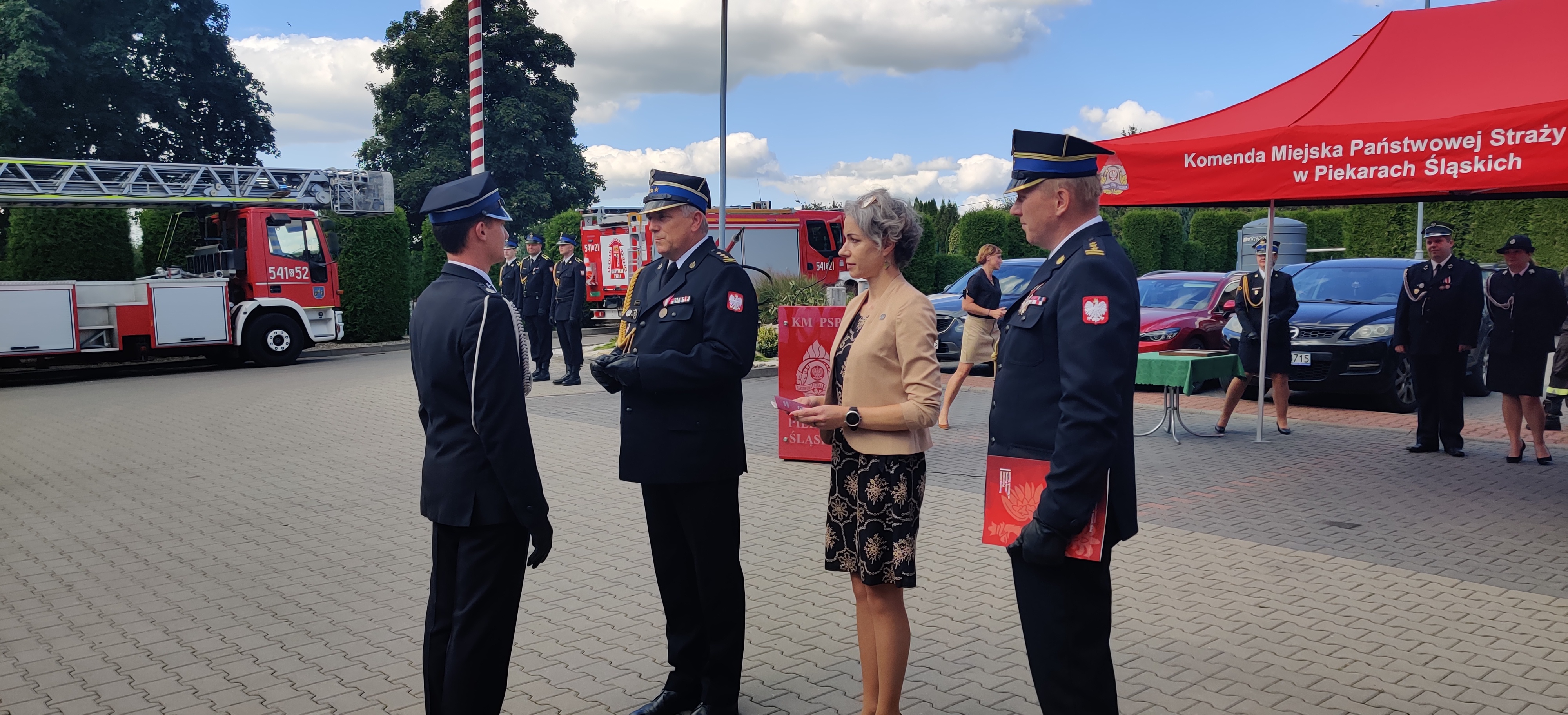 ponadto komendanci służb mundurowych, druhowie z terenu powiatu piekarskiego oraz członkowie Młodzieżowej Drużyny Pożarniczej z Ochotniczej Straży Pożarnej w Dąbrówce Wielkiej.