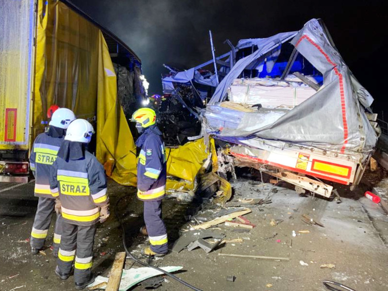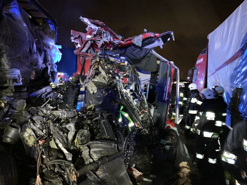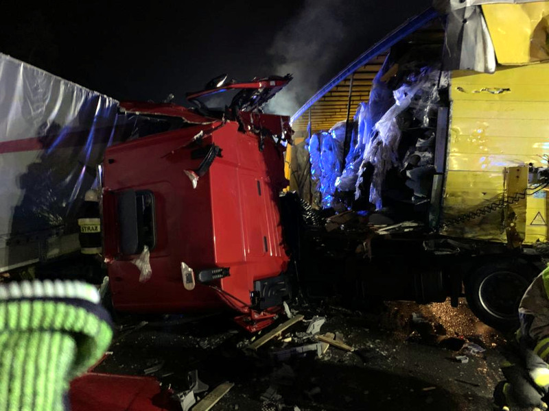 Z informacji uzyskanych przez KDR wynikało, że doszło do najechania na tył naczepy, stojącego na pasie awaryjnym, samochodu ciężarowego przez drugi samochód ciężarowy. W wyniki zdarzenia doszło do uszkodzenia ładunków znajdujących się na naczepach samochodów ciężarowych oraz do całkowitego zerwania kabiny w jednym z ciągników siodłowych. Okoliczności tego zdarzenia wyjaśnia policja.