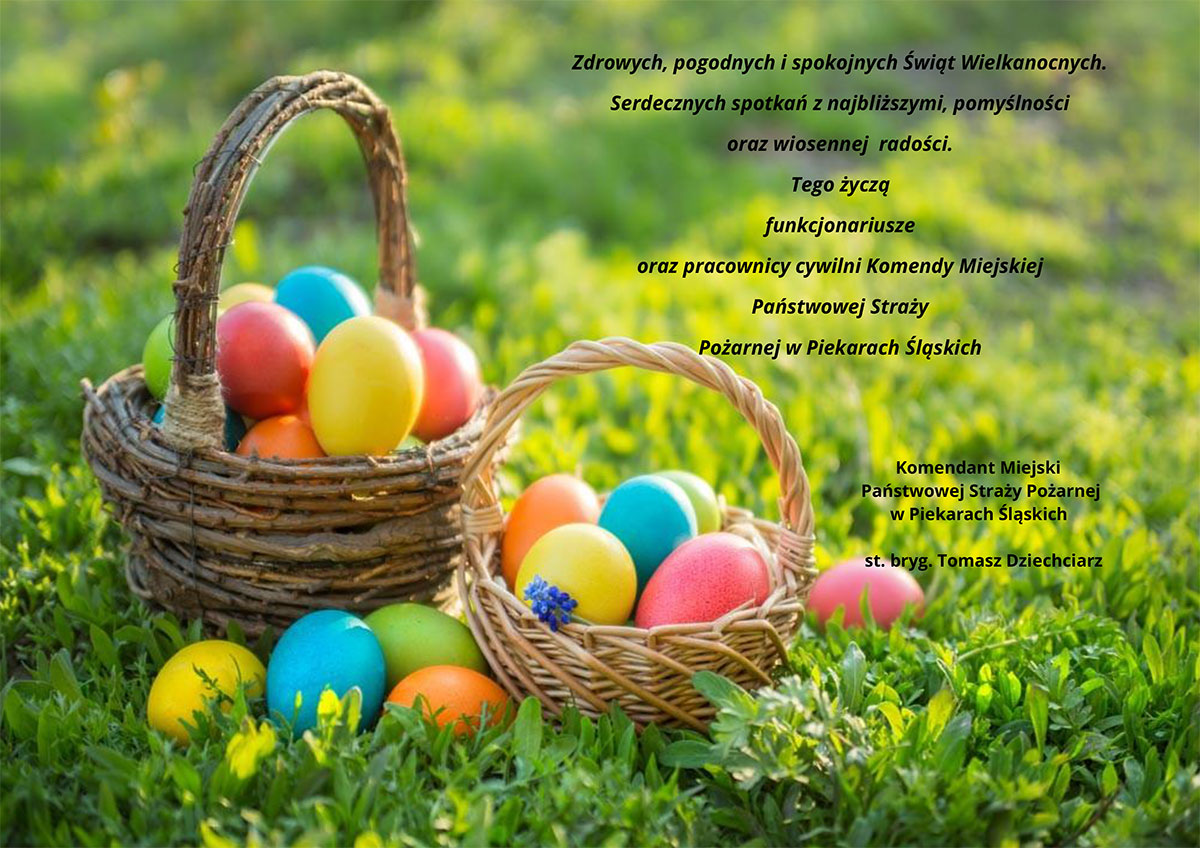 Widać dwa koszyki z kolorowymi pisankami na zielonej trawie