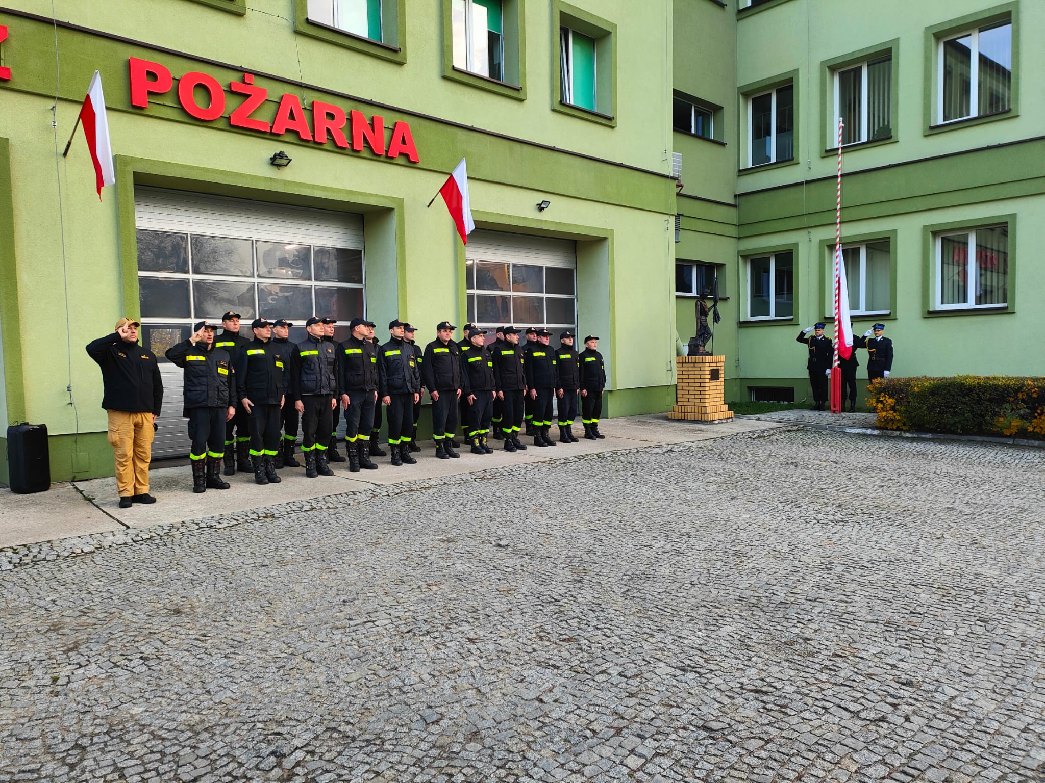 Z okazji Narodowego Święta Niepodległości w Komendzie Miejskiej Państwowej Straży Pożarnej w Piotrkowie Trybunalskim miała miejsce uroczysta zmiana służby, podczas której podniesiono flagę państwową na maszt.