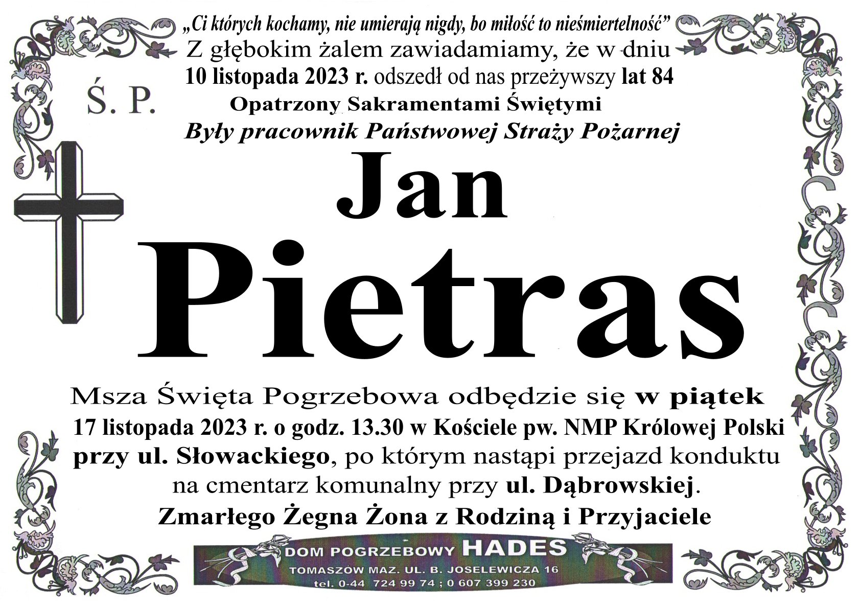 Z głębokim smutkiem przyjęliśmy informację, że w dniu 10 listopada 2023 r. zmarł pułk. poż. w st.spocz. Jan Pietras - Komendant Wojewódzki Straży Pożarnych w Piotrkowie Trybunalskim w latach 1989-1992.